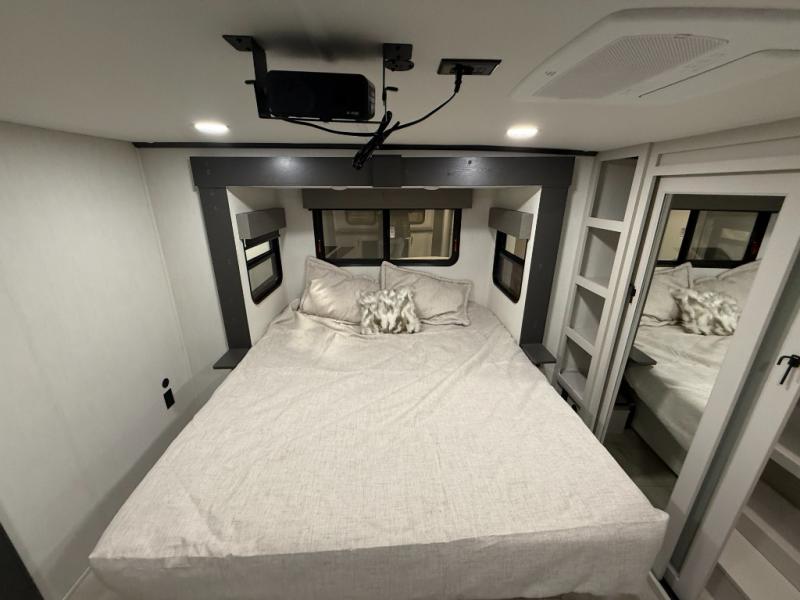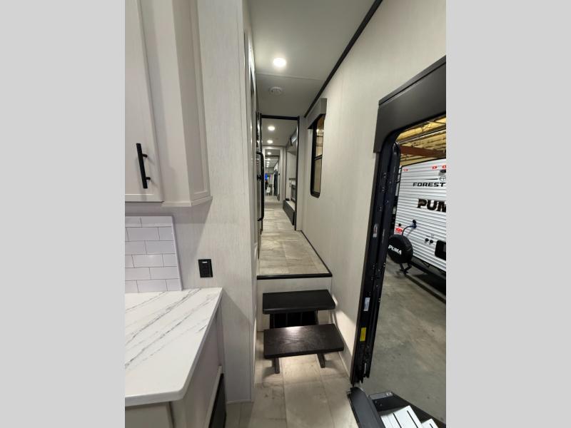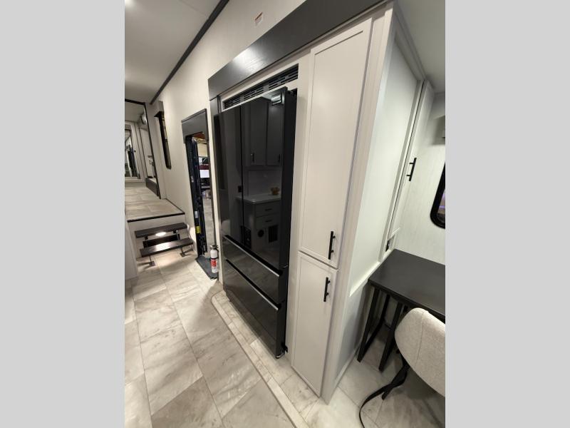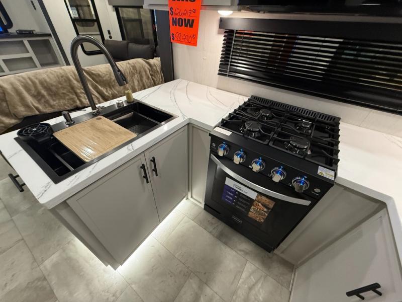 This fifth wheel is designed for comfort and making memories. The main living area is the perfect spot to relax and unwind, featuring a spacious sleeper sectional sofa with two recliners great for movie nights or just lounging around. A massive 70-inch 4K smart TV on a Televator lets you catch your favorite shows or stream the latest movies, the cozy 60-inch fireplace adds the perfect ambiance after a day full of adventure. Whether you're gathering for a meal or checking emails, the space-saving desk/dinette offers versatility for your activities. The middle U-shaped kitchen provides plenty of prep space and includes a pull-out pantry to keep all your snacks organized and within reach. Moving forward, the full bathroom features a dual vanity, allowing for two people to get ready at the same time. At the front, the private bedroom includes a spacious king-size bed, a generous closet for all your essentials, and stackable washer/dryer prep for added convenience on longer trips.