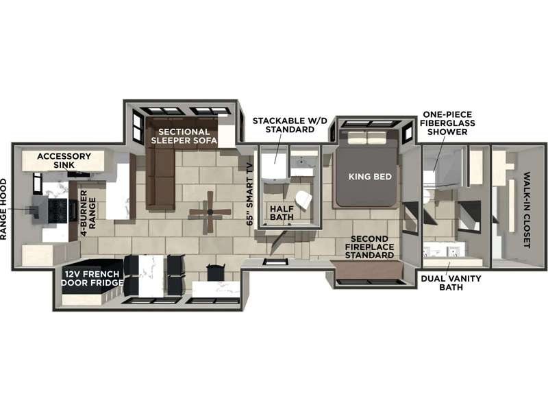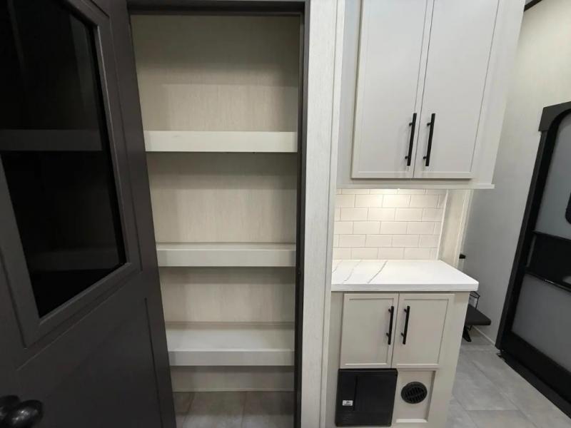 It will be so easy to enjoy extended stays or weekend trips in this spacious fifth wheel. You will love waking up in your private master bedroom that includes a king bed slide, bedroom wardrobe, and 40" TV. The front full bath includes dual bath sinks for added convenience and a large walk-in closet with clothes bars. If you have any guests stay over, they can sleep on the L-shaped easy glide sofa with a theater seat on one end. There is also a free-standing dinette with four chairs and a desk with a chair if you need to get some work done. The chef of your group will love the rear kitchen with a u-shaped counter, two kitchen pantries, and a 16 cu. ft. refrigerator for food storage. This model also includes a mid-coach half bath with washer and dryer prep if you choose to add those appliances!