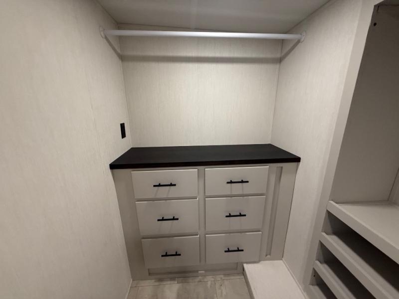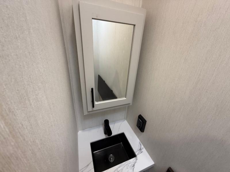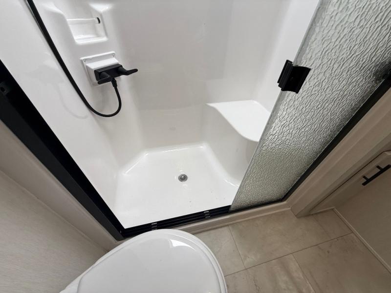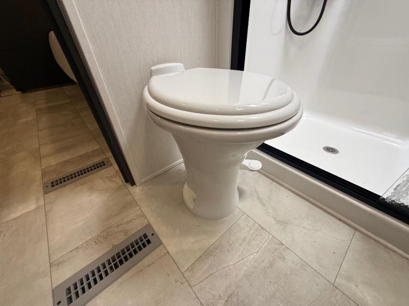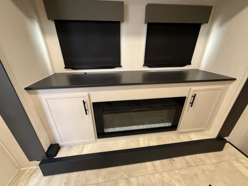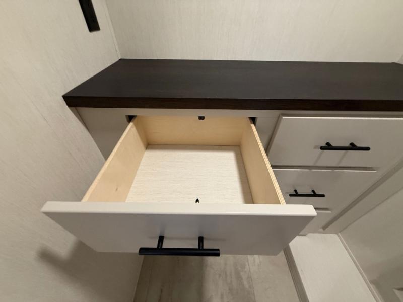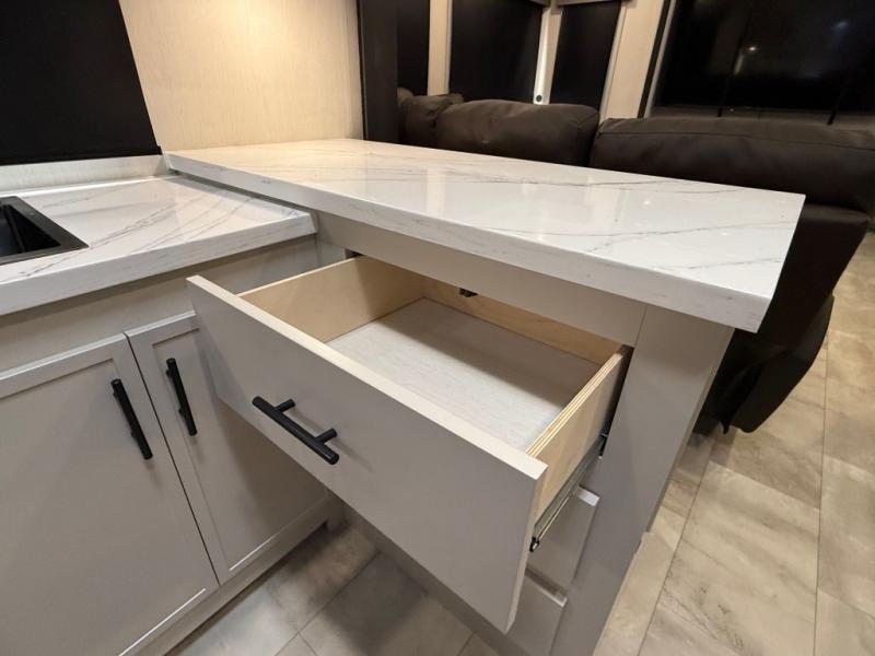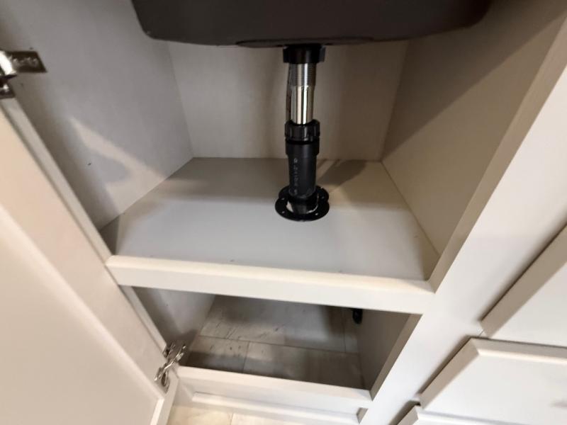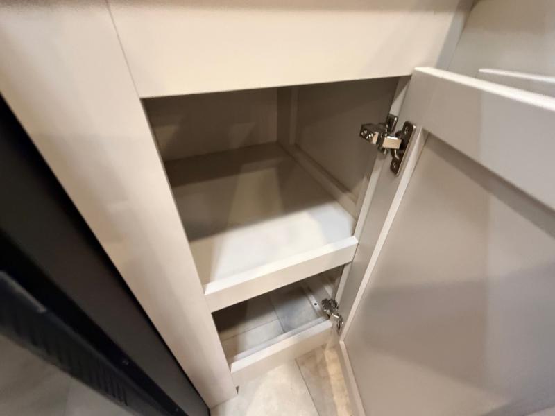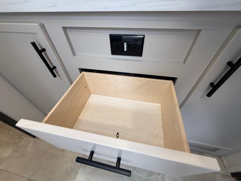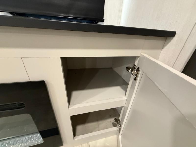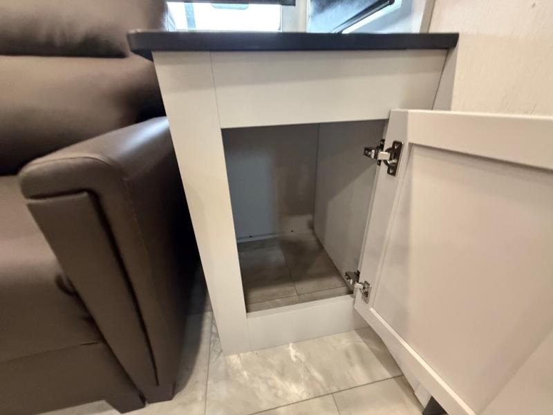 The Sanibel series stands out with a combination of unique and highly functional exterior and interior features designed for both convenience and durability. On the outside, a drop-frame pass-through storage area with a rubberized liner offers ample space while protecting your gear from moisture and wear. Setting up camp is effortless thanks to the one-touch auto-leveling system and rubberized suspension equalizer, which provide a smooth and stable foundation. Inside, comfort meets practicality with carpet less slides for easy cleaning and blackout roller shades for privacy and temperature control. The real wood cabinet doors and solid surface countertops add a touch of elegance, no matter where the road takes you.