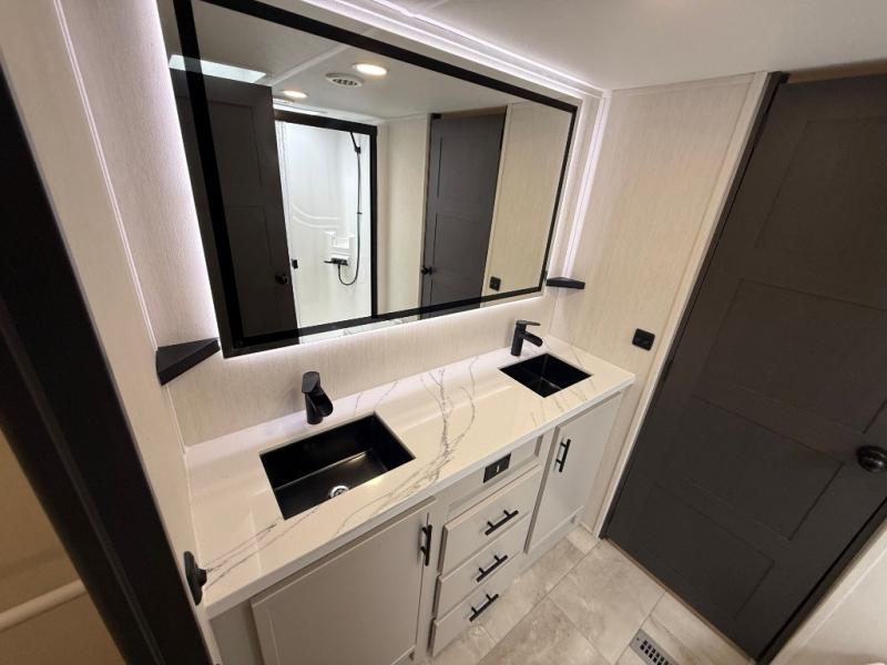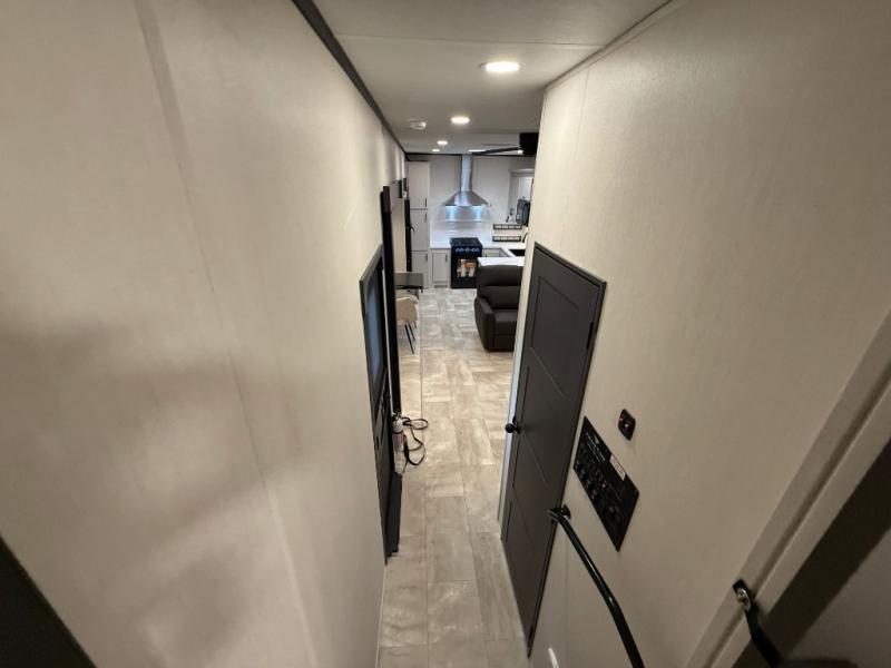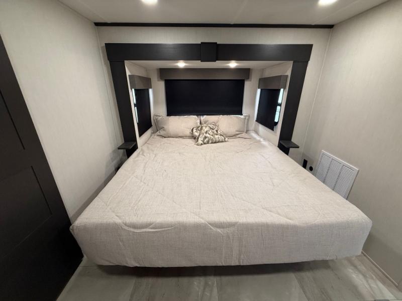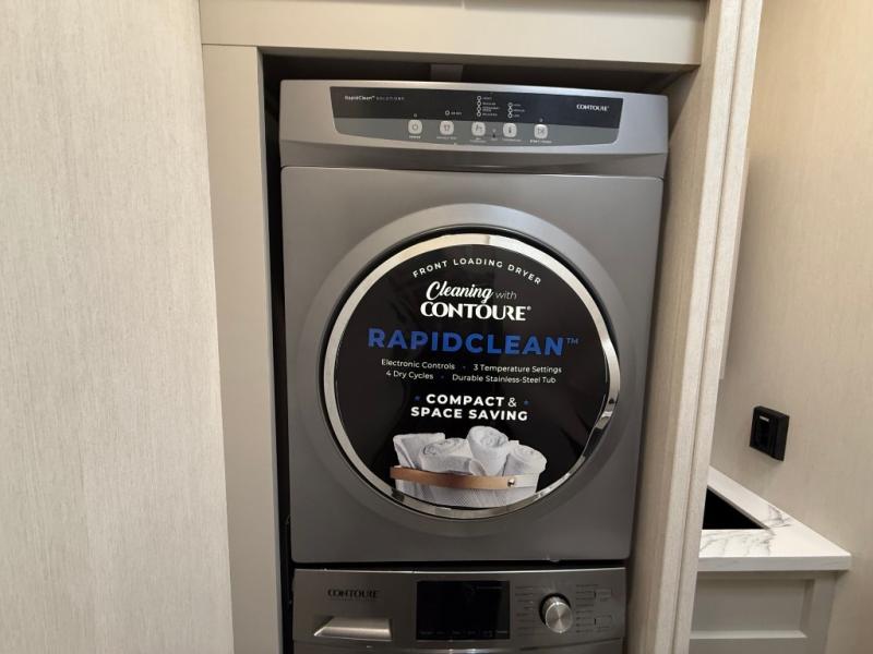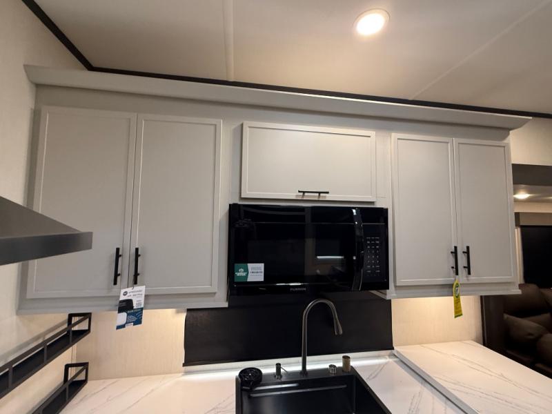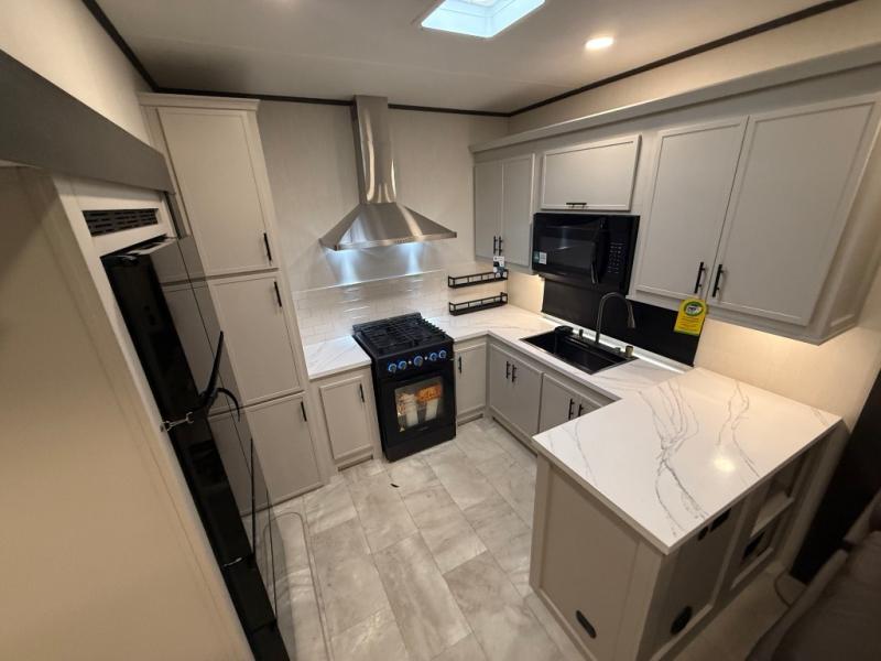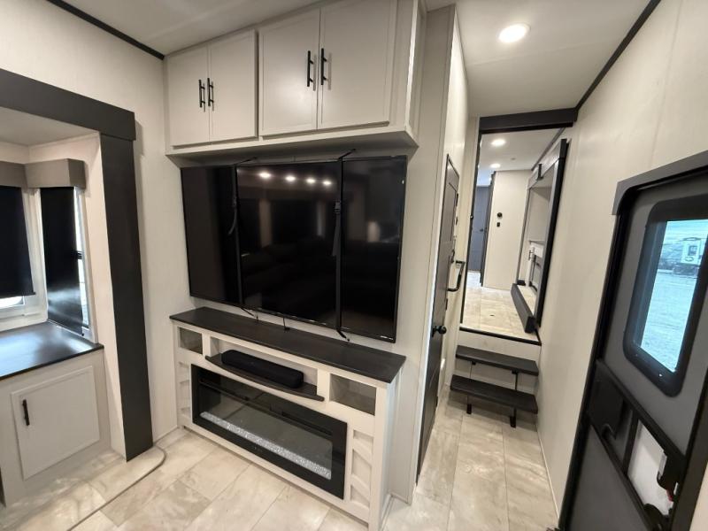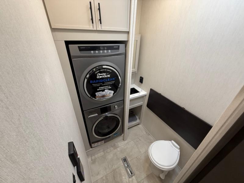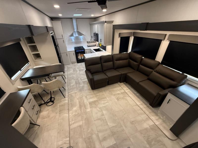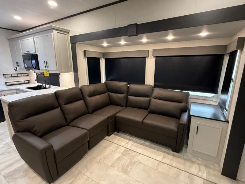 One of the standout features of the 38LAUNDRY fifth wheel is the convenient stackable washer and dryer located in the half bath, letting you take care of laundry right from the comfort of your trailer, no campground laundromat needed. After a day full of outdoor adventures, everyone can relax together in the spacious living room, which features a large sectional sleeper sofa perfect for movie nights or extra sleeping space. The equipped kitchen includes a four-burner range, giving the chef plenty of room to cook up delicious meals with ease. And when it's time to unwind, the private bedroom offers a peaceful retreat complete with a walk-through private bathroom featuring a dual vanity and a generous walk-in closet, ideal for storing all your clothes and camping gear.