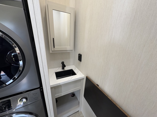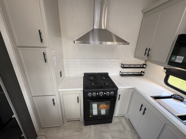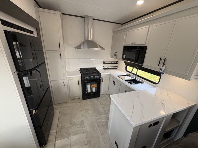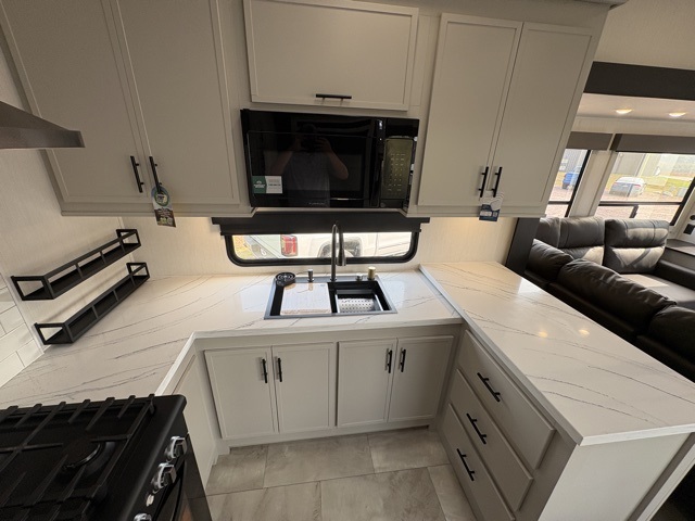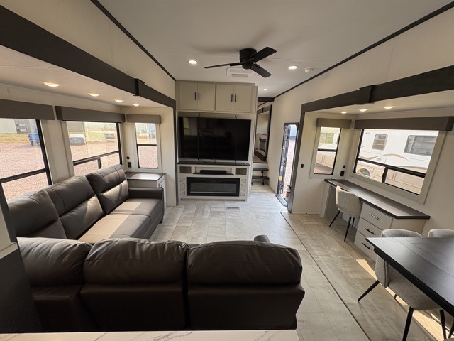 One of the standout features of the 38LAUNDRY fifth wheel is the convenient stackable washer and dryer located in the half bath, letting you take care of laundry right from the comfort of your trailer, no campground laundromat needed. After a day full of outdoor adventures, everyone can relax together in the spacious living room, which features a large sectional sleeper sofa perfect for movie nights or extra sleeping space. The equipped kitchen includes a four-burner range, giving the chef plenty of room to cook up delicious meals with ease. And when it's time to unwind, the private bedroom offers a peaceful retreat complete with a walk-through private bathroom featuring a dual vanity and a generous walk-in closet, ideal for storing all your clothes and camping gear.