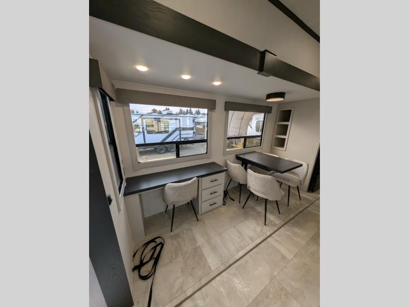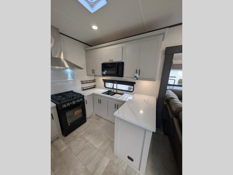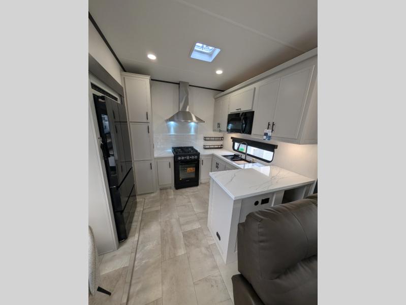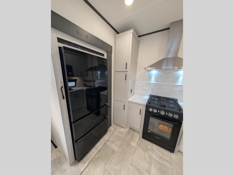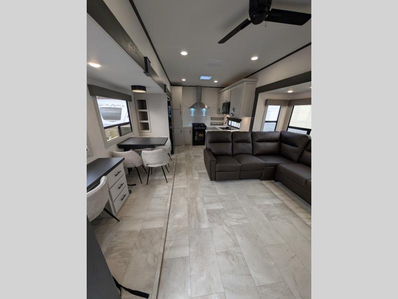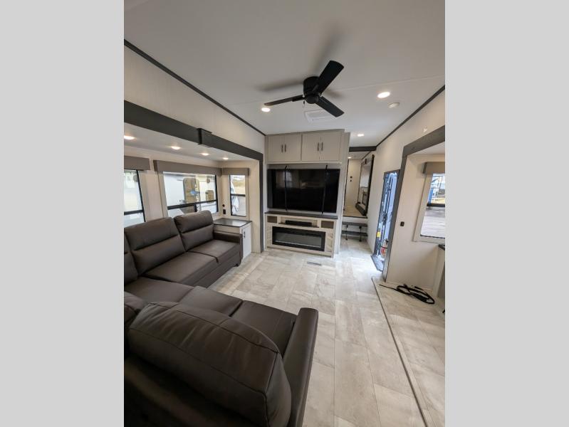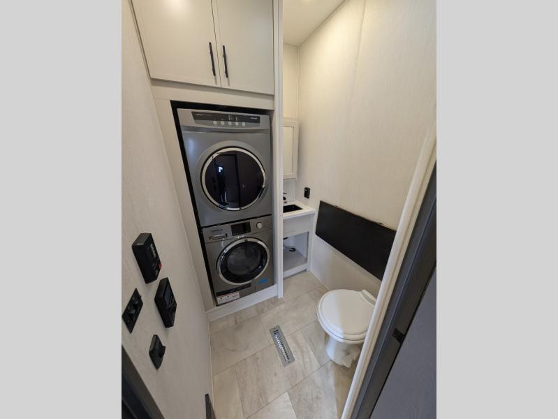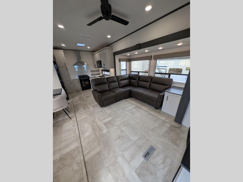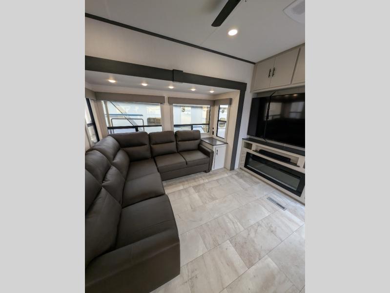 One of the standout features of the 38LAUNDRY fifth wheel is the convenient stackable washer and dryer located in the half bath, letting you take care of laundry right from the comfort of your trailer, no campground laundromat needed. After a day full of outdoor adventures, everyone can relax together in the spacious living room, which features a large sectional sleeper sofa perfect for movie nights or extra sleeping space. The equipped kitchen includes a four-burner range, giving the chef plenty of room to cook up delicious meals with ease. And when it's time to unwind, the private bedroom offers a peaceful retreat complete with a walk-through private bathroom featuring a dual vanity and a generous walk-in closet, ideal for storing all your clothes and camping gear.