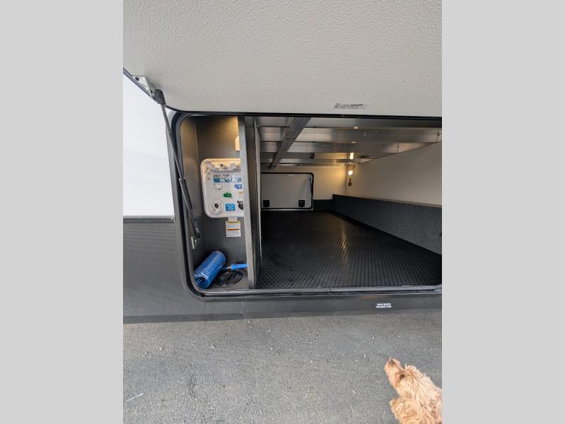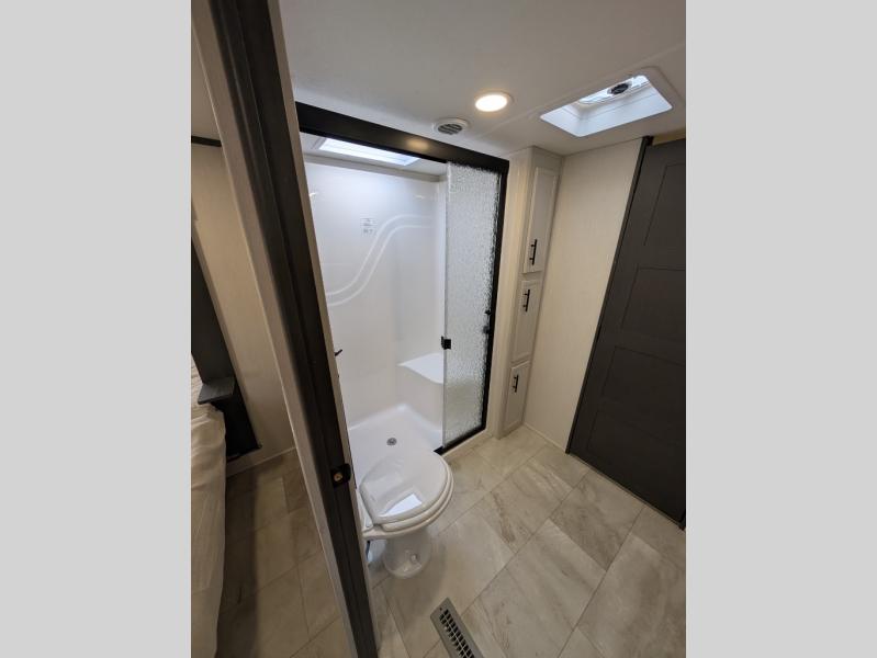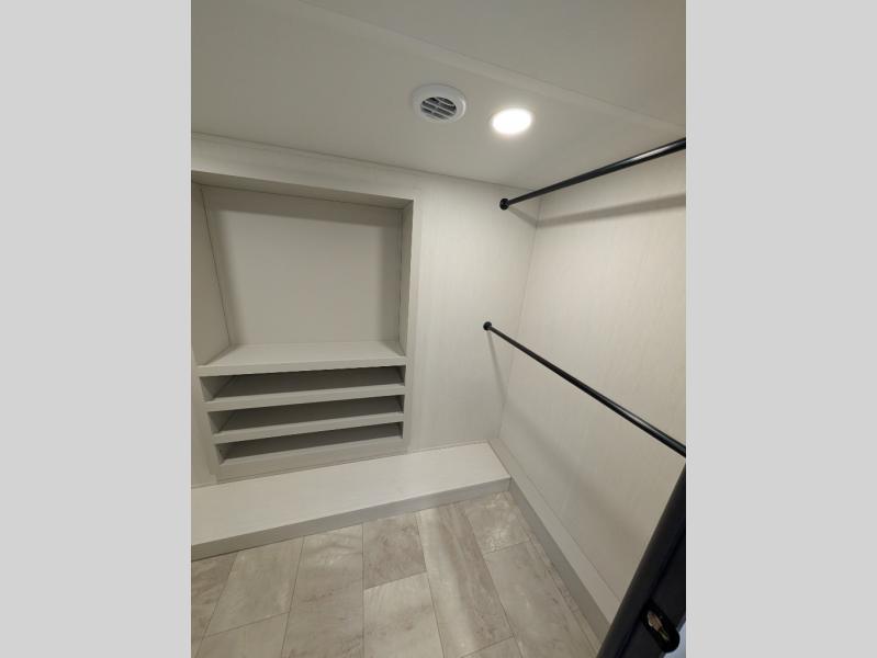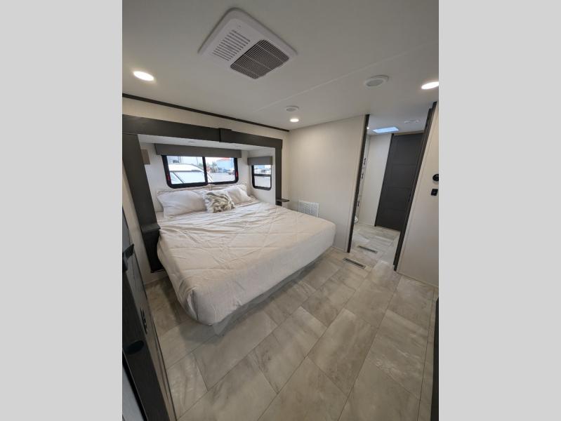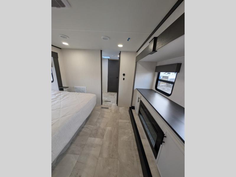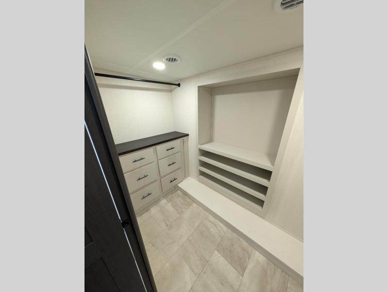 The Sanibel series stands out with a combination of unique and highly functional exterior and interior features designed for both convenience and durability. On the outside, a drop-frame pass-through storage area with a rubberized liner offers ample space while protecting your gear from moisture and wear. Setting up camp is effortless thanks to the one-touch auto-leveling system and rubberized suspension equalizer, which provide a smooth and stable foundation. Inside, comfort meets practicality with carpet less slides for easy cleaning and blackout roller shades for privacy and temperature control. The real wood cabinet doors and solid surface countertops add a touch of elegance, no matter where the road takes you.