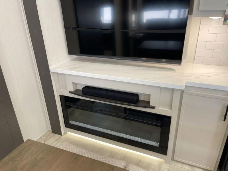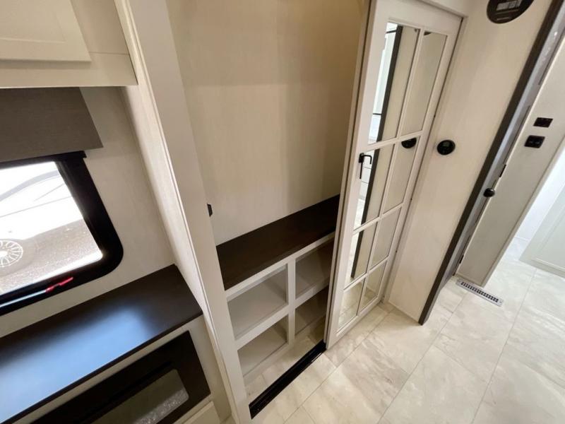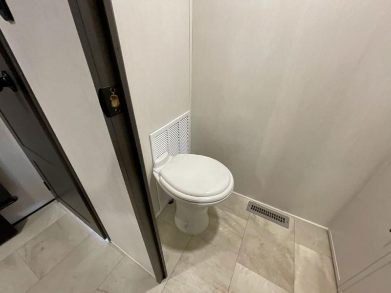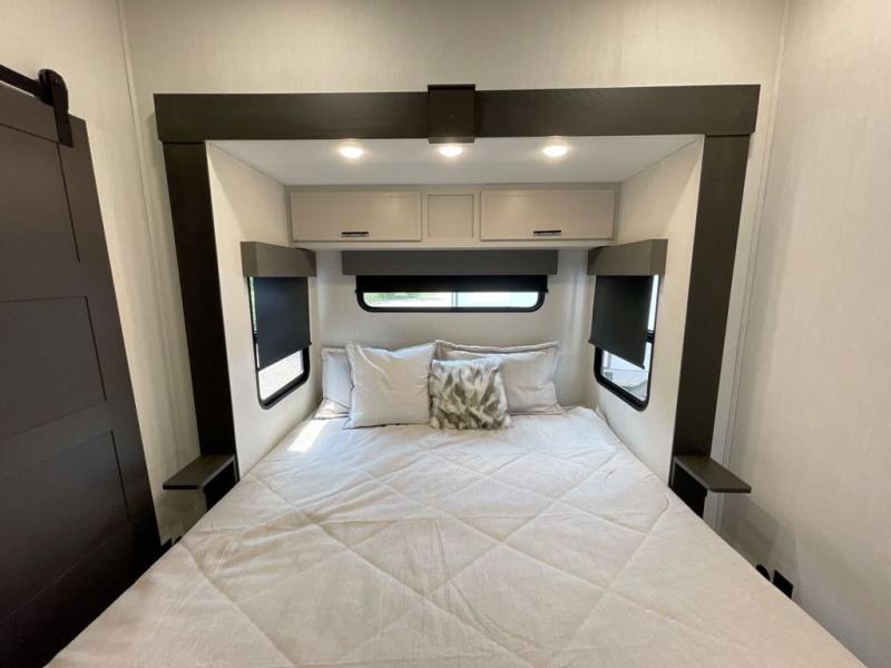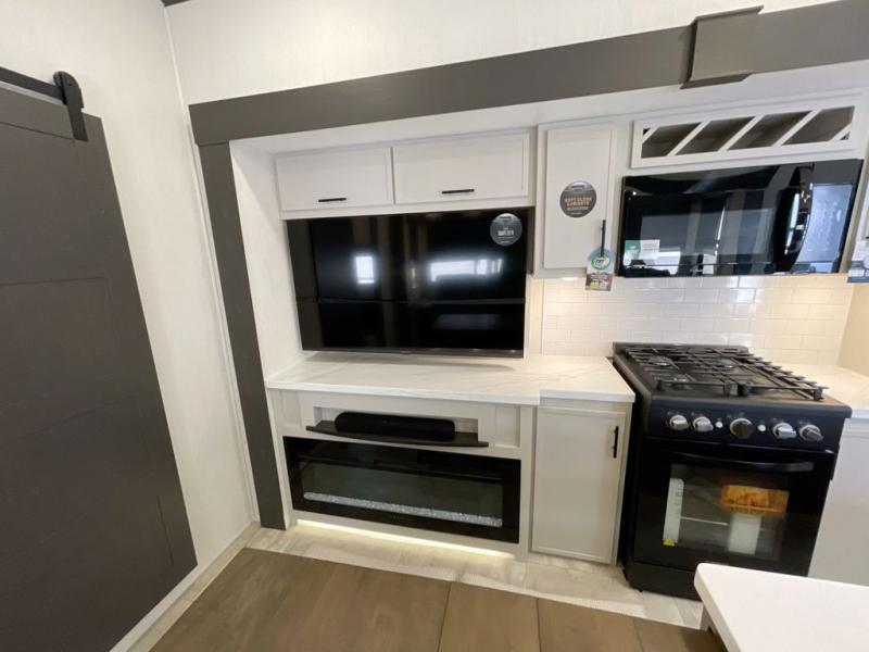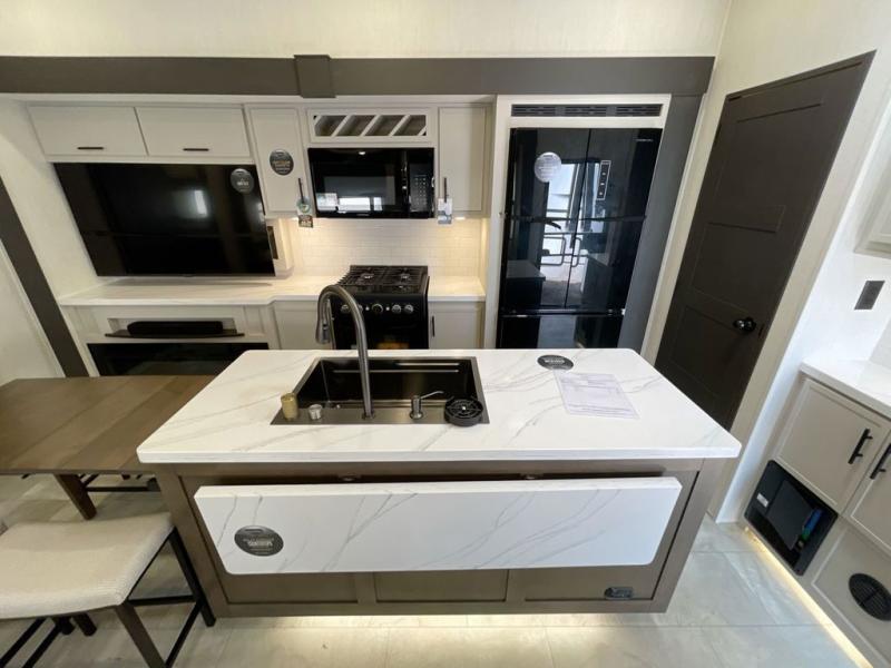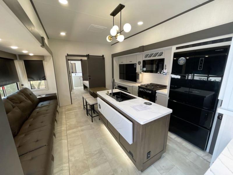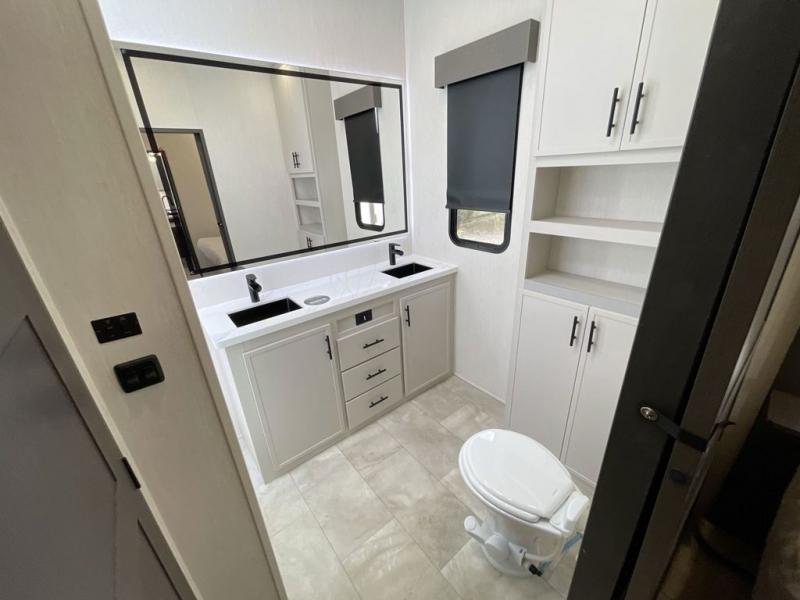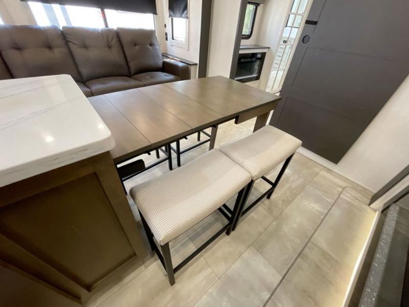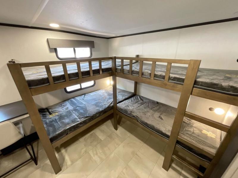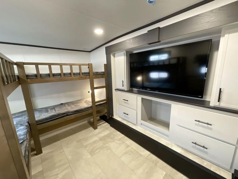 This Sanibel fifth wheel is designed with functionality, starting with the spacious front bunkroom that can sleep up to four on residential-style bunks, perfect for bringing along family or friends. A built-in desk adds versatility, offering a space for work, study, or play, and the attached half bathroom ensures convenience without needing to walk through the entire RV. The middle living area is great for gathering, featuring a five-piece sectional recliner for relaxing, an expandable dinette to seat everyone comfortably, and a fully equipped kitchen that gives the chef all the tools to prepare almost anything they want. At the rear, the private bedroom offers a king-sized bed for ultimate comfort, which leads into a spacious full bathroom complete with a dual vanity, bringing functionality and luxury on the road.
