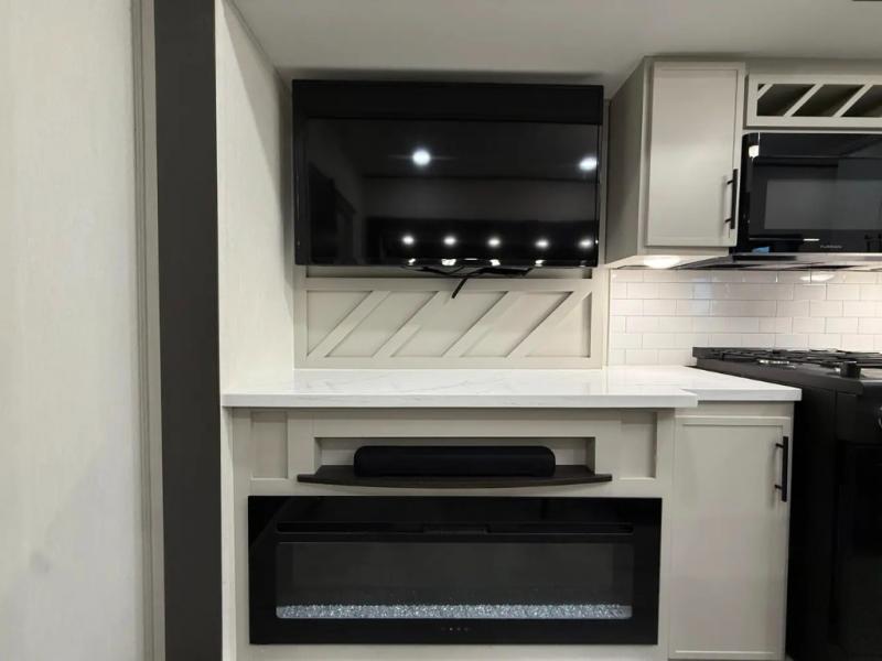 This fifth wheel is sure to wow you! You can easily invite your close neighbor friends along since there is a front den/bedroom that includes dual opposing slides, a Murphy bed/desk, a tri-fold sofa and a wardrobe, plus a full bath! You'll have the master suite towards the back all to yourselves, and here you'll find a king bed slide out, a bedroom fireplace, and a full rear bath, complete with dual bath sinks. There is even a linen closet with washer and dryer prep if you want the option to go full-time! In the morning, everyone can meet in the combined kitchen and living area as the chef whips up breakfast on the four burner cooktop. There is a gourmet island with a flip-up counter and a hidden dinette to provide everyone space to gather around. And you'll love the large sofa with pop-up chargers across from the hidden Smart TV and fireplace. Don't let this fifth wheel slip away!