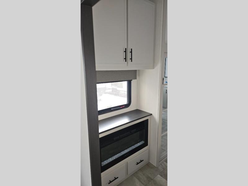 The Sanibel series stands out with a combination of unique and highly functional exterior and interior features designed for both convenience and durability. On the outside, a drop-frame pass-through storage area with a rubberized liner offers ample space while protecting your gear from moisture and wear. Setting up camp is effortless thanks to the one-touch auto-leveling system and rubberized suspension equalizer, which provide a smooth and stable foundation. Inside, comfort meets practicality with carpet less slides for easy cleaning and blackout roller shades for privacy and temperature control. The real wood cabinet doors and solid surface countertops add a touch of elegance, no matter where the road takes you.