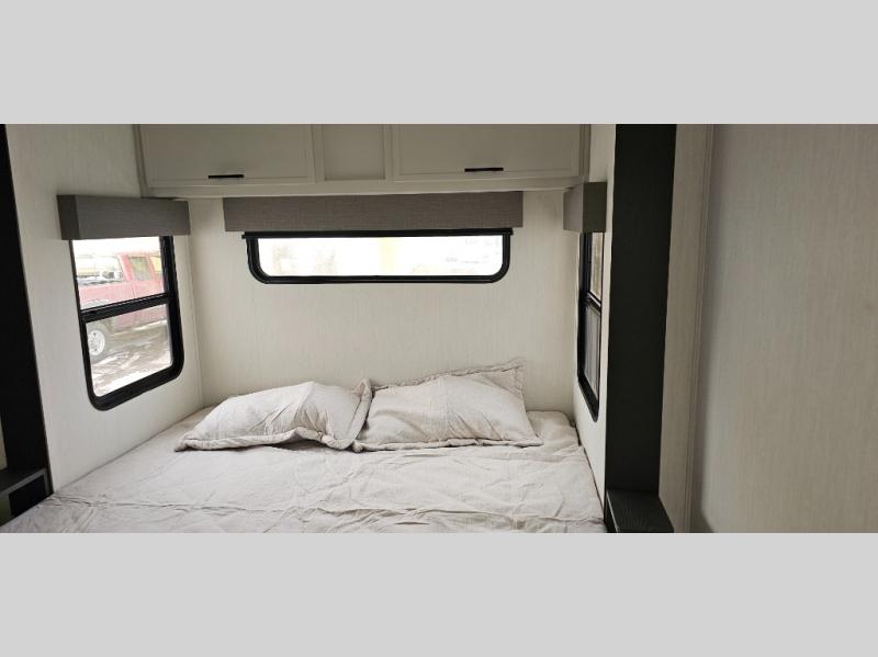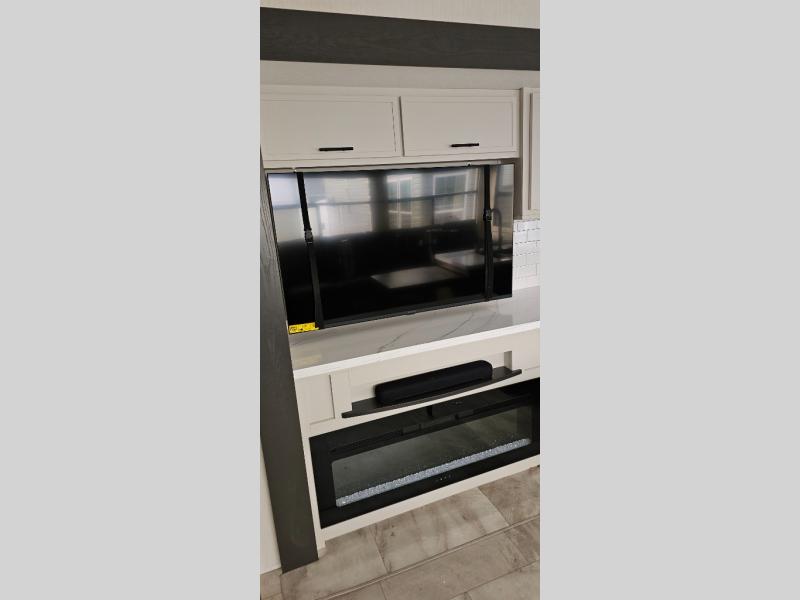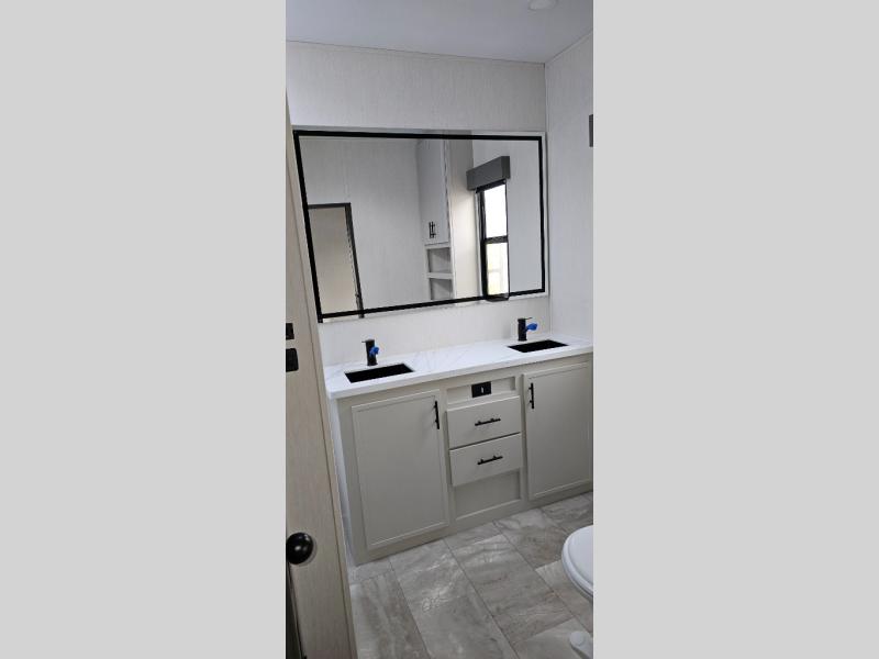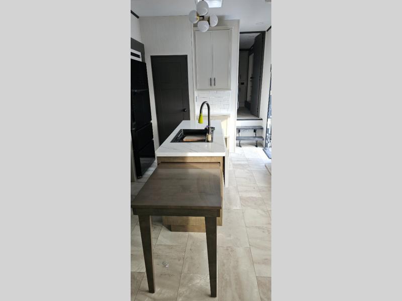 This fifth wheel offers a highly versatile layout designed to adapt to your lifestyle. The front bedroom is a flexible space featuring a sofa on a slide-out and a desk that easily converts into a Murphy bed, making it ideal as a remote office, an extra-sleeping area for guests, or even a cozy living space with a smart TV. A full bathroom is conveniently located nearby for added comfort. In the center of the trailer, you'll find a spacious living area with a five-piece sectional recliner and an expandable dinette to accommodate everyone. The well-equipped kitchen includes essentials like a four-burner range and a French door refrigerator, perfect for cooking up your favorite meals. At the rear, the master bedroom offers a relaxing retreat with a king-sized bed and direct access to a full bathroom featuring a dual vanity, bringing the comforts of home wherever you go.