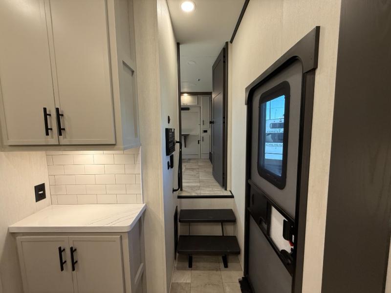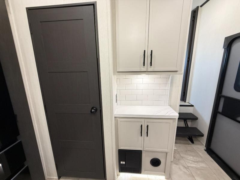 The Sanibel series stands out with a combination of unique and highly functional exterior and interior features designed for both convenience and durability. On the outside, a drop-frame pass-through storage area with a rubberized liner offers ample space while protecting your gear from moisture and wear. Setting up camp is effortless thanks to the one-touch auto-leveling system and rubberized suspension equalizer, which provide a smooth and stable foundation. Inside, comfort meets practicality with carpet less slides for easy cleaning and blackout roller shades for privacy and temperature control. The real wood cabinet doors and solid surface countertops add a touch of elegance, no matter where the road takes you.