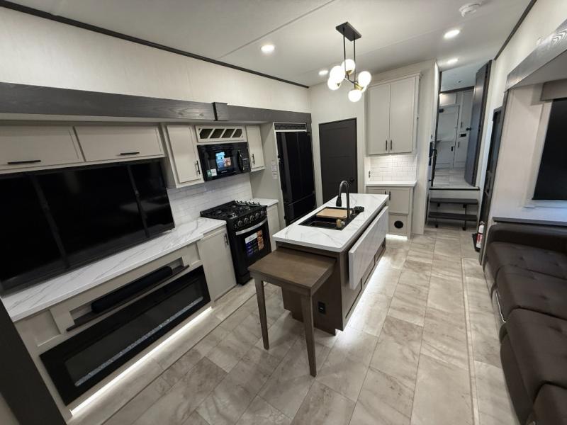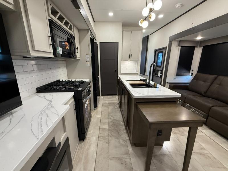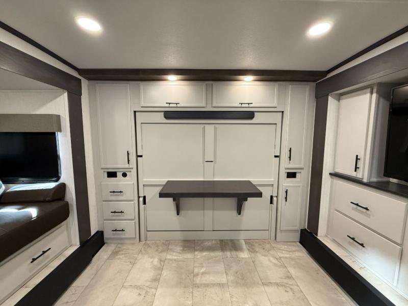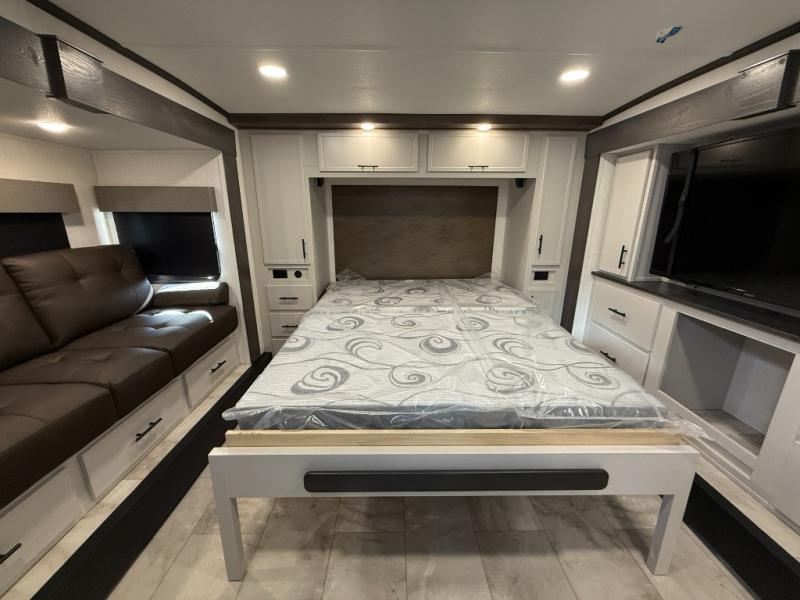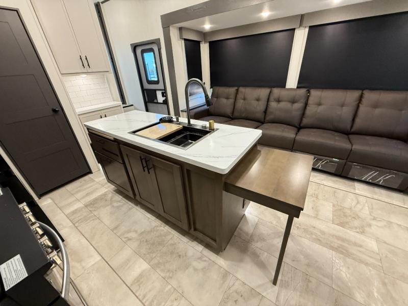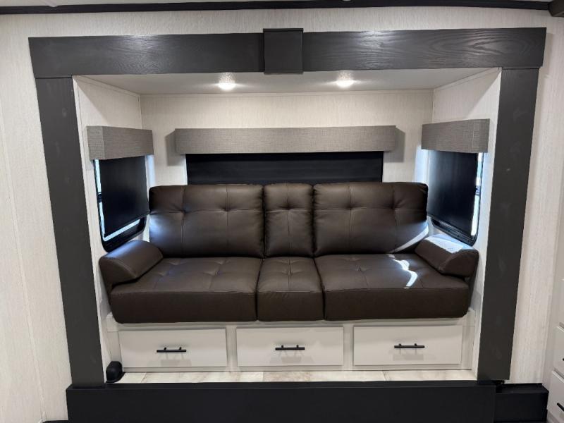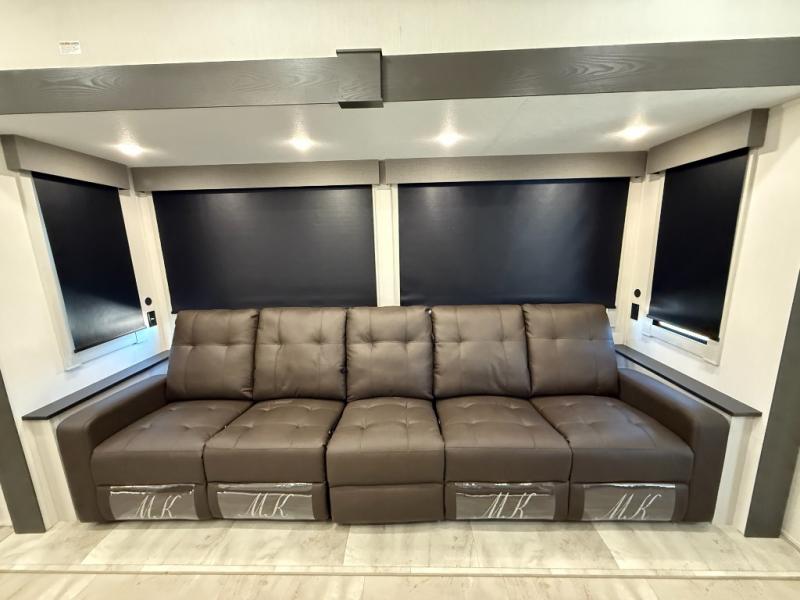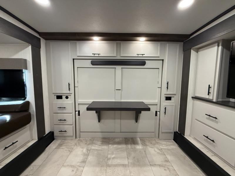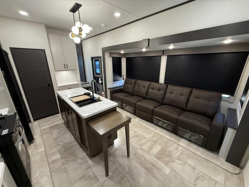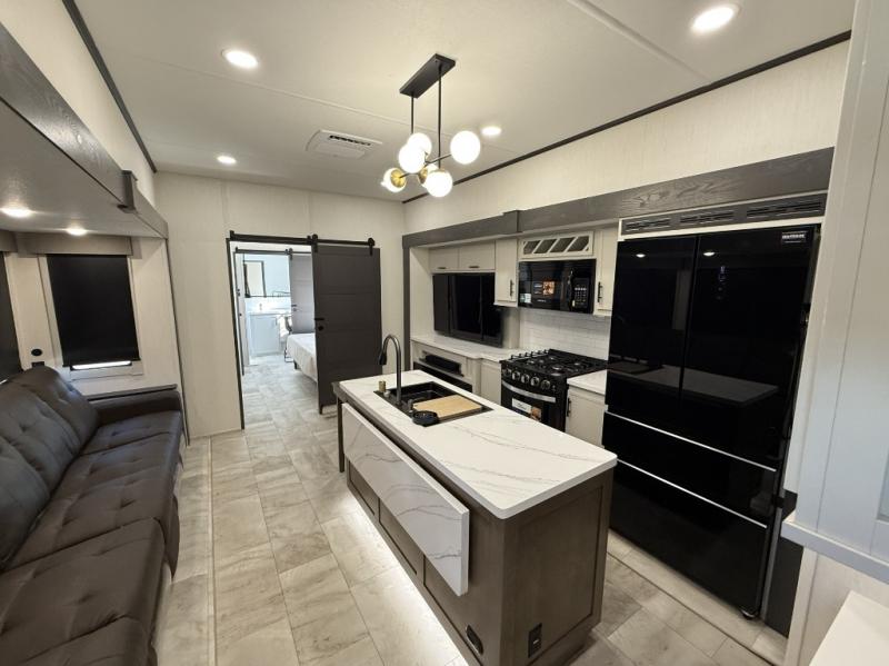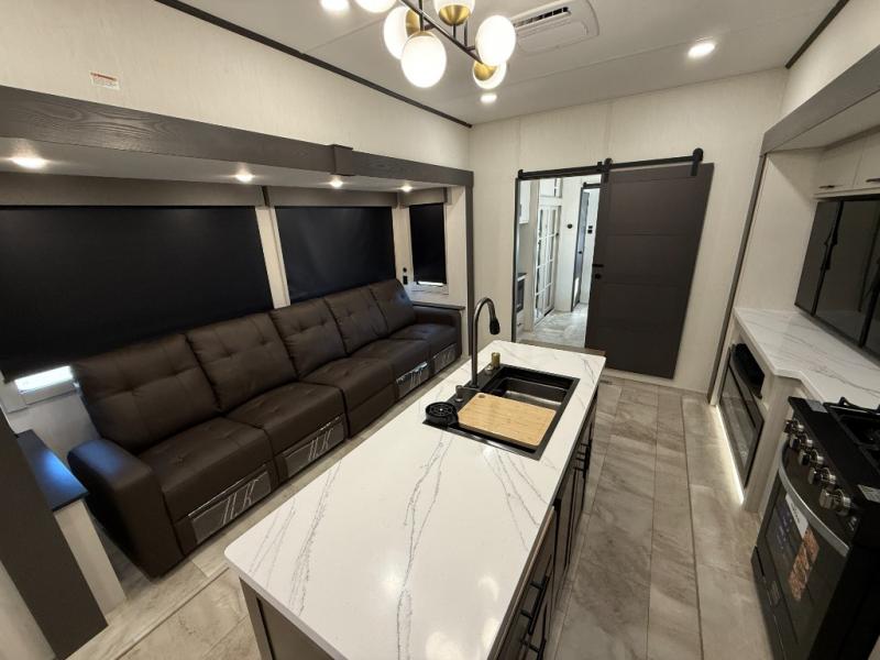 This fifth wheel offers a highly versatile layout designed to adapt to your lifestyle. The front bedroom is a flexible space featuring a sofa on a slide-out and a desk that easily converts into a Murphy bed, making it ideal as a remote office, an extra-sleeping area for guests, or even a cozy living space with a smart TV. A full bathroom is conveniently located nearby for added comfort. In the center of the trailer, you'll find a spacious living area with a five-piece sectional recliner and an expandable dinette to accommodate everyone. The well-equipped kitchen includes essentials like a four-burner range and a French door refrigerator, perfect for cooking up your favorite meals. At the rear, the master bedroom offers a relaxing retreat with a king-sized bed and direct access to a full bathroom featuring a dual vanity, bringing the comforts of home wherever you go.
