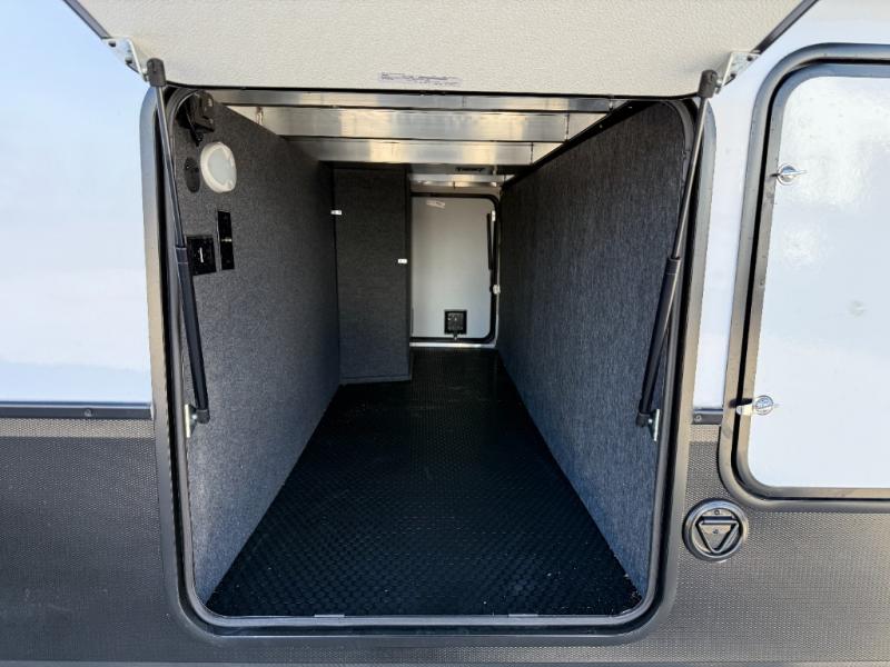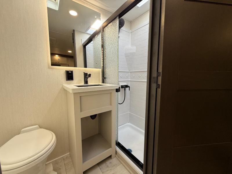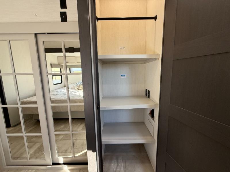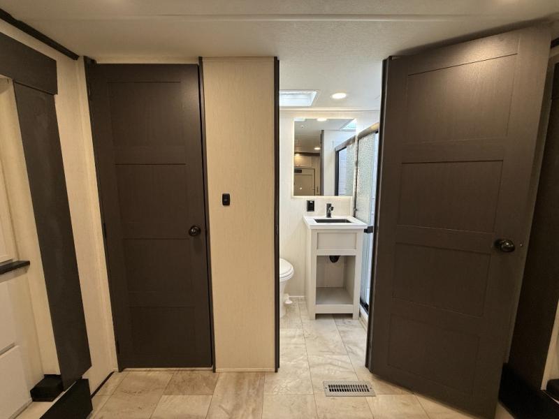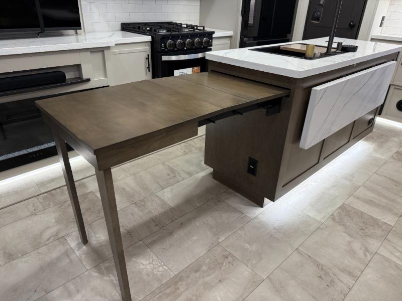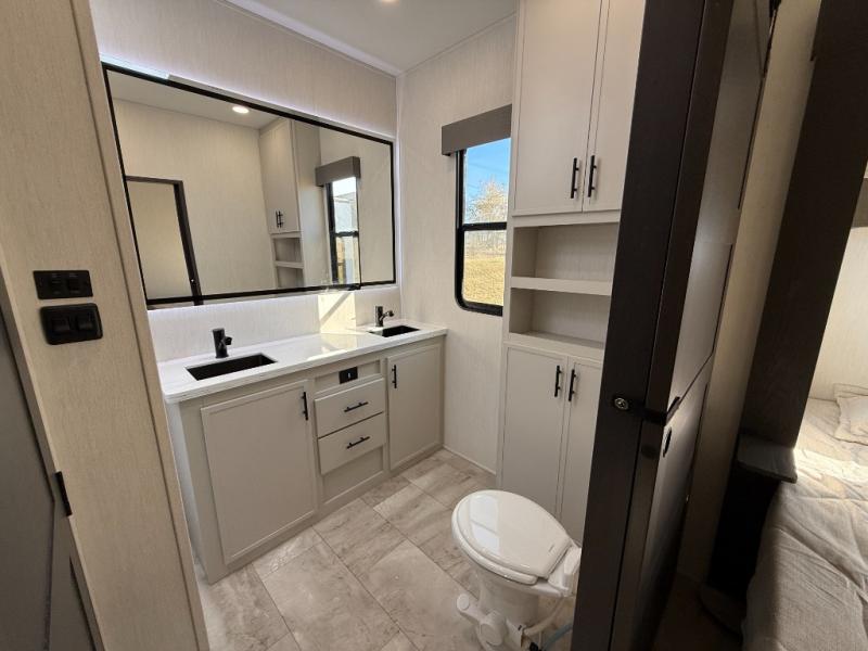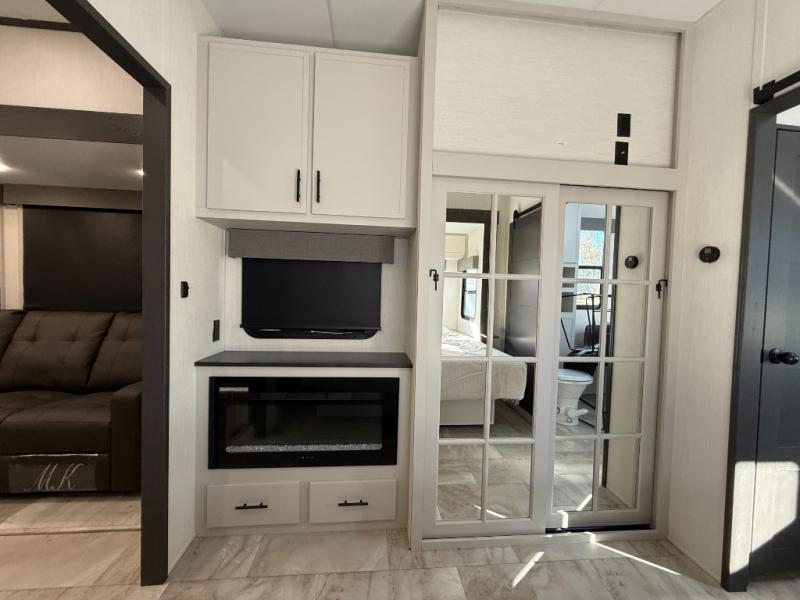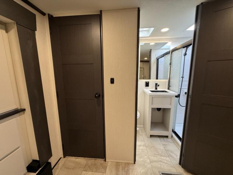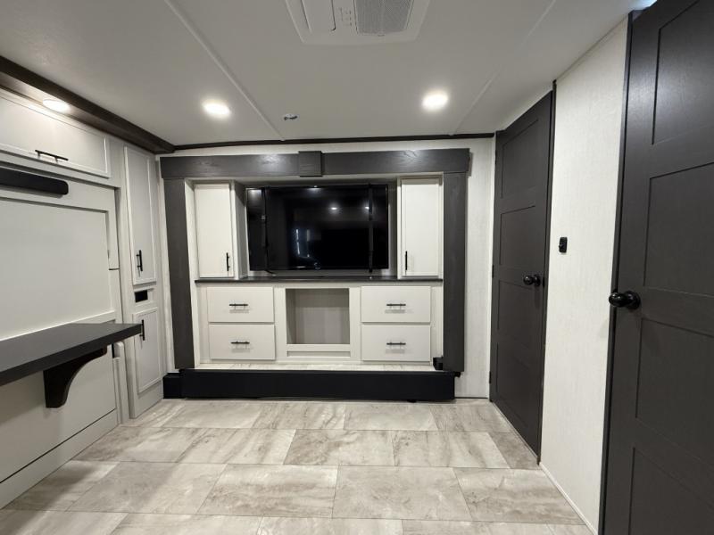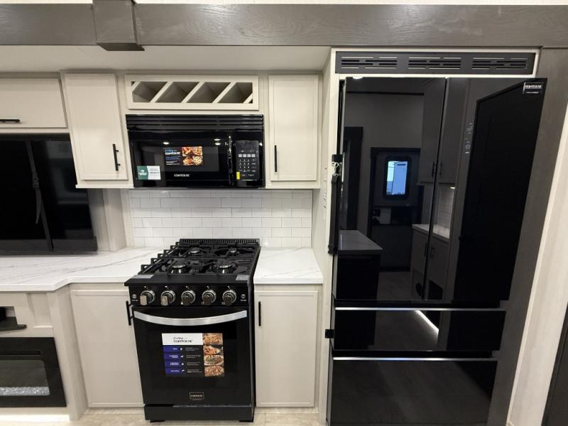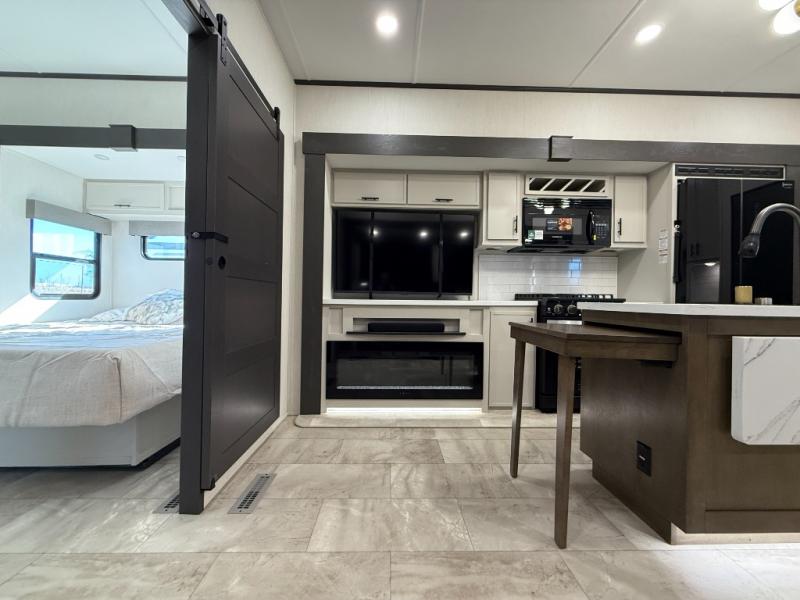 This fifth wheel offers a highly versatile layout designed to adapt to your lifestyle. The front bedroom is a flexible space featuring a sofa on a slide-out and a desk that easily converts into a Murphy bed, making it ideal as a remote office, an extra-sleeping area for guests, or even a cozy living space with a smart TV. A full bathroom is conveniently located nearby for added comfort. In the center of the trailer, you'll find a spacious living area with a five-piece sectional recliner and an expandable dinette to accommodate everyone. The well-equipped kitchen includes essentials like a four-burner range and a French door refrigerator, perfect for cooking up your favorite meals. At the rear, the master bedroom offers a relaxing retreat with a king-sized bed and direct access to a full bathroom featuring a dual vanity, bringing the comforts of home wherever you go.
