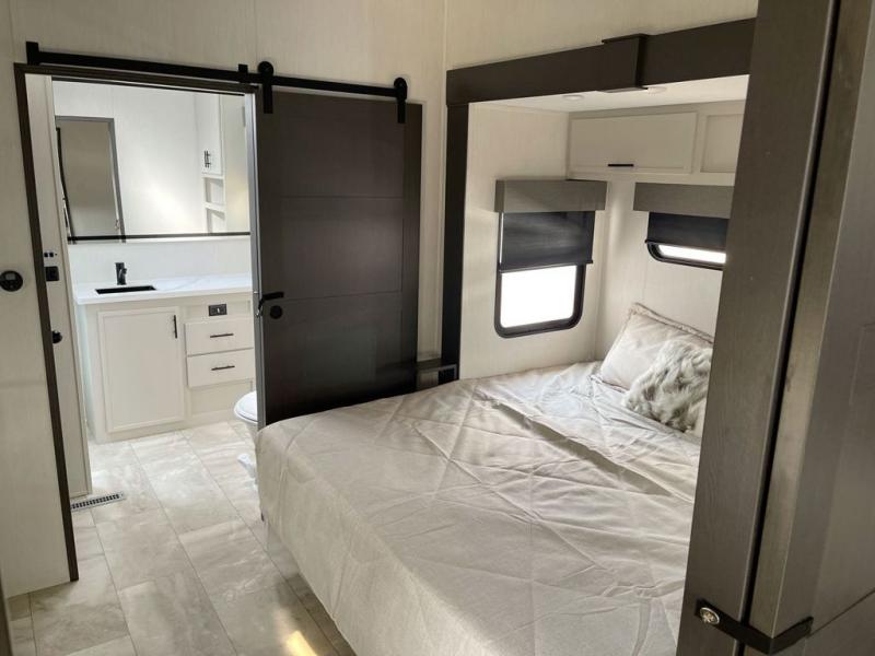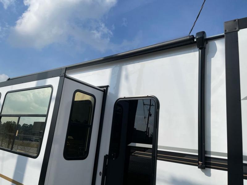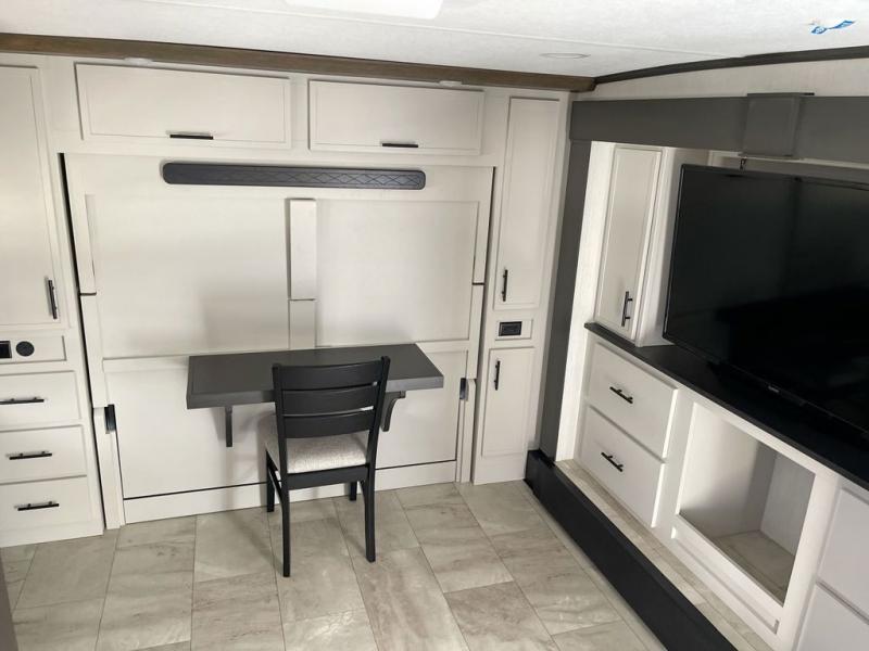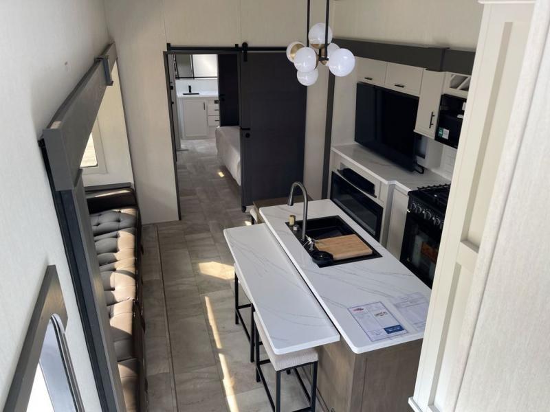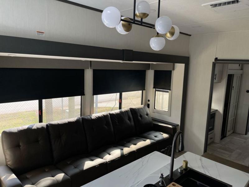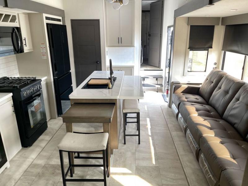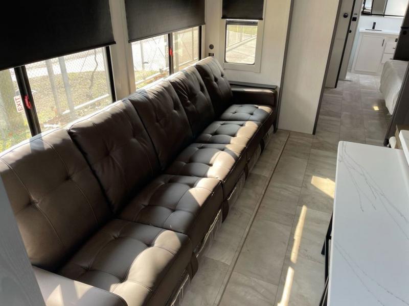 This fifth wheel offers a highly versatile layout designed to adapt to your lifestyle. The front bedroom is a flexible space featuring a sofa on a slide-out and a desk that easily converts into a Murphy bed, making it ideal as a remote office, an extra-sleeping area for guests, or even a cozy living space with a smart TV. A full bathroom is conveniently located nearby for added comfort. In the center of the trailer, you'll find a spacious living area with a five-piece sectional recliner and an expandable dinette to accommodate everyone. The well-equipped kitchen includes essentials like a four-burner range and a French door refrigerator, perfect for cooking up your favorite meals. At the rear, the master bedroom offers a relaxing retreat with a king-sized bed and direct access to a full bathroom featuring a dual vanity, bringing the comforts of home wherever you go.