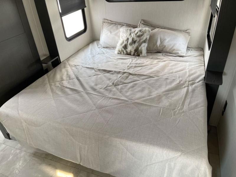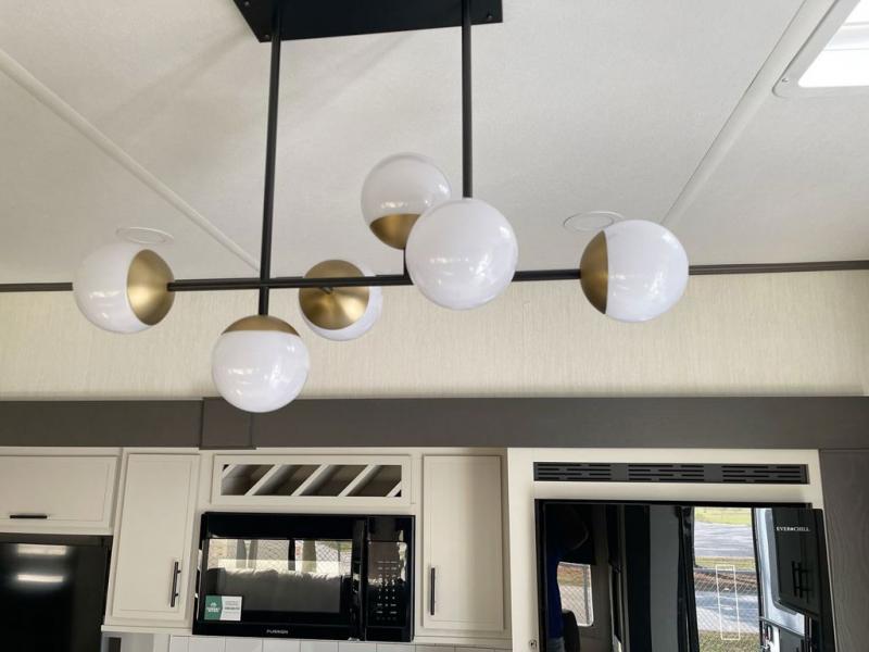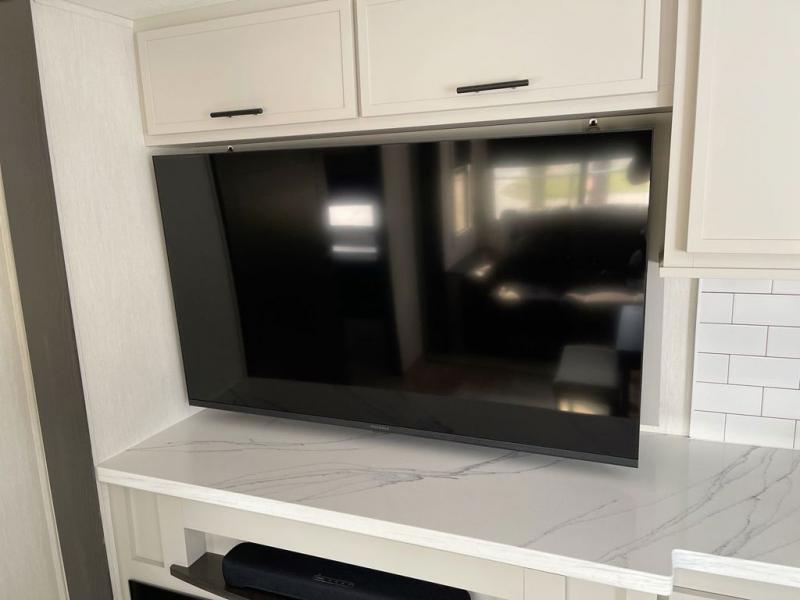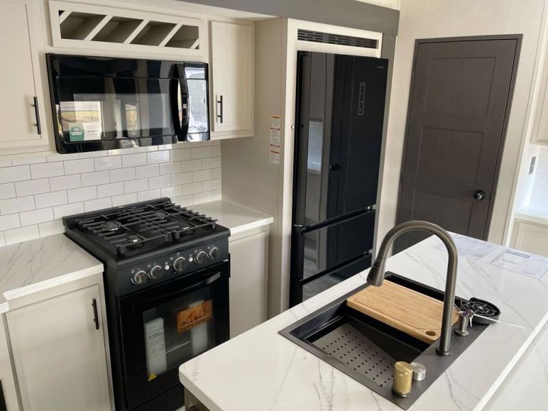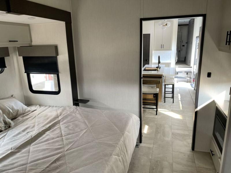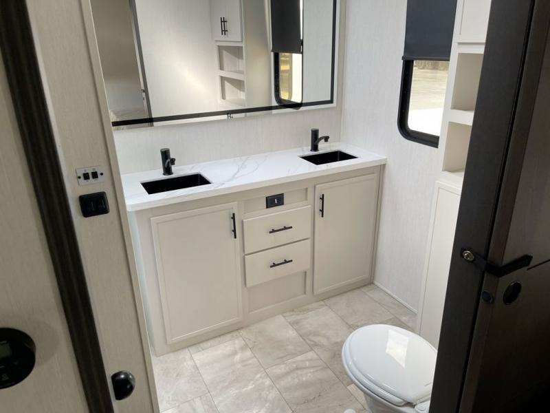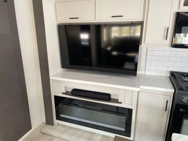 This fifth wheel offers a highly versatile layout designed to adapt to your lifestyle. The front bedroom is a flexible space featuring a sofa on a slide-out and a desk that easily converts into a Murphy bed, making it ideal as a remote office, an extra-sleeping area for guests, or even a cozy living space with a smart TV. A full bathroom is conveniently located nearby for added comfort. In the center of the trailer, you'll find a spacious living area with a five-piece sectional recliner and an expandable dinette to accommodate everyone. The well-equipped kitchen includes essentials like a four-burner range and a French door refrigerator, perfect for cooking up your favorite meals. At the rear, the master bedroom offers a relaxing retreat with a king-sized bed and direct access to a full bathroom featuring a dual vanity, bringing the comforts of home wherever you go.