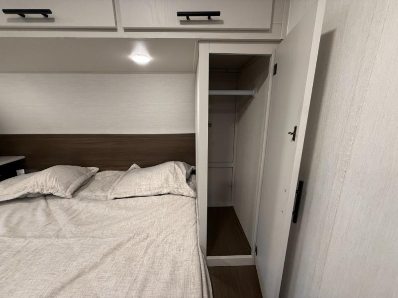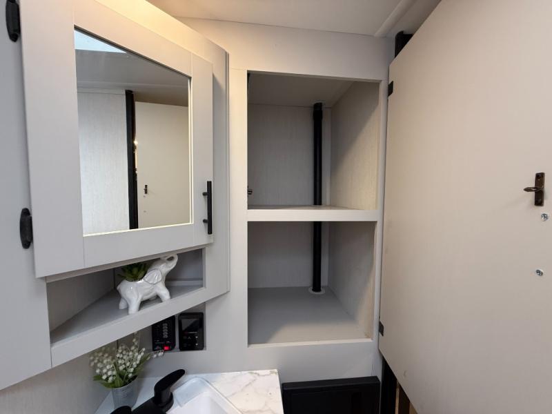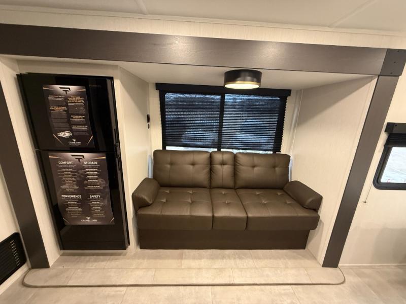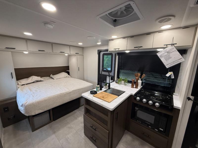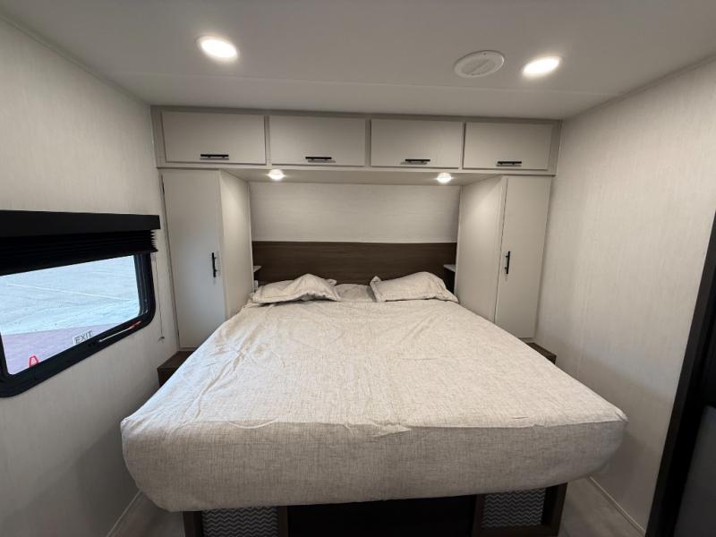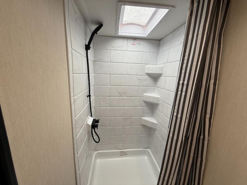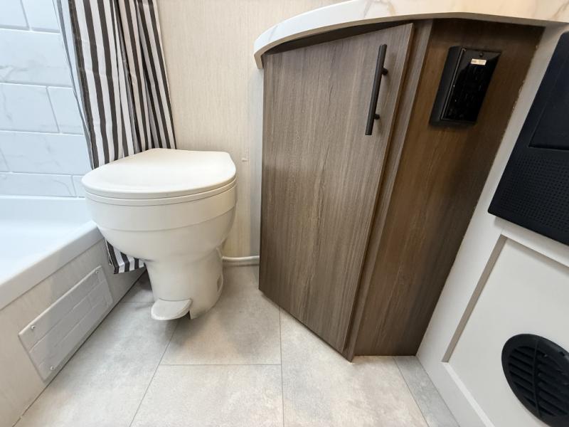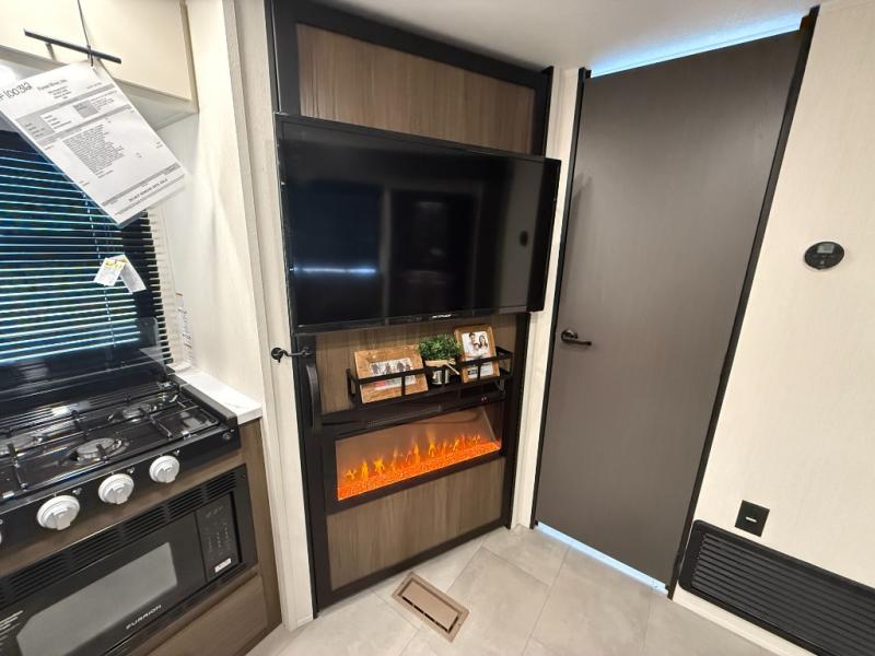 This travel trailer features an array of premium amenities! The spacious full rear shower provides a rejuvenating retreat, perfect for unwinding after a long day. The sophisticated entertainment center is ideal for cozy nights in, and the plush jackknife sofa offers a comfortable spot to relax or sleep. Generous storage space for your belongings is provided by ample overhead cabinets. Further, the gourmet kitchen is equipped with a convenient side 12V fridge, high-performance three-burner cooktop, and cleverly designed hidden pantry, making meal prep and cooking a true delight. Plus, the majestic front bedroom features a sumptuous king bed that will make you feel like you are sleeping in the clouds, expansive wardrobes, and overhead cabinets for storing your essentials.