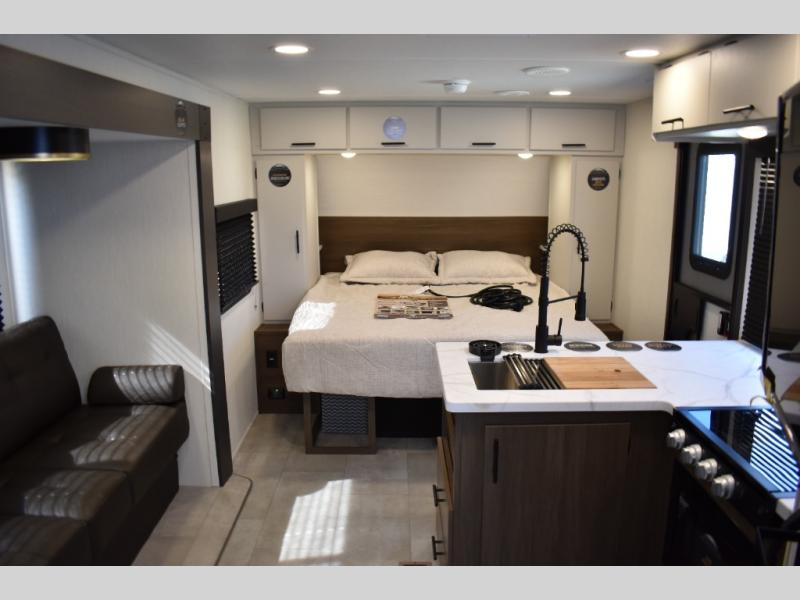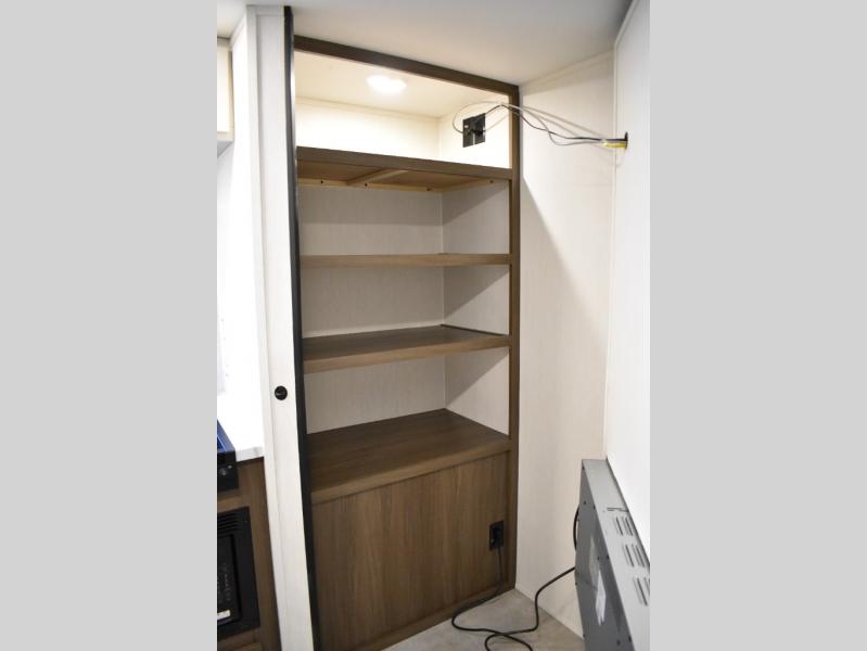 This travel trailer features an array of premium amenities! The spacious full rear shower provides a rejuvenating retreat, perfect for unwinding after a long day. The sophisticated entertainment center is ideal for cozy nights in, and the plush jackknife sofa offers a comfortable spot to relax or sleep. Generous storage space for your belongings is provided by ample overhead cabinets. Further, the gourmet kitchen is equipped with a convenient side 12V fridge, high-performance three-burner cooktop, and cleverly designed hidden pantry, making meal prep and cooking a true delight. Plus, the majestic front bedroom features a sumptuous king bed that will make you feel like you are sleeping in the clouds, expansive wardrobes, and overhead cabinets for storing your essentials.