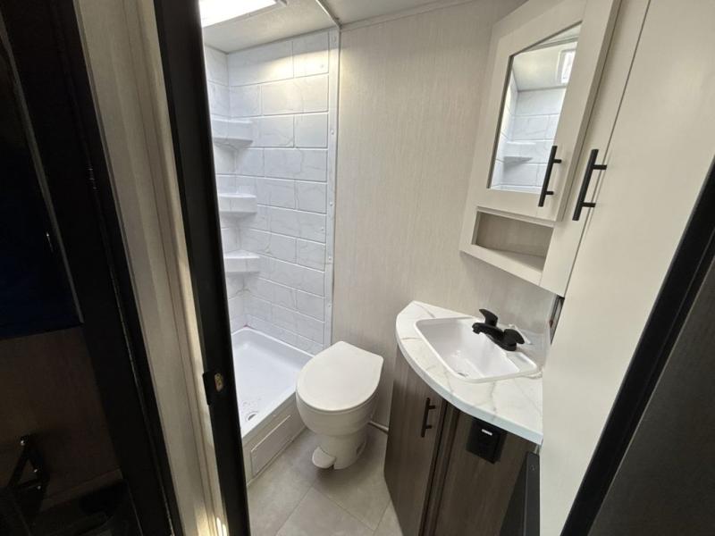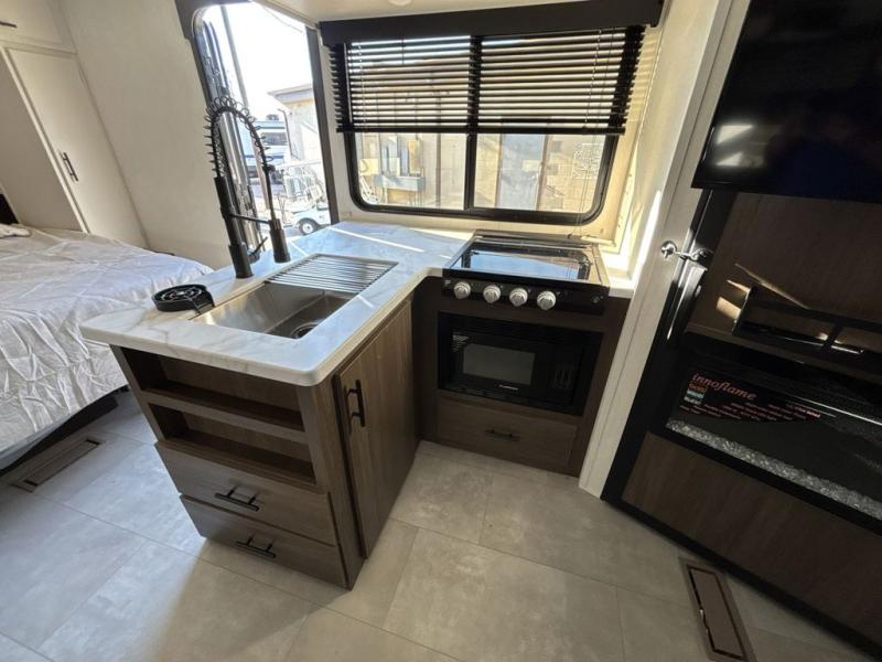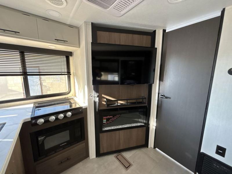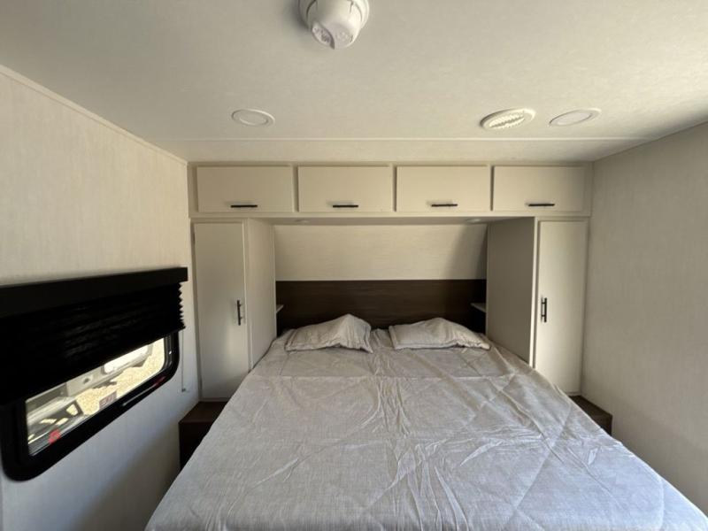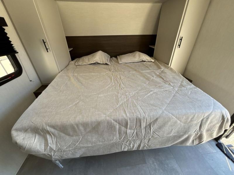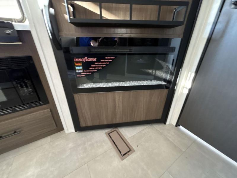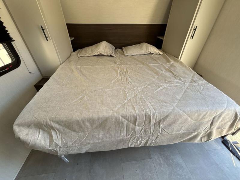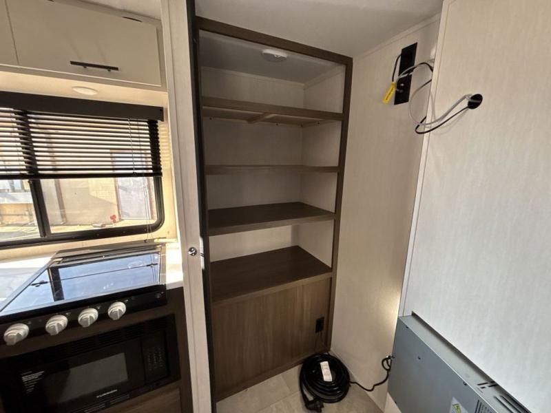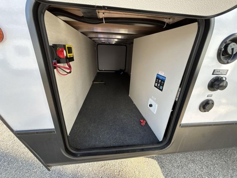 This travel trailer features an array of premium amenities! The spacious full rear shower provides a rejuvenating retreat, perfect for unwinding after a long day. The sophisticated entertainment center is ideal for cozy nights in, and the plush jackknife sofa offers a comfortable spot to relax or sleep. Generous storage space for your belongings is provided by ample overhead cabinets. Further, the gourmet kitchen is equipped with a convenient side 12V fridge, high-performance three-burner cooktop, and cleverly designed hidden pantry, making meal prep and cooking a true delight. Plus, the majestic front bedroom features a sumptuous king bed that will make you feel like you are sleeping in the clouds, expansive wardrobes, and overhead cabinets for storing your essentials.