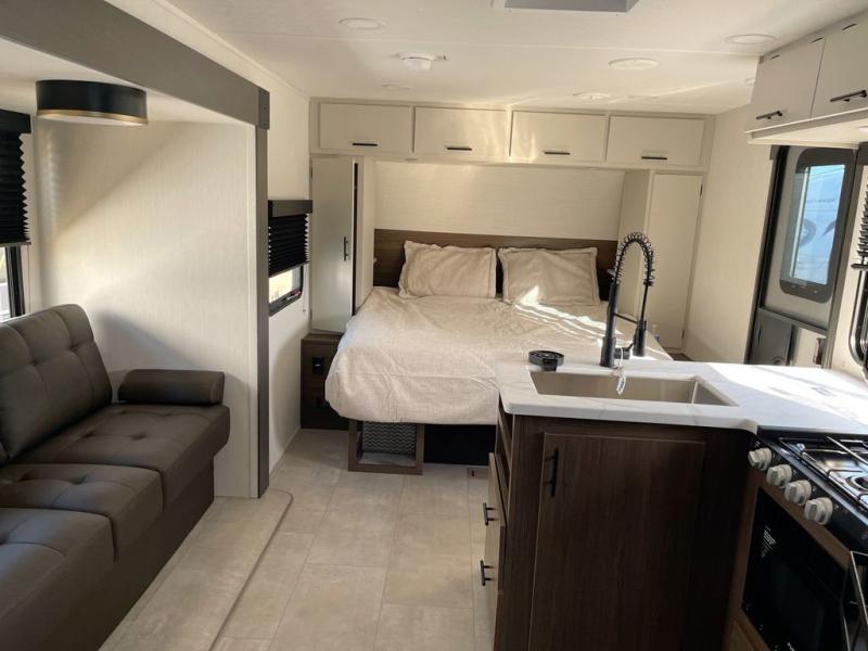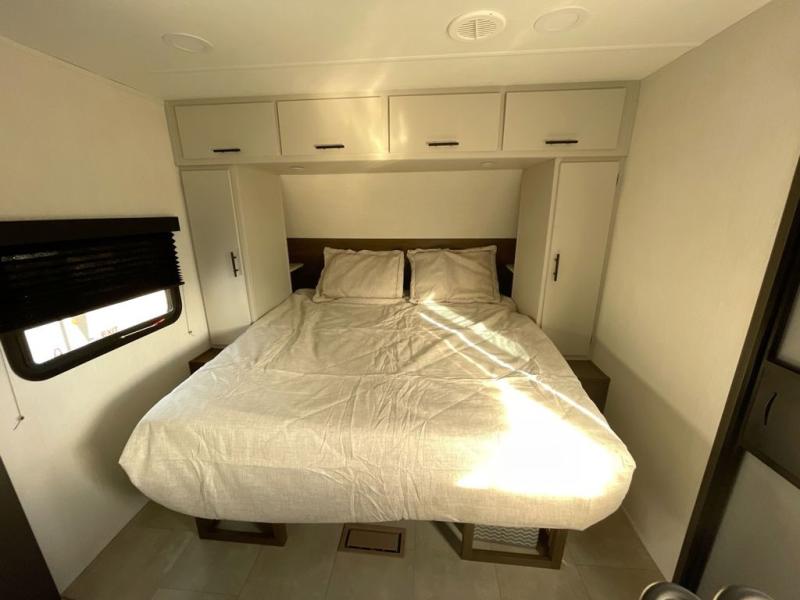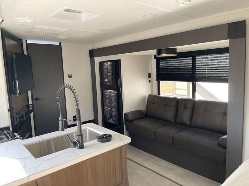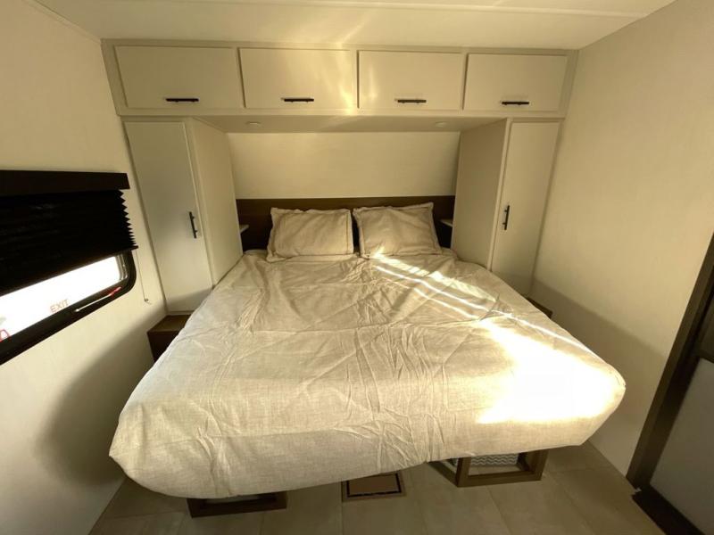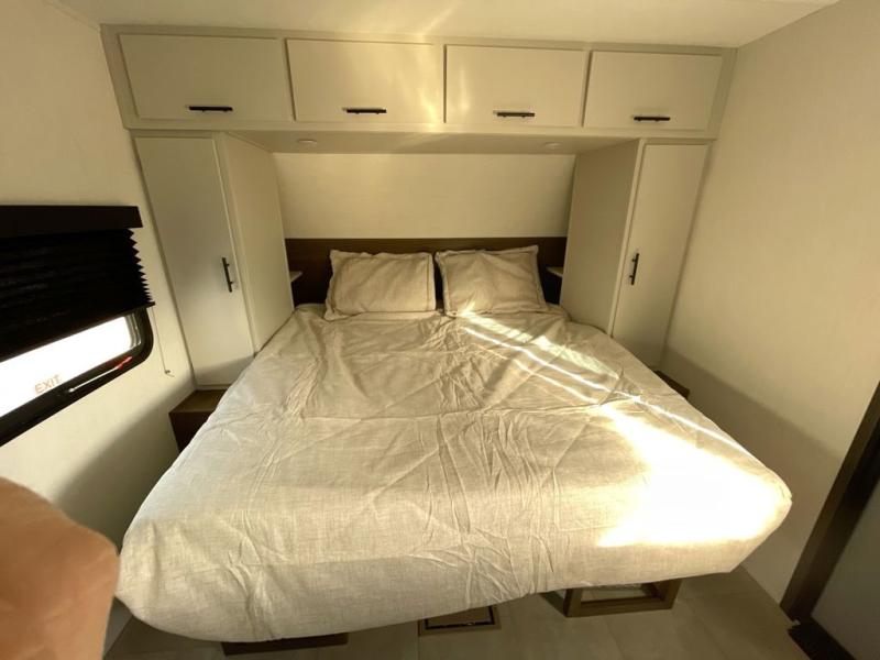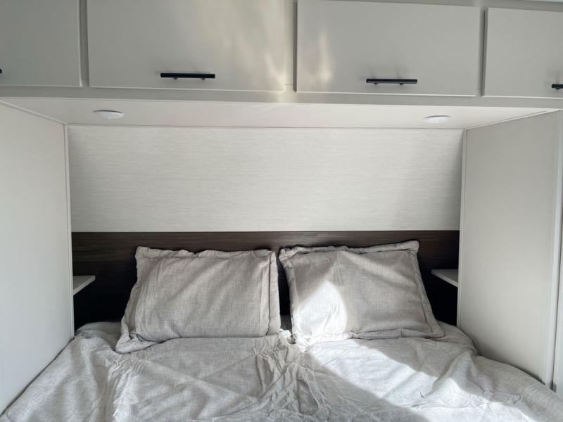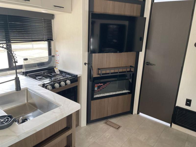 This travel trailer features an array of premium amenities! The spacious full rear shower provides a rejuvenating retreat, perfect for unwinding after a long day. The sophisticated entertainment center is ideal for cozy nights in, and the plush jackknife sofa offers a comfortable spot to relax or sleep. Generous storage space for your belongings is provided by ample overhead cabinets. Further, the gourmet kitchen is equipped with a convenient side 12V fridge, high-performance three-burner cooktop, and cleverly designed hidden pantry, making meal prep and cooking a true delight. Plus, the majestic front bedroom features a sumptuous king bed that will make you feel like you are sleeping in the clouds, expansive wardrobes, and overhead cabinets for storing your essentials.