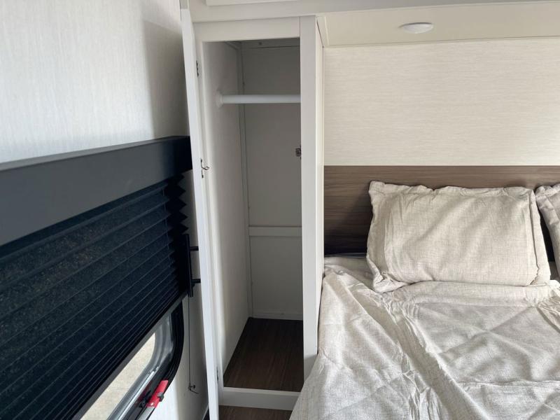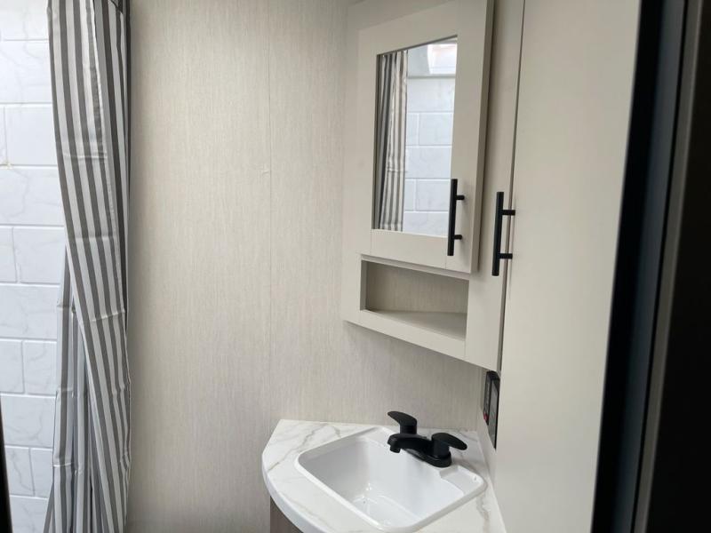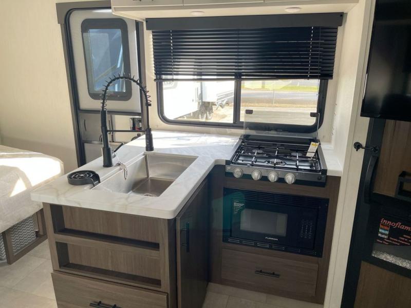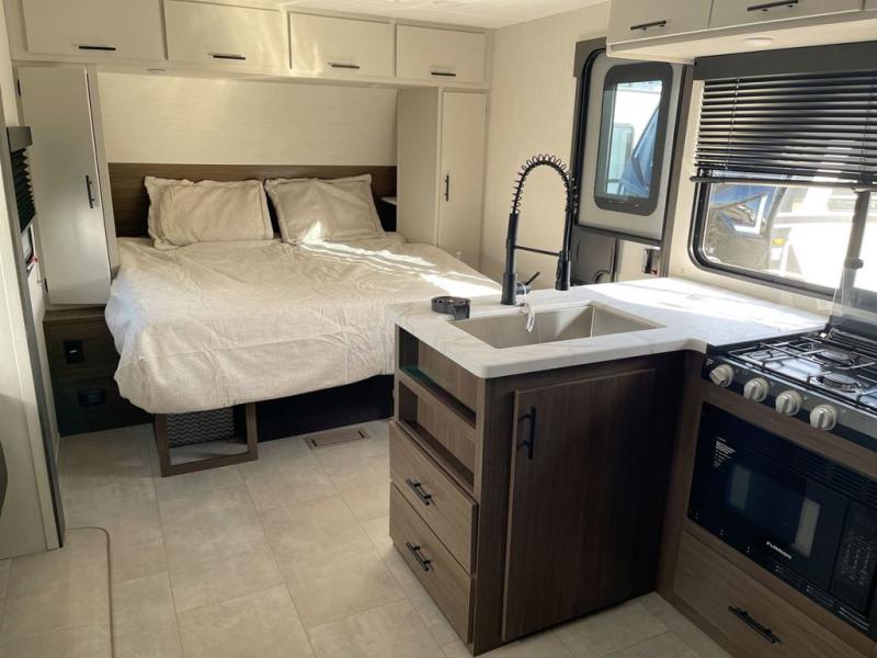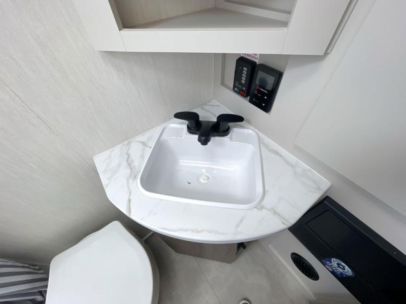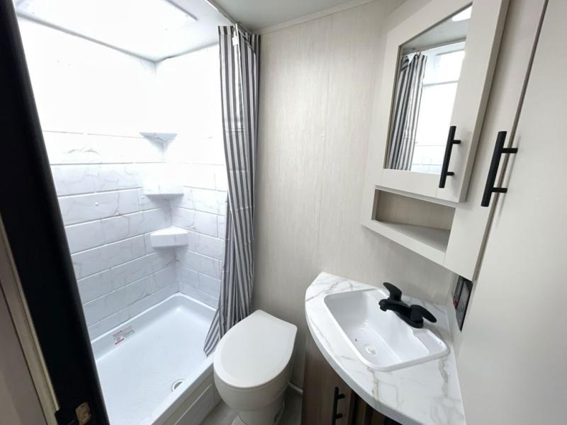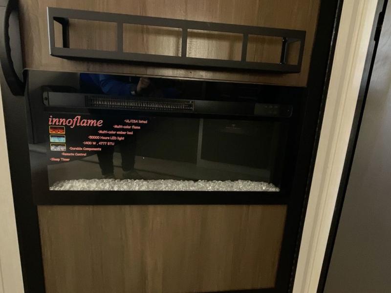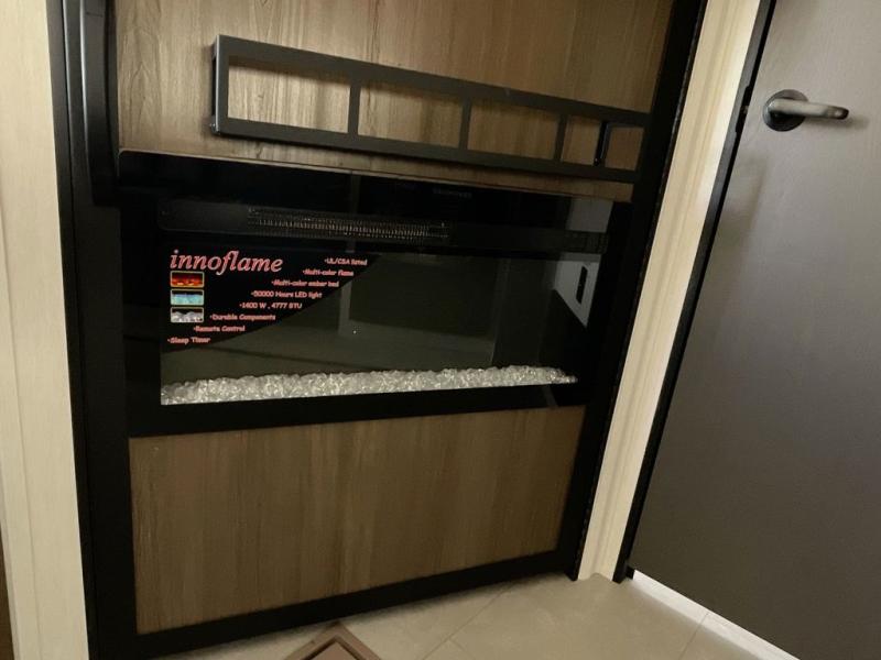 This travel trailer features an array of premium amenities! The spacious full rear shower provides a rejuvenating retreat, perfect for unwinding after a long day. The sophisticated entertainment center is ideal for cozy nights in, and the plush jackknife sofa offers a comfortable spot to relax or sleep. Generous storage space for your belongings is provided by ample overhead cabinets. Further, the gourmet kitchen is equipped with a convenient side 12V fridge, high-performance three-burner cooktop, and cleverly designed hidden pantry, making meal prep and cooking a true delight. Plus, the majestic front bedroom features a sumptuous king bed that will make you feel like you are sleeping in the clouds, expansive wardrobes, and overhead cabinets for storing your essentials.