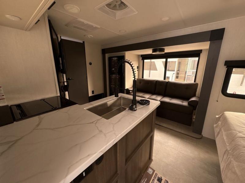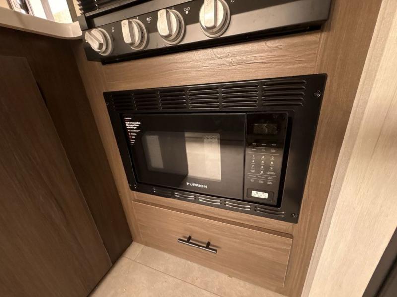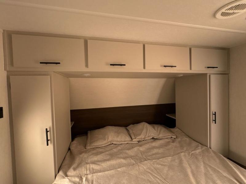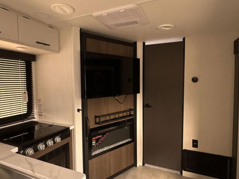 This travel trailer features an array of premium amenities! The spacious full rear shower provides a rejuvenating retreat, perfect for unwinding after a long day. The sophisticated entertainment center is ideal for cozy nights in, and the plush jackknife sofa offers a comfortable spot to relax or sleep. Generous storage space for your belongings is provided by ample overhead cabinets. Further, the gourmet kitchen is equipped with a convenient side 12V fridge, high-performance three-burner cooktop, and cleverly designed hidden pantry, making meal prep and cooking a true delight. Plus, the majestic front bedroom features a sumptuous king bed that will make you feel like you are sleeping in the clouds, expansive wardrobes, and overhead cabinets for storing your essentials.