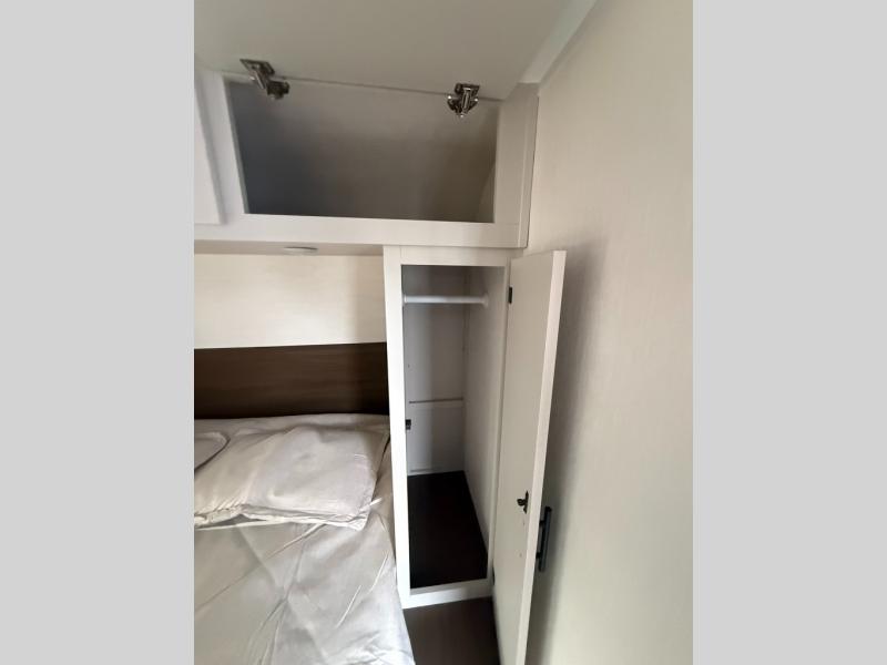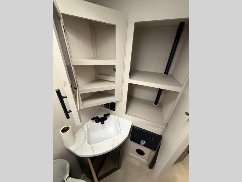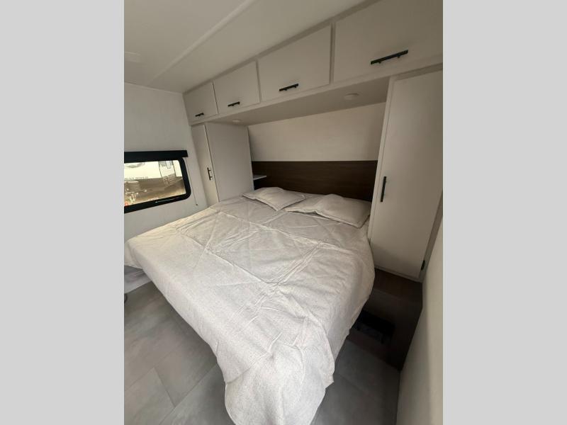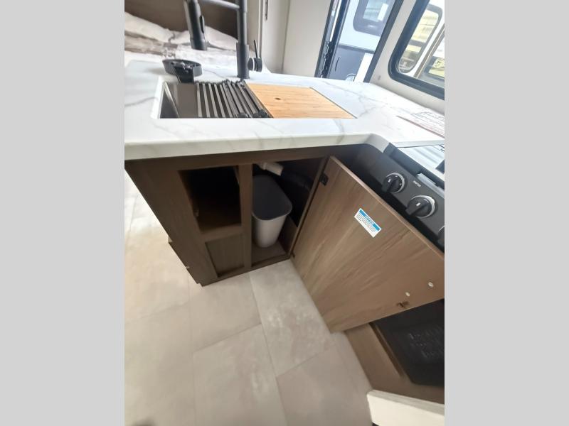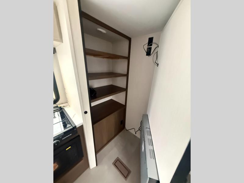 This travel trailer features an array of premium amenities! The spacious full rear shower provides a rejuvenating retreat, perfect for unwinding after a long day. The sophisticated entertainment center is ideal for cozy nights in, and the plush jackknife sofa offers a comfortable spot to relax or sleep. Generous storage space for your belongings is provided by ample overhead cabinets. Further, the gourmet kitchen is equipped with a convenient side 12V fridge, high-performance three-burner cooktop, and cleverly designed hidden pantry, making meal prep and cooking a true delight. Plus, the majestic front bedroom features a sumptuous king bed that will make you feel like you are sleeping in the clouds, expansive wardrobes, and overhead cabinets for storing your essentials.
