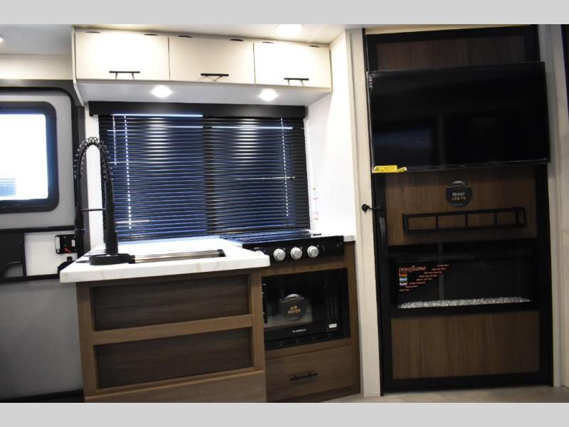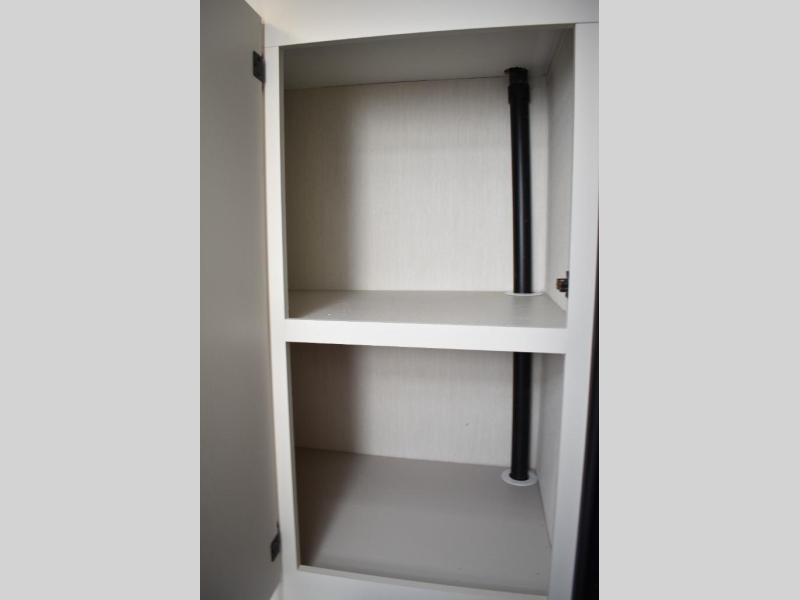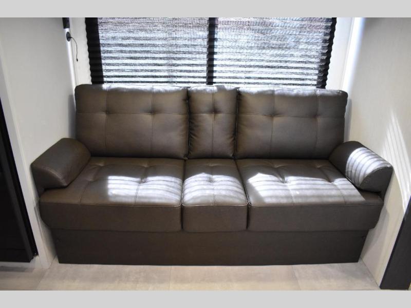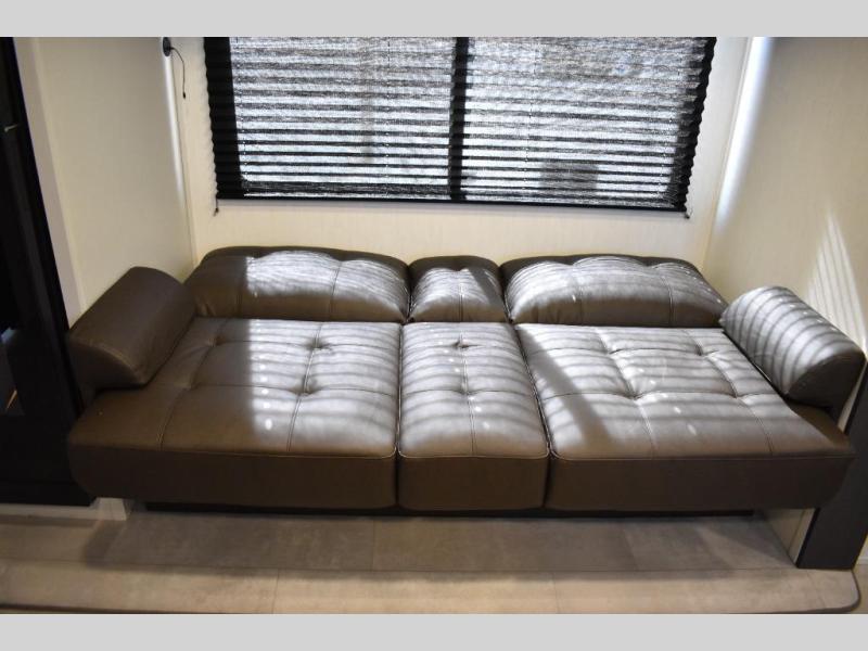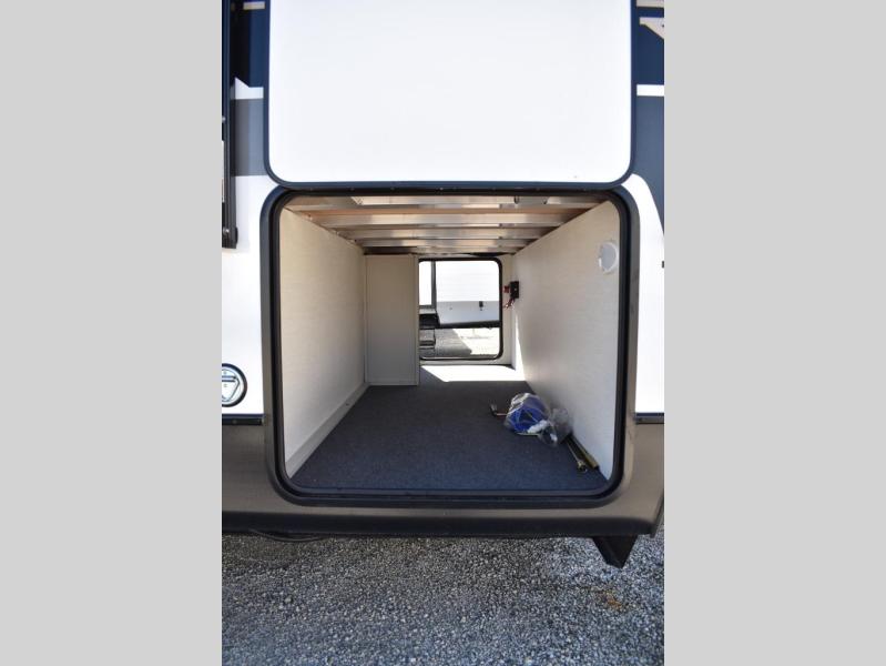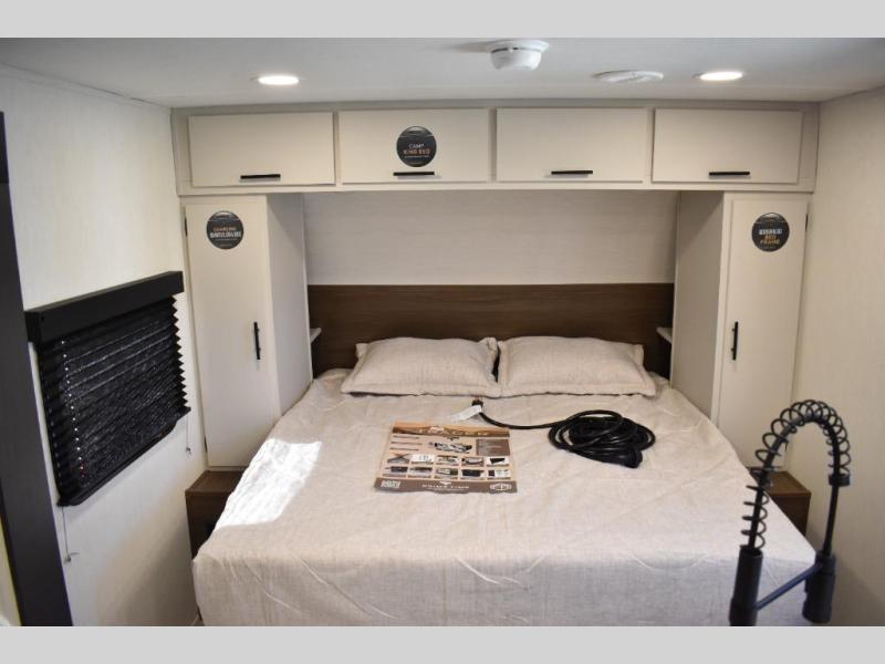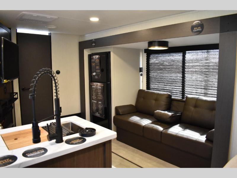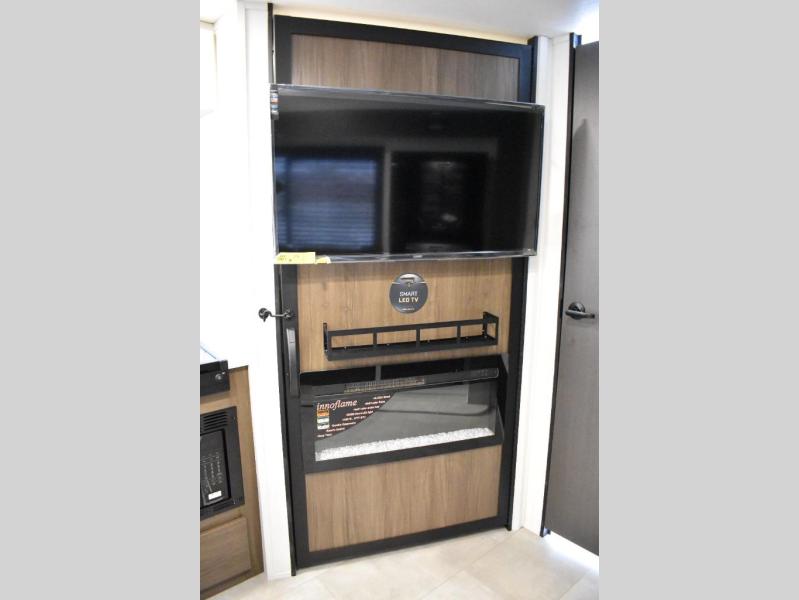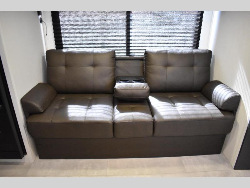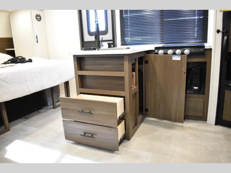 This travel trailer features an array of premium amenities! The spacious full rear shower provides a rejuvenating retreat, perfect for unwinding after a long day. The sophisticated entertainment center is ideal for cozy nights in, and the plush jackknife sofa offers a comfortable spot to relax or sleep. Generous storage space for your belongings is provided by ample overhead cabinets. Further, the gourmet kitchen is equipped with a convenient side 12V fridge, high-performance three-burner cooktop, and cleverly designed hidden pantry, making meal prep and cooking a true delight. Plus, the majestic front bedroom features a sumptuous king bed that will make you feel like you are sleeping in the clouds, expansive wardrobes, and overhead cabinets for storing your essentials.