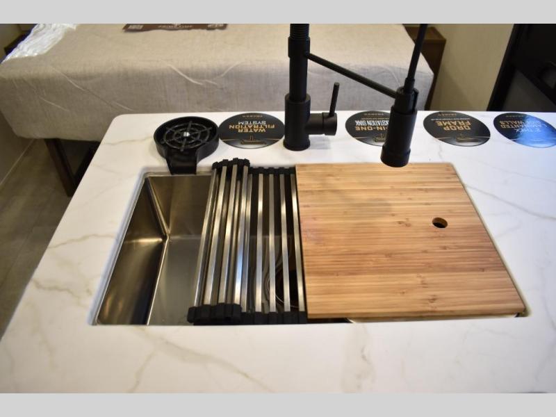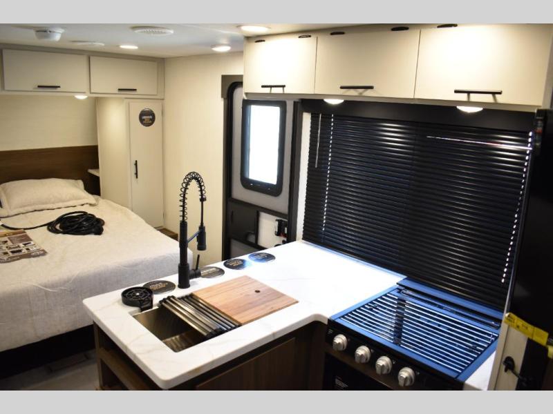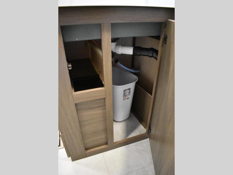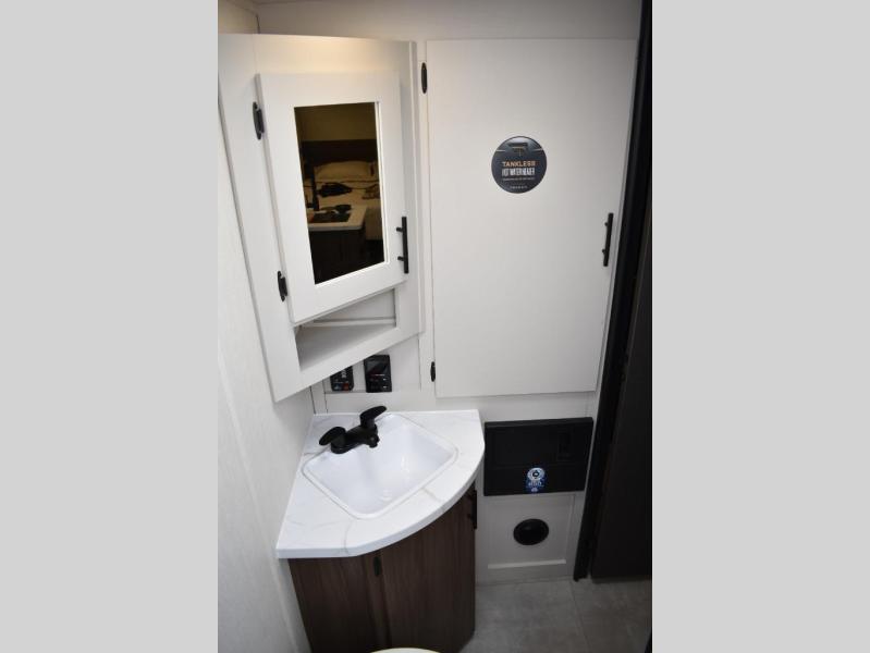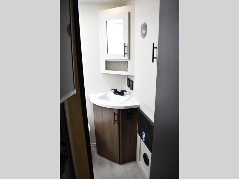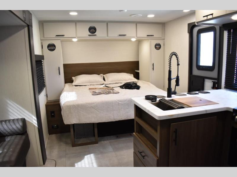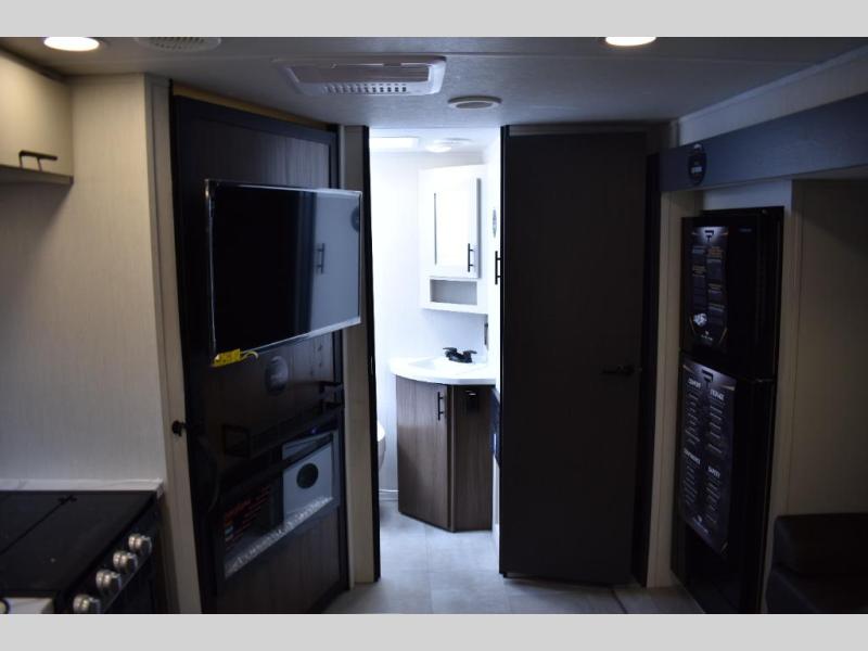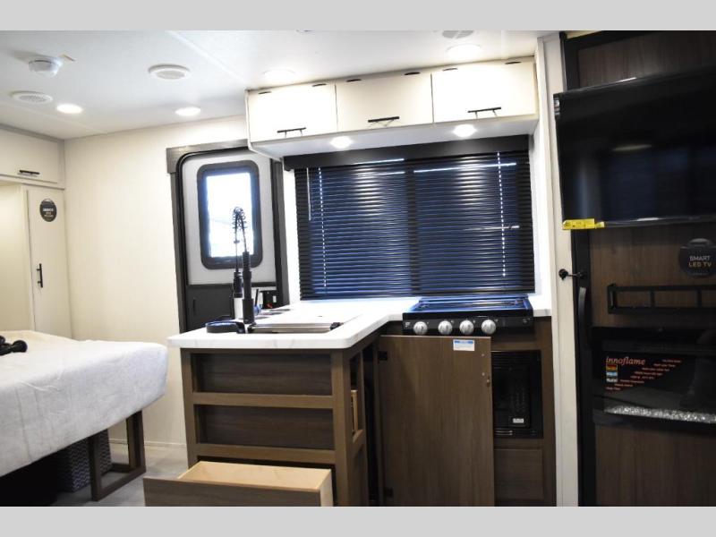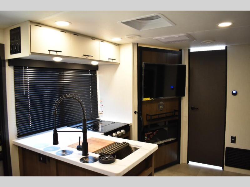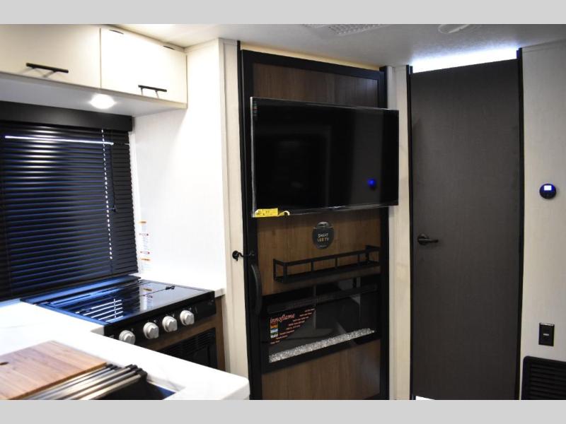 This travel trailer features an array of premium amenities! The spacious full rear shower provides a rejuvenating retreat, perfect for unwinding after a long day. The sophisticated entertainment center is ideal for cozy nights in, and the plush jackknife sofa offers a comfortable spot to relax or sleep. Generous storage space for your belongings is provided by ample overhead cabinets. Further, the gourmet kitchen is equipped with a convenient side 12V fridge, high-performance three-burner cooktop, and cleverly designed hidden pantry, making meal prep and cooking a true delight. Plus, the majestic front bedroom features a sumptuous king bed that will make you feel like you are sleeping in the clouds, expansive wardrobes, and overhead cabinets for storing your essentials.