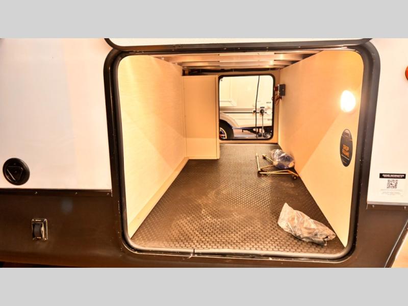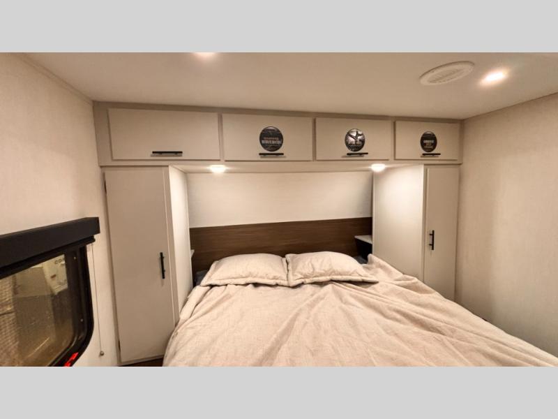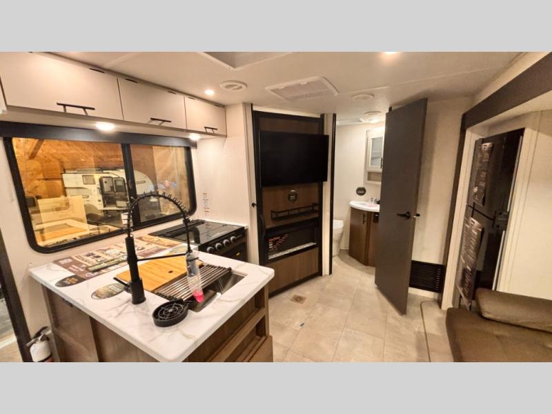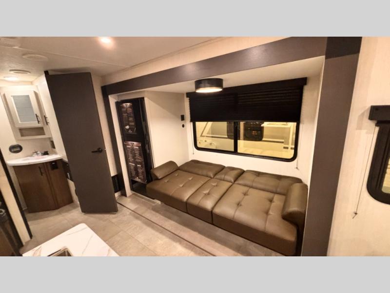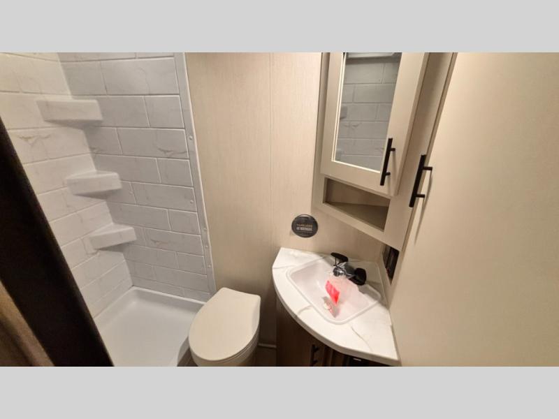 This travel trailer features an array of premium amenities! The spacious full rear shower provides a rejuvenating retreat, perfect for unwinding after a long day. The sophisticated entertainment center is ideal for cozy nights in, and the plush jackknife sofa offers a comfortable spot to relax or sleep. Generous storage space for your belongings is provided by ample overhead cabinets. Further, the gourmet kitchen is equipped with a convenient side 12V fridge, high-performance three-burner cooktop, and cleverly designed hidden pantry, making meal prep and cooking a true delight. Plus, the majestic front bedroom features a sumptuous king bed that will make you feel like you are sleeping in the clouds, expansive wardrobes, and overhead cabinets for storing your essentials.
