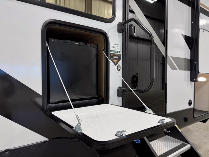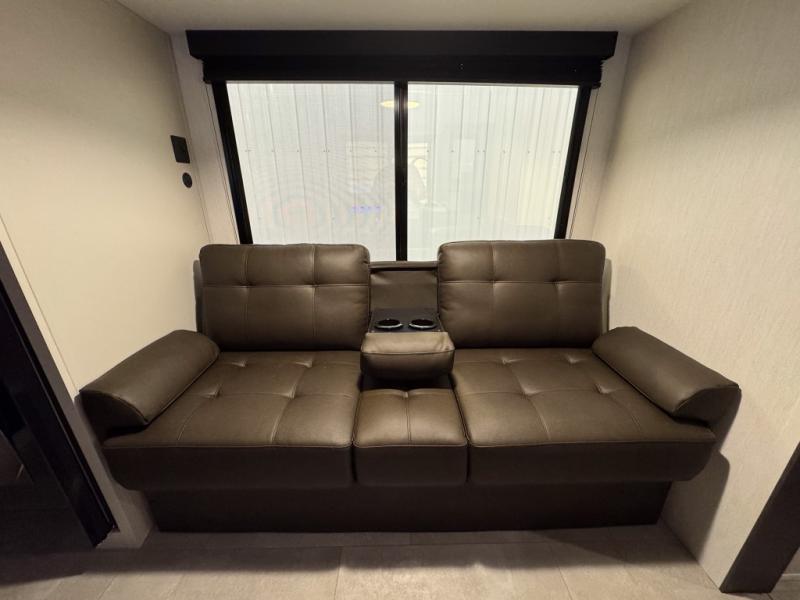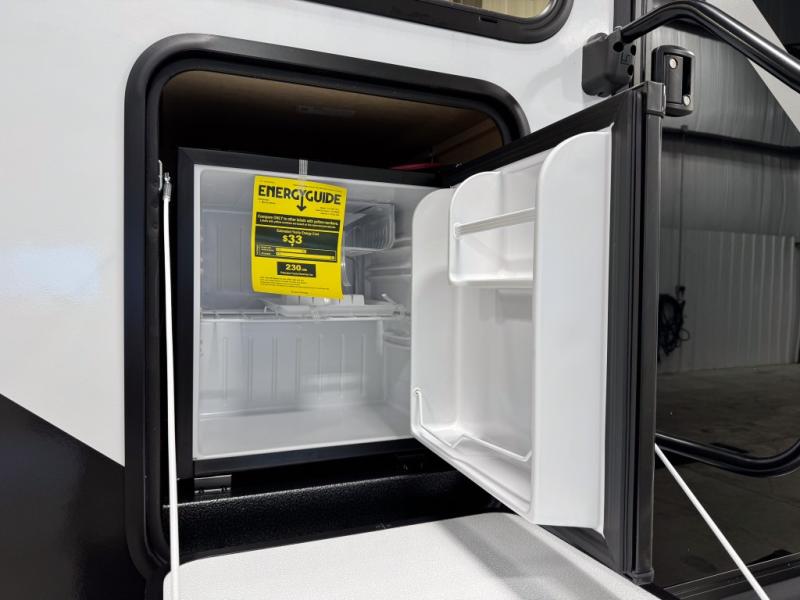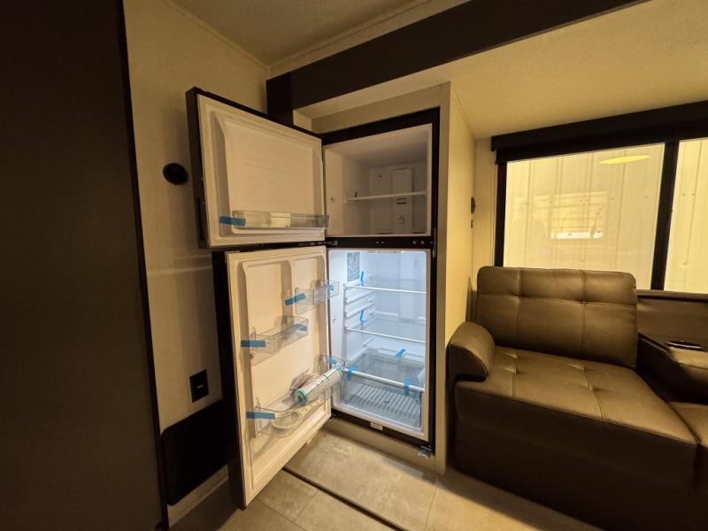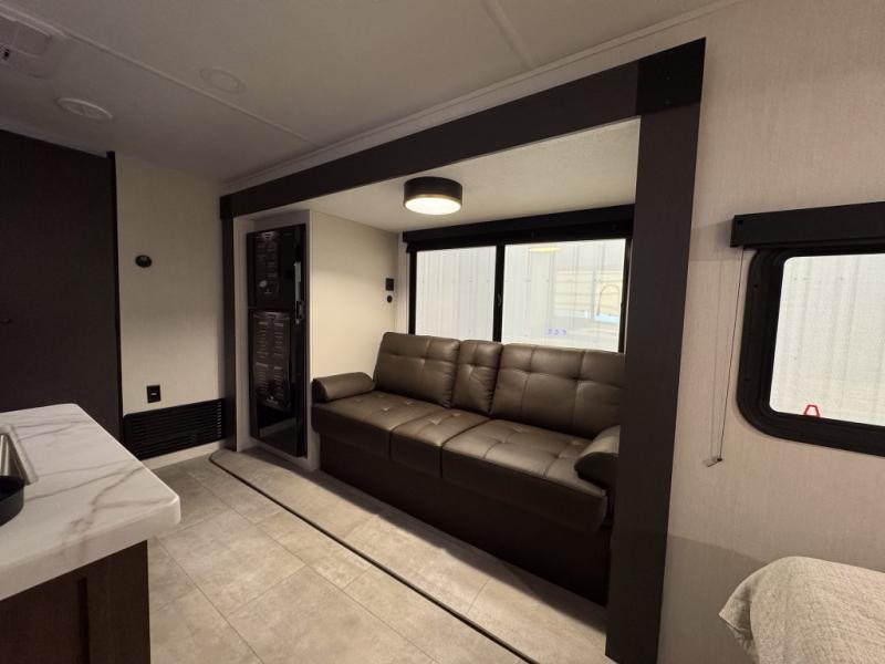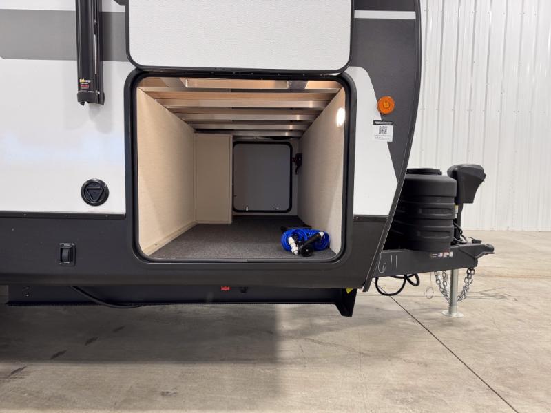 This travel trailer features an array of premium amenities! The spacious full rear shower provides a rejuvenating retreat, perfect for unwinding after a long day. The sophisticated entertainment center is ideal for cozy nights in, and the plush jackknife sofa offers a comfortable spot to relax or sleep. Generous storage space for your belongings is provided by ample overhead cabinets. Further, the gourmet kitchen is equipped with a convenient side 12V fridge, high-performance three-burner cooktop, and cleverly designed hidden pantry, making meal prep and cooking a true delight. Plus, the majestic front bedroom features a sumptuous king bed that will make you feel like you are sleeping in the clouds, expansive wardrobes, and overhead cabinets for storing your essentials.