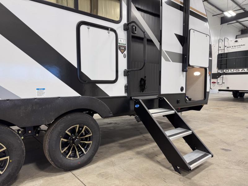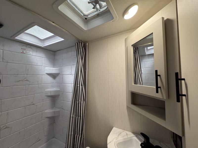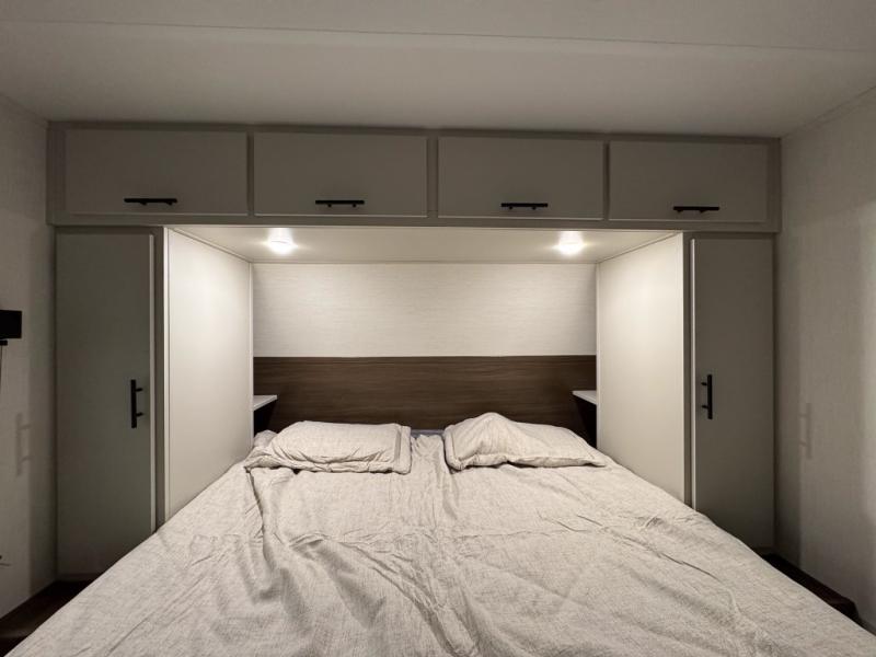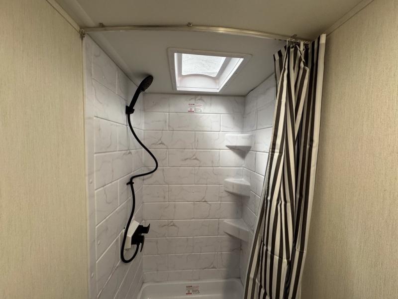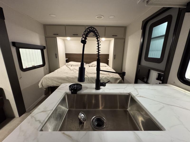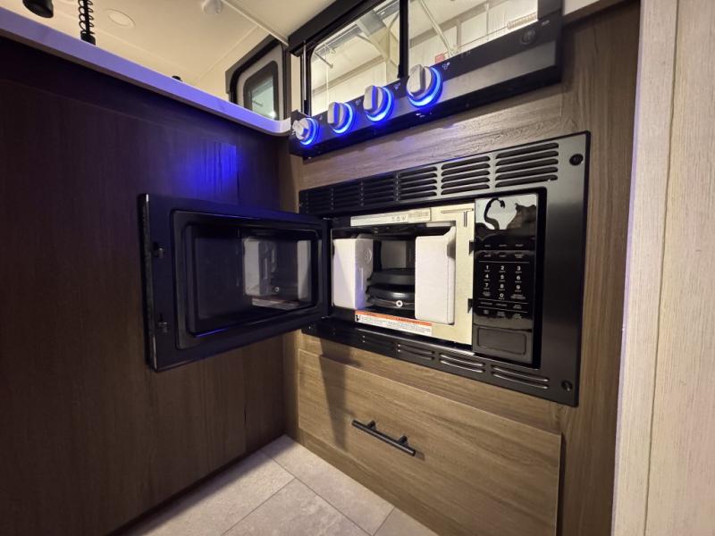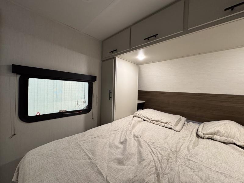 This travel trailer features an array of premium amenities! The spacious full rear shower provides a rejuvenating retreat, perfect for unwinding after a long day. The sophisticated entertainment center is ideal for cozy nights in, and the plush jackknife sofa offers a comfortable spot to relax or sleep. Generous storage space for your belongings is provided by ample overhead cabinets. Further, the gourmet kitchen is equipped with a convenient side 12V fridge, high-performance three-burner cooktop, and cleverly designed hidden pantry, making meal prep and cooking a true delight. Plus, the majestic front bedroom features a sumptuous king bed that will make you feel like you are sleeping in the clouds, expansive wardrobes, and overhead cabinets for storing your essentials.