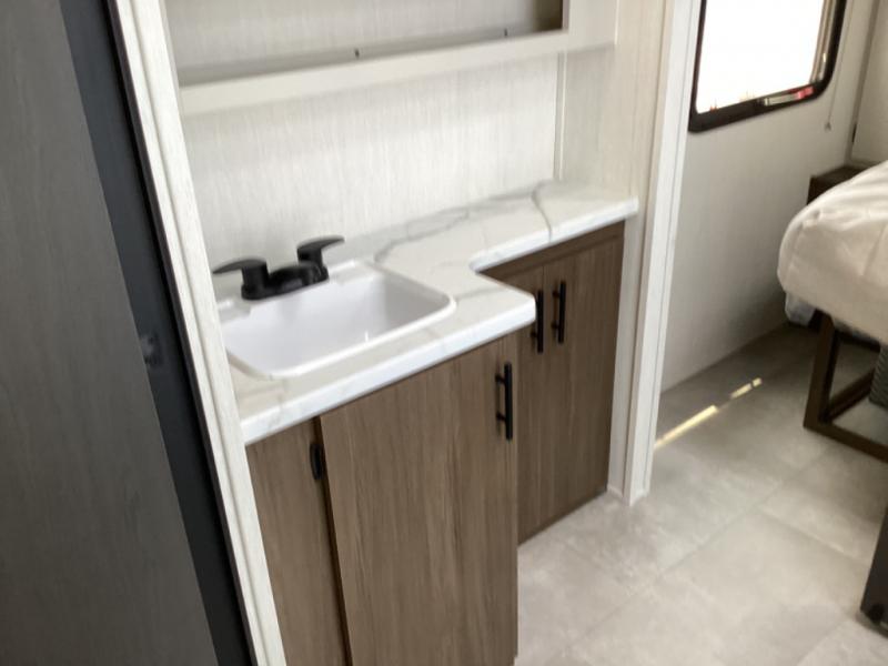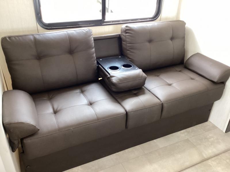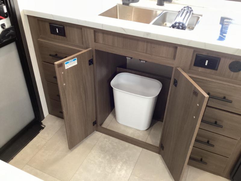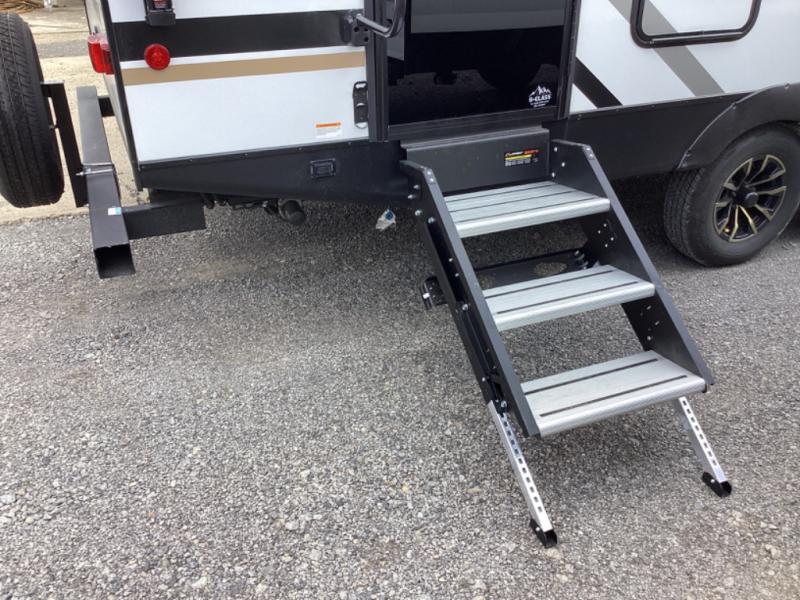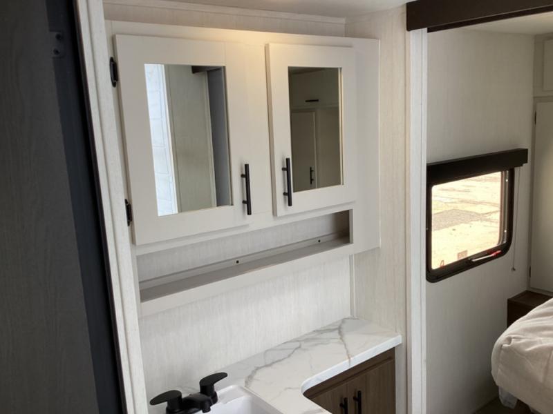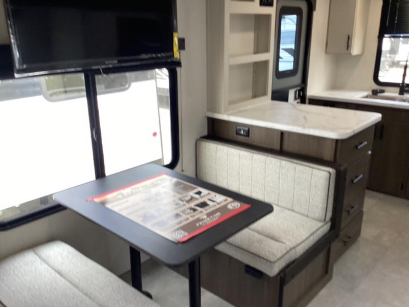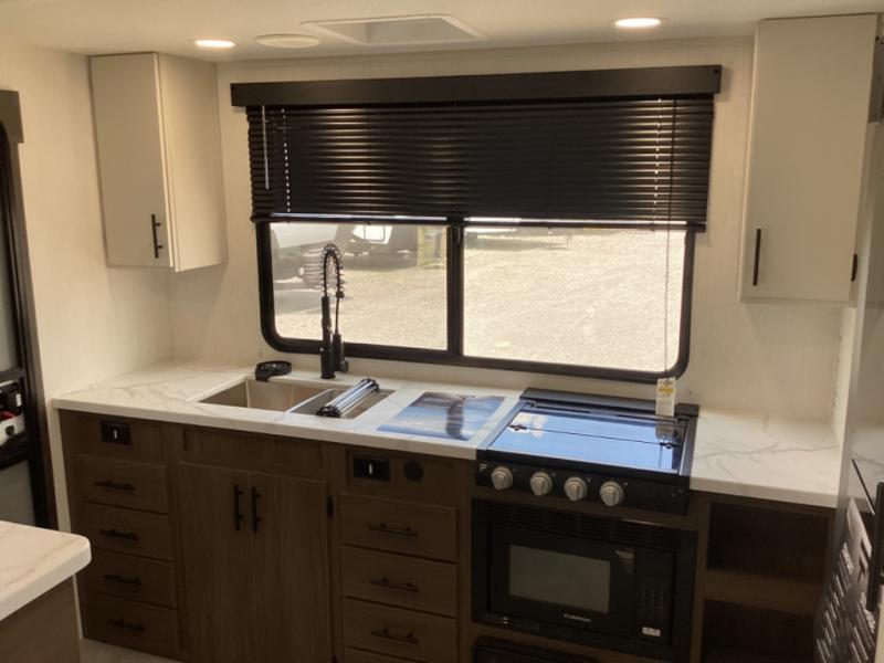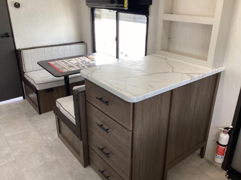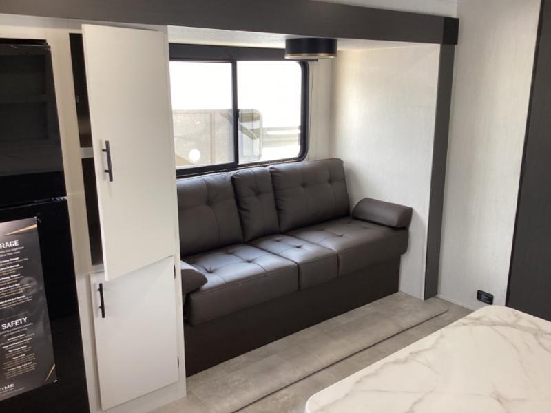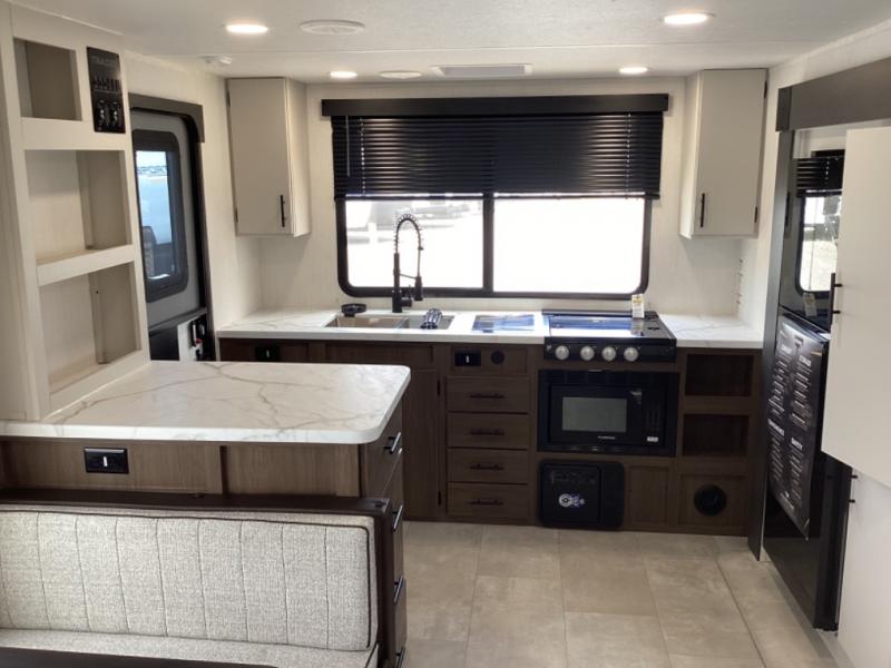 This travel trailer's modern rear kitchen is equipped with a reliable fridge, well-stocked pantry, and stylish hutch, making meal prep and storage a snap. The versatile jackknife sofa provides additional sleeping space or a cozy spot to unwind, while the intimate booth dinette is perfect for sharing meals or stories with loved ones. The crisp high-definition smart TV is ideal for entertainment on the go, and the practical walk-thru bathroom provides easy access. The serene front bedroom is a peaceful retreat, featuring a comfortable king bed, functional linen closet, spacious wardrobes, and ample overhead cabinets for storing your essentials. One of the standout features of this trailer is the two entry/exit doors, providing added convenience and flexibility.
