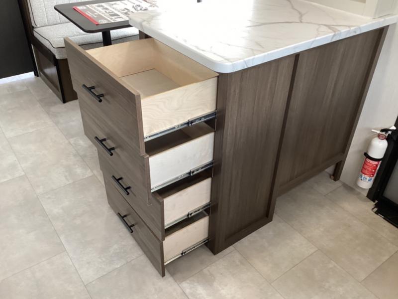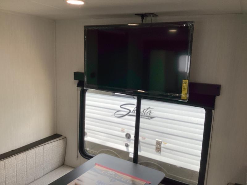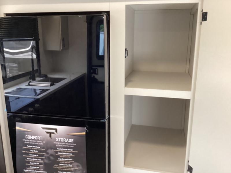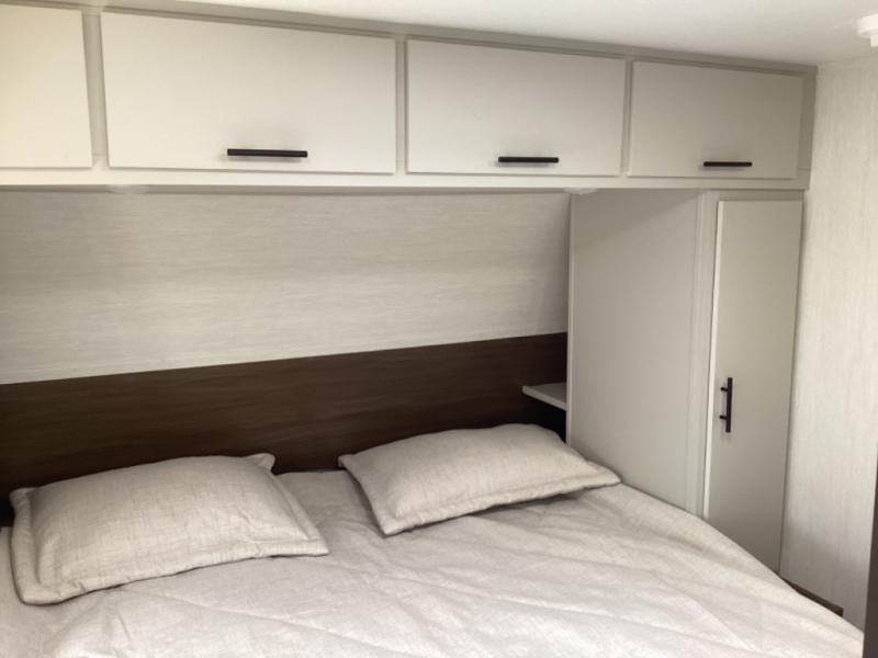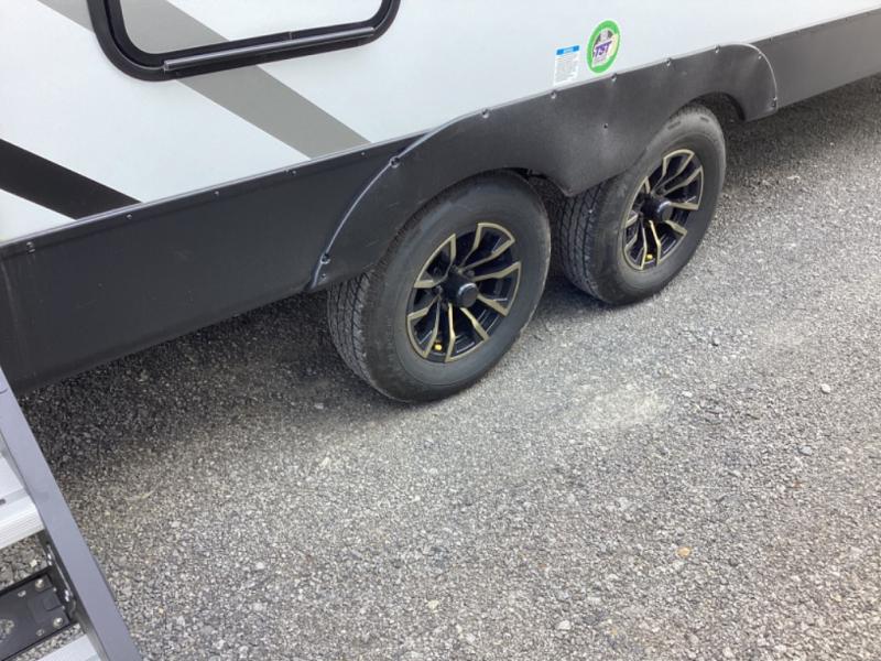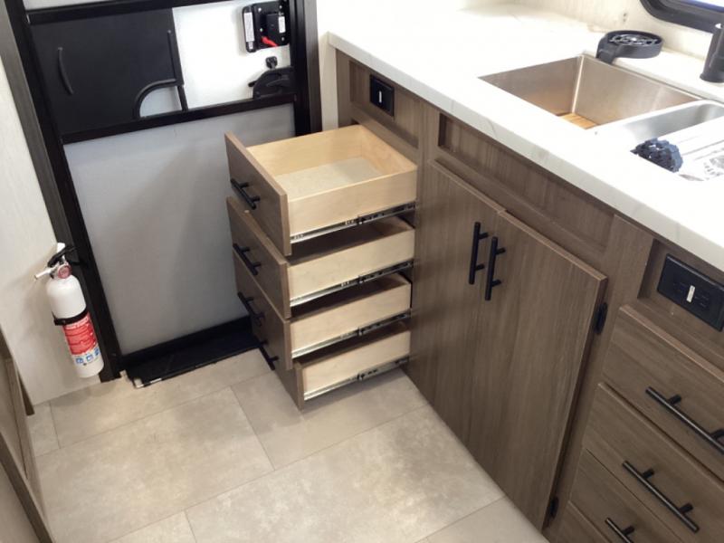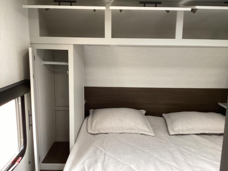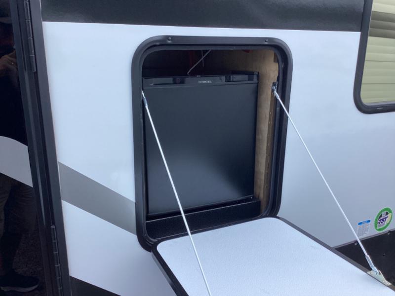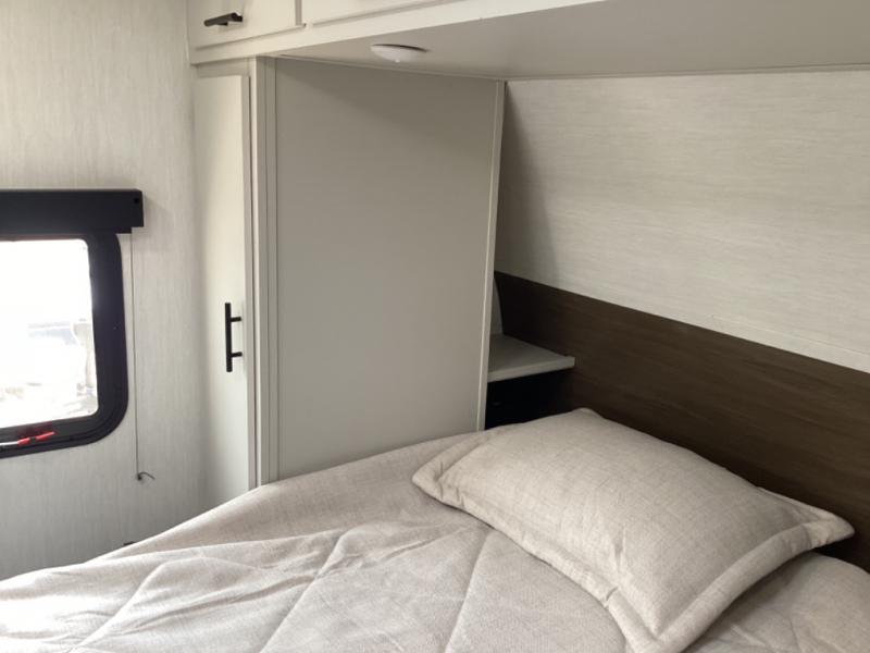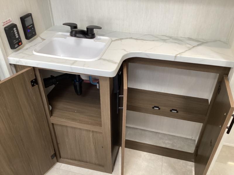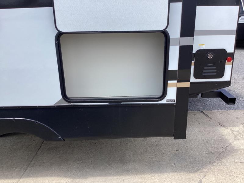 This travel trailer's modern rear kitchen is equipped with a reliable fridge, well-stocked pantry, and stylish hutch, making meal prep and storage a snap. The versatile jackknife sofa provides additional sleeping space or a cozy spot to unwind, while the intimate booth dinette is perfect for sharing meals or stories with loved ones. The crisp high-definition smart TV is ideal for entertainment on the go, and the practical walk-thru bathroom provides easy access. The serene front bedroom is a peaceful retreat, featuring a comfortable king bed, functional linen closet, spacious wardrobes, and ample overhead cabinets for storing your essentials. One of the standout features of this trailer is the two entry/exit doors, providing added convenience and flexibility.