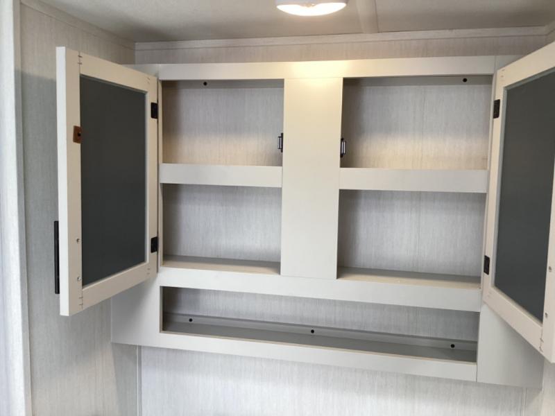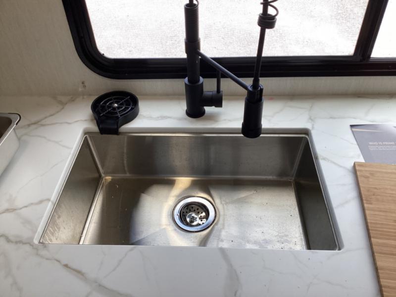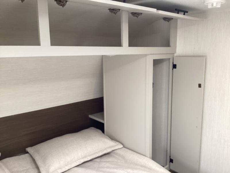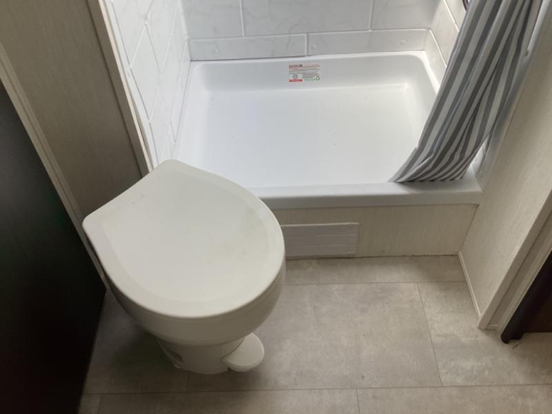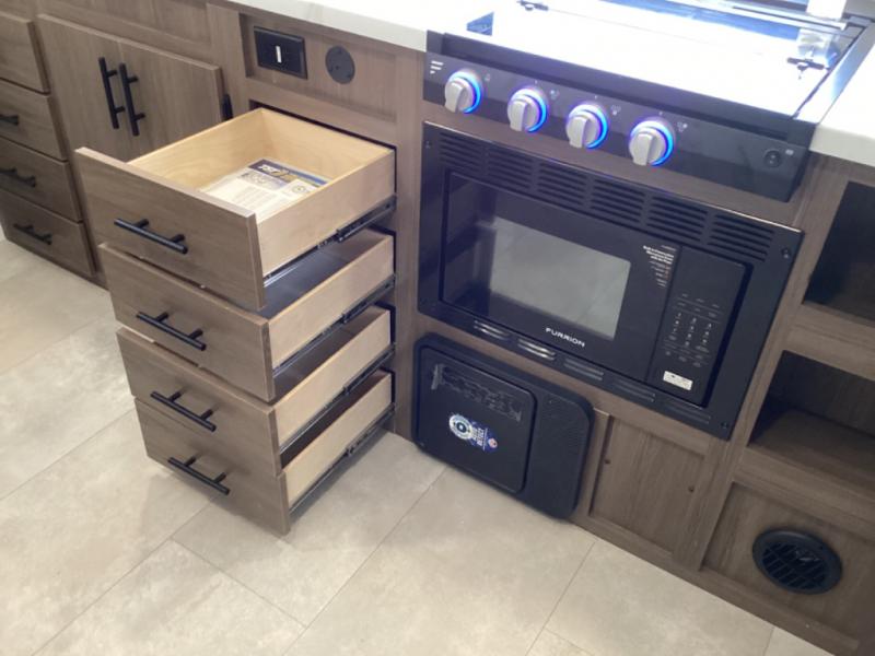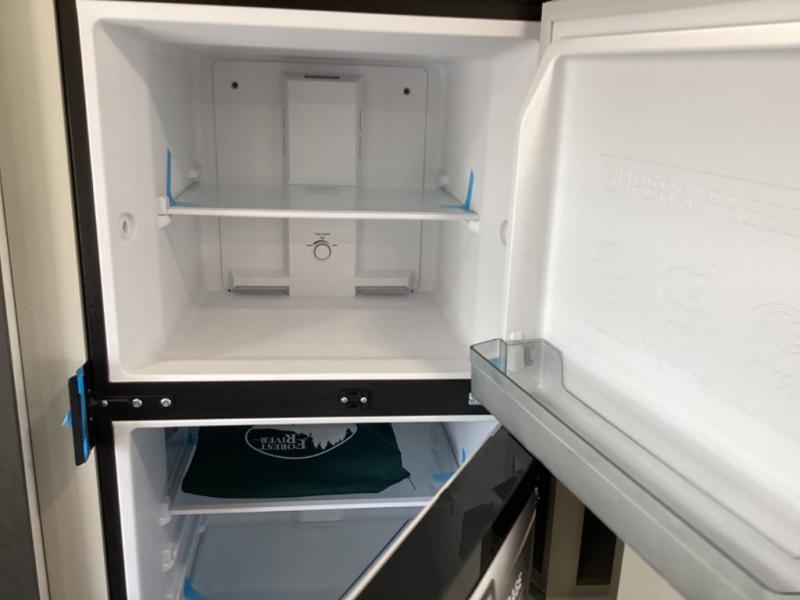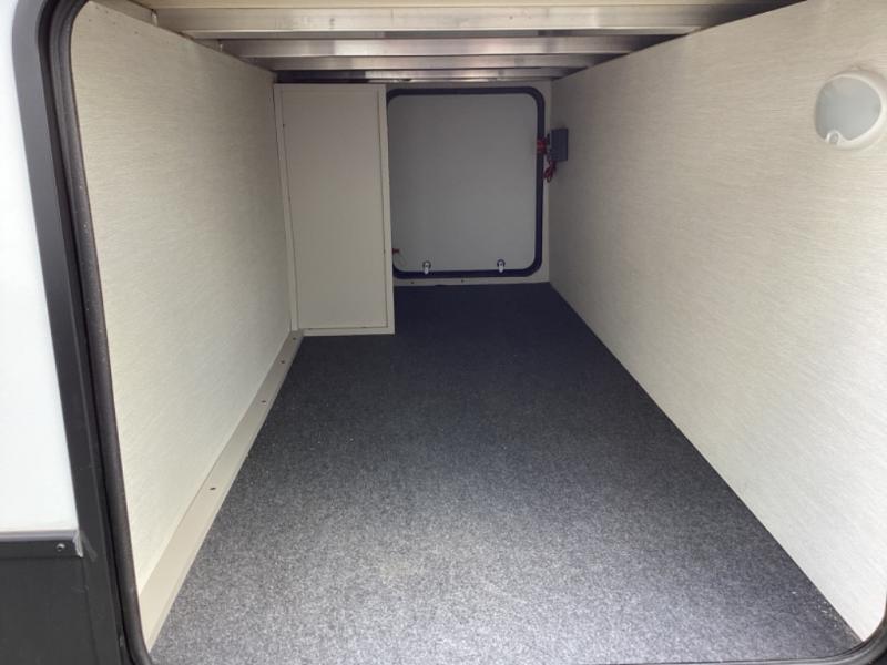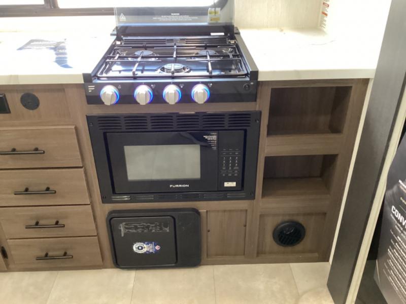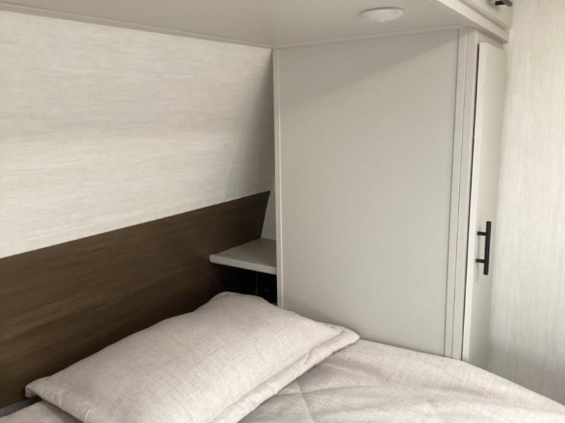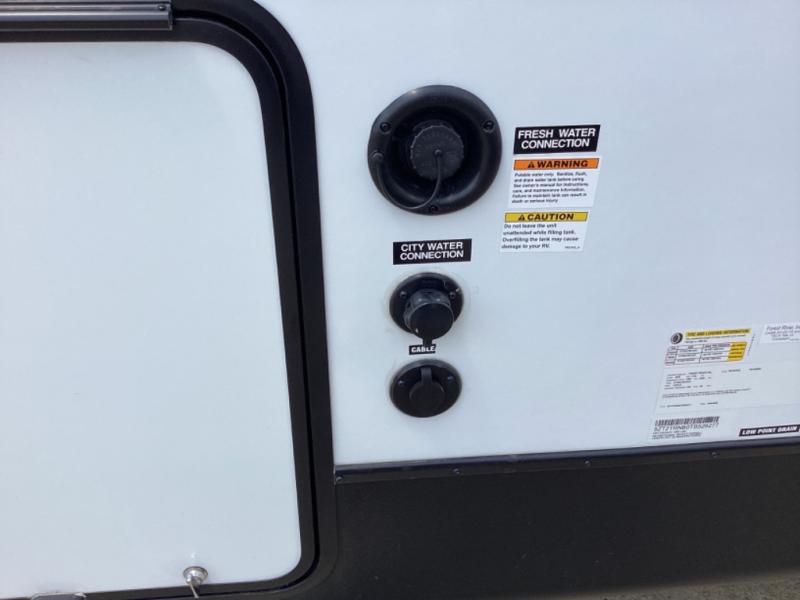 This travel trailer's modern rear kitchen is equipped with a reliable fridge, well-stocked pantry, and stylish hutch, making meal prep and storage a snap. The versatile jackknife sofa provides additional sleeping space or a cozy spot to unwind, while the intimate booth dinette is perfect for sharing meals or stories with loved ones. The crisp high-definition smart TV is ideal for entertainment on the go, and the practical walk-thru bathroom provides easy access. The serene front bedroom is a peaceful retreat, featuring a comfortable king bed, functional linen closet, spacious wardrobes, and ample overhead cabinets for storing your essentials. One of the standout features of this trailer is the two entry/exit doors, providing added convenience and flexibility.