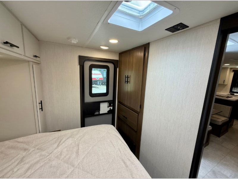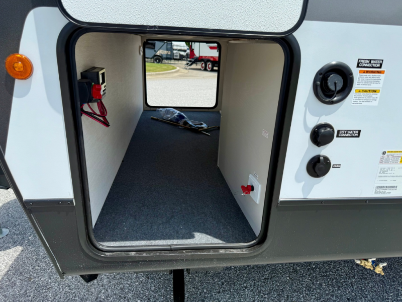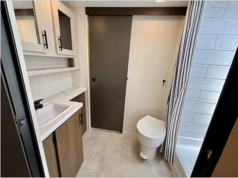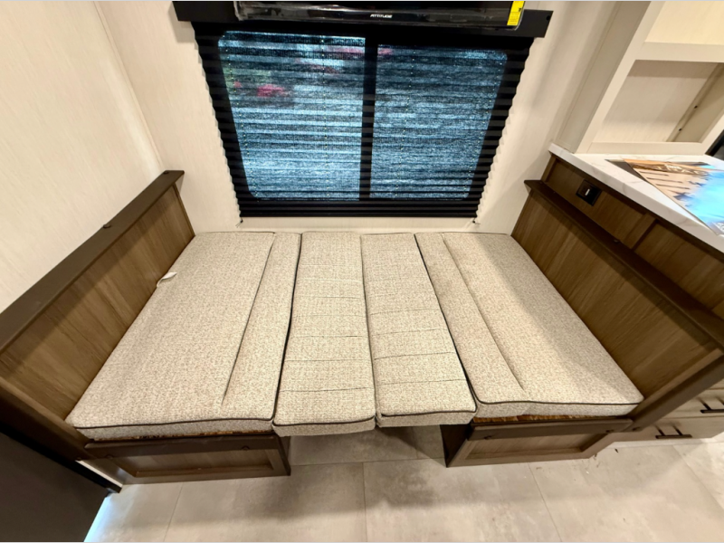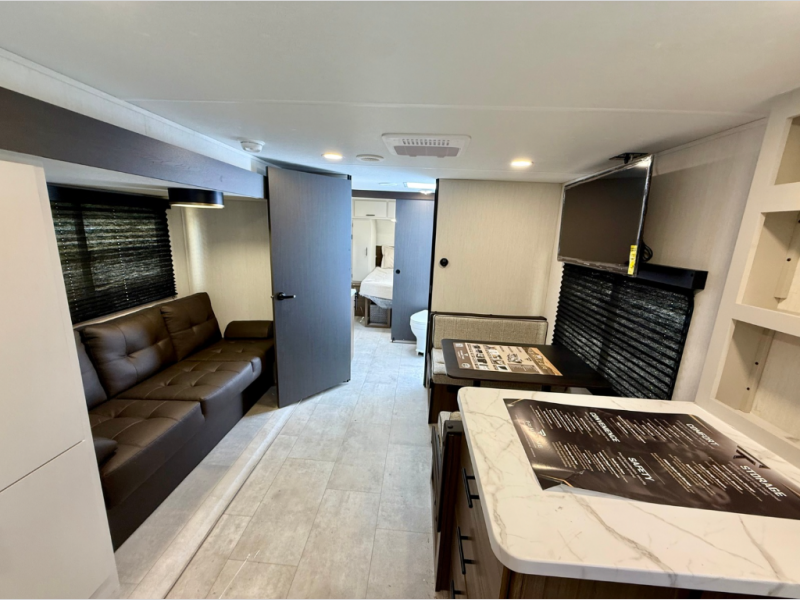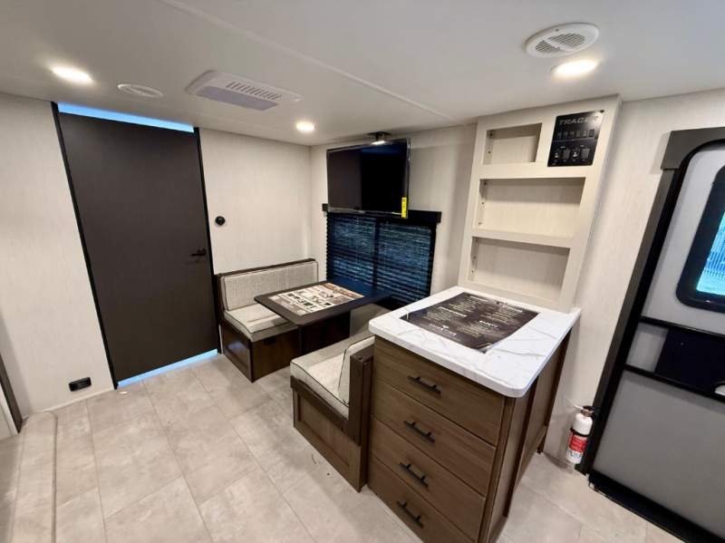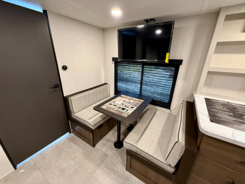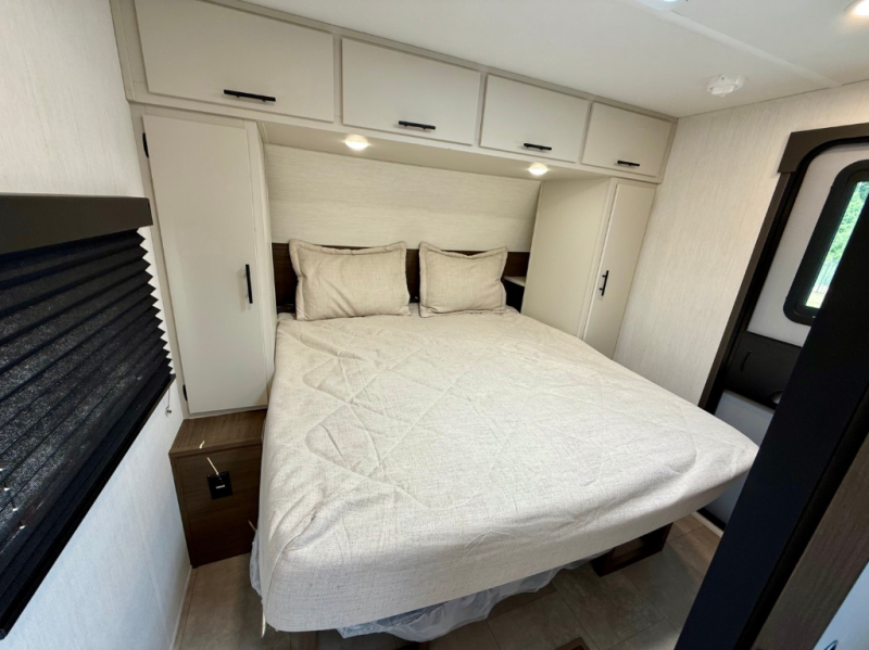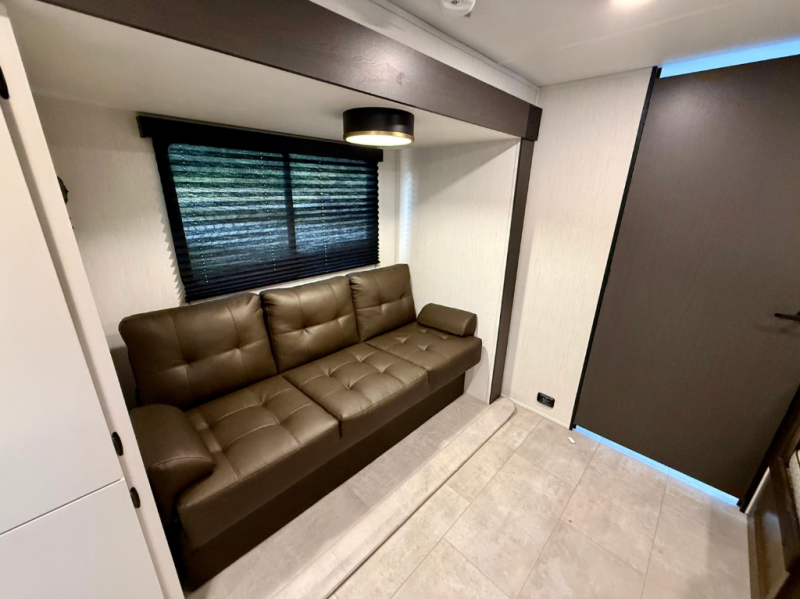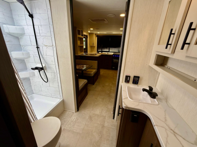 This travel trailer's modern rear kitchen is equipped with a reliable fridge, well-stocked pantry, and stylish hutch, making meal prep and storage a snap. The versatile jackknife sofa provides additional sleeping space or a cozy spot to unwind, while the intimate booth dinette is perfect for sharing meals or stories with loved ones. The crisp high-definition smart TV is ideal for entertainment on the go, and the practical walk-thru bathroom provides easy access. The serene front bedroom is a peaceful retreat, featuring a comfortable king bed, functional linen closet, spacious wardrobes, and ample overhead cabinets for storing your essentials. One of the standout features of this trailer is the two entry/exit doors, providing added convenience and flexibility.