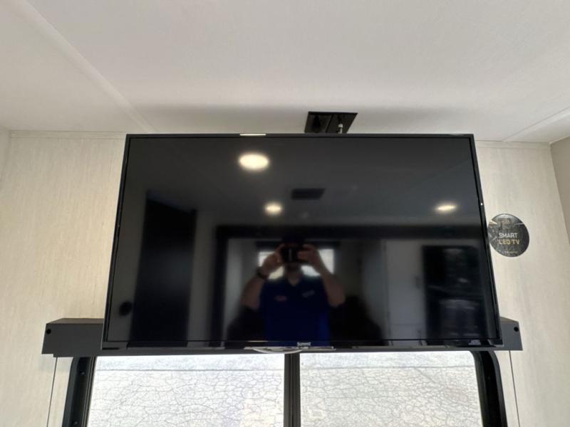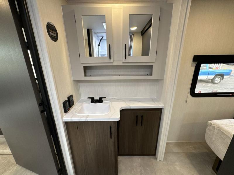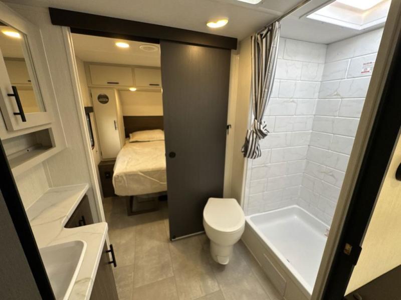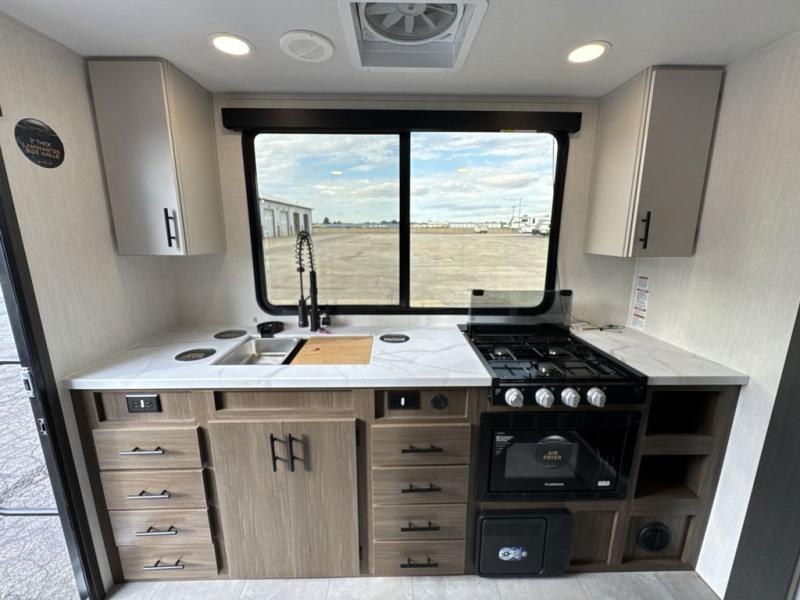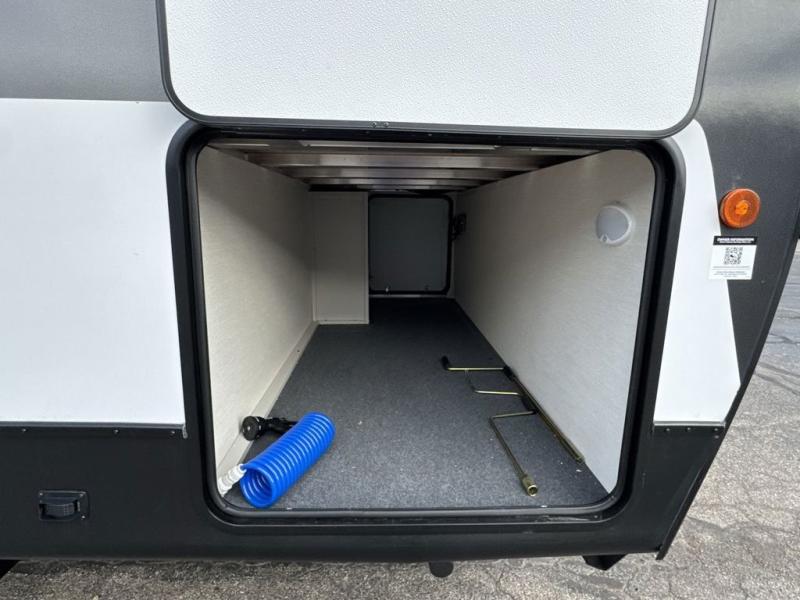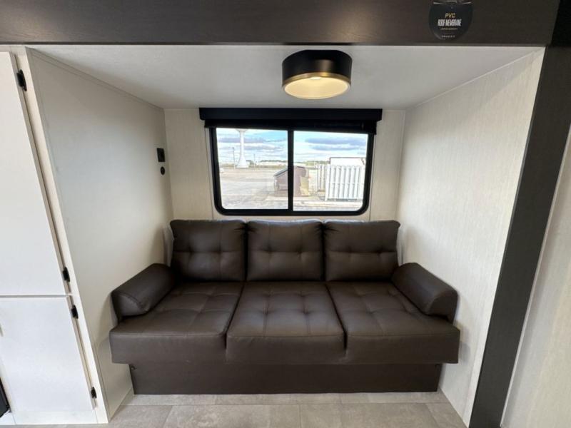 This travel trailer's modern rear kitchen is equipped with a reliable fridge, well-stocked pantry, and stylish hutch, making meal prep and storage a snap. The versatile jackknife sofa provides additional sleeping space or a cozy spot to unwind, while the intimate booth dinette is perfect for sharing meals or stories with loved ones. The crisp high-definition smart TV is ideal for entertainment on the go, and the practical walk-thru bathroom provides easy access. The serene front bedroom is a peaceful retreat, featuring a comfortable king bed, functional linen closet, spacious wardrobes, and ample overhead cabinets for storing your essentials. One of the standout features of this trailer is the two entry/exit doors, providing added convenience and flexibility.