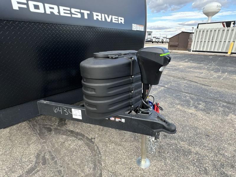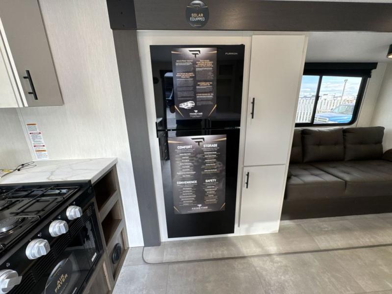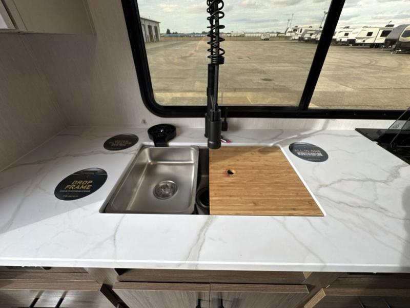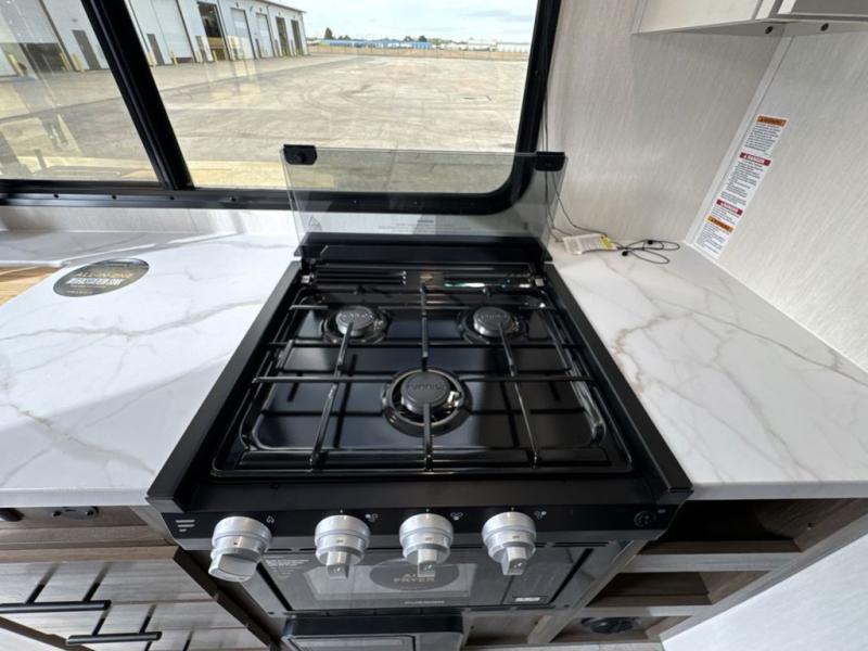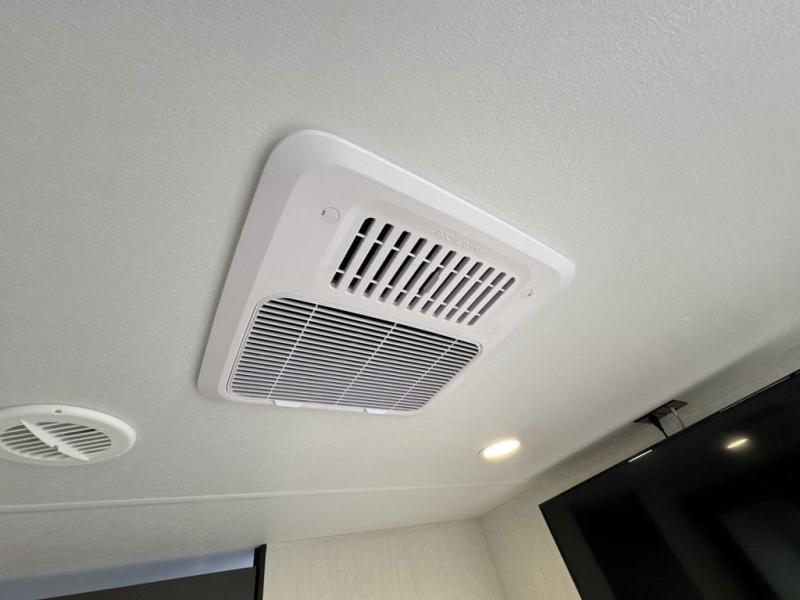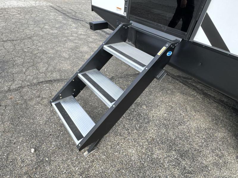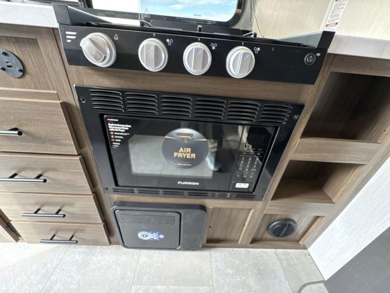 This travel trailer's modern rear kitchen is equipped with a reliable fridge, well-stocked pantry, and stylish hutch, making meal prep and storage a snap. The versatile jackknife sofa provides additional sleeping space or a cozy spot to unwind, while the intimate booth dinette is perfect for sharing meals or stories with loved ones. The crisp high-definition smart TV is ideal for entertainment on the go, and the practical walk-thru bathroom provides easy access. The serene front bedroom is a peaceful retreat, featuring a comfortable king bed, functional linen closet, spacious wardrobes, and ample overhead cabinets for storing your essentials. One of the standout features of this trailer is the two entry/exit doors, providing added convenience and flexibility.