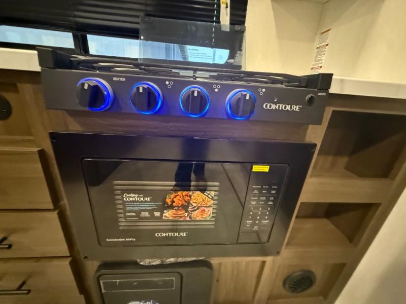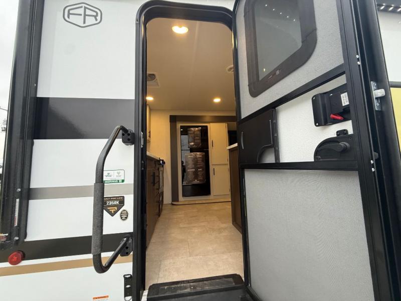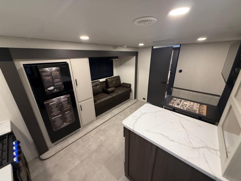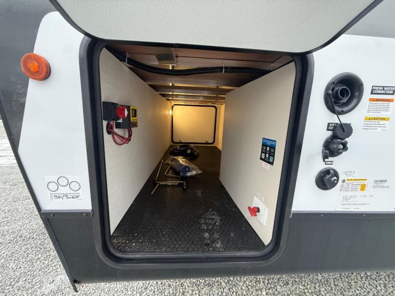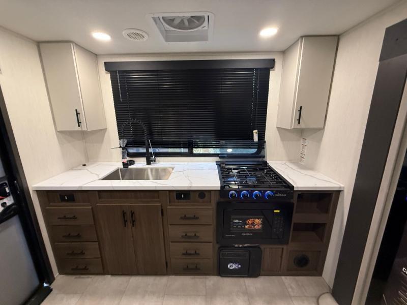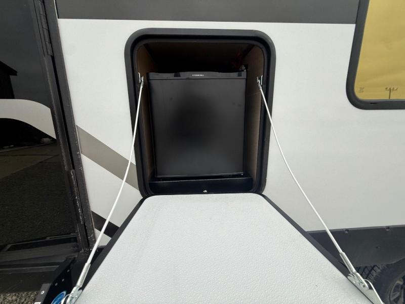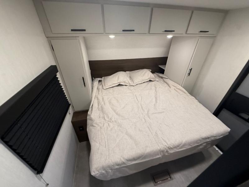 This travel trailer's modern rear kitchen is equipped with a reliable fridge, well-stocked pantry, and stylish hutch, making meal prep and storage a snap. The versatile jackknife sofa provides additional sleeping space or a cozy spot to unwind, while the intimate booth dinette is perfect for sharing meals or stories with loved ones. The crisp high-definition smart TV is ideal for entertainment on the go, and the practical walk-thru bathroom provides easy access. The serene front bedroom is a peaceful retreat, featuring a comfortable king bed, functional linen closet, spacious wardrobes, and ample overhead cabinets for storing your essentials. One of the standout features of this trailer is the two entry/exit doors, providing added convenience and flexibility.