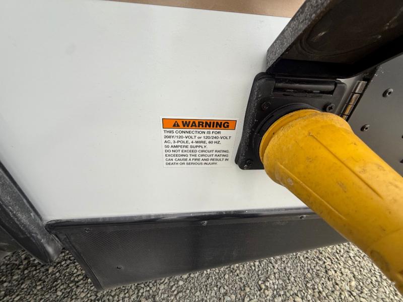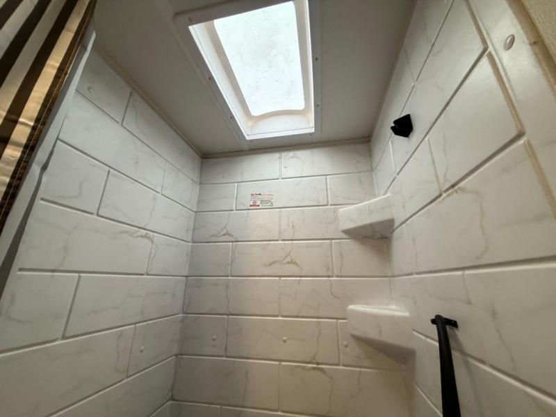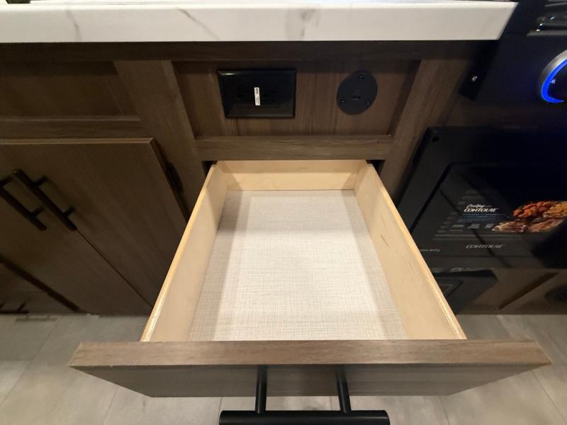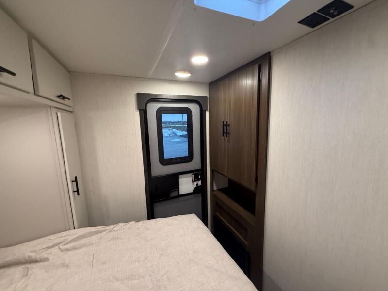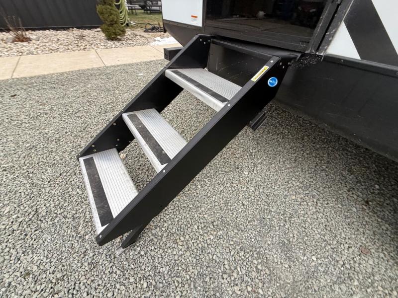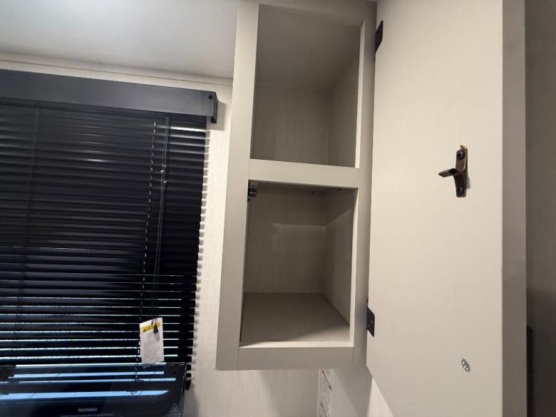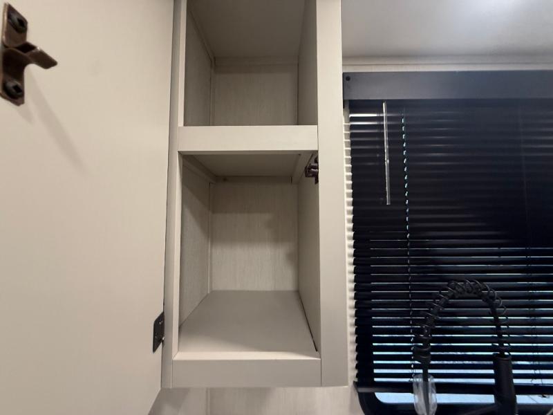 This travel trailer's modern rear kitchen is equipped with a reliable fridge, well-stocked pantry, and stylish hutch, making meal prep and storage a snap. The versatile jackknife sofa provides additional sleeping space or a cozy spot to unwind, while the intimate booth dinette is perfect for sharing meals or stories with loved ones. The crisp high-definition smart TV is ideal for entertainment on the go, and the practical walk-thru bathroom provides easy access. The serene front bedroom is a peaceful retreat, featuring a comfortable king bed, functional linen closet, spacious wardrobes, and ample overhead cabinets for storing your essentials. One of the standout features of this trailer is the two entry/exit doors, providing added convenience and flexibility.