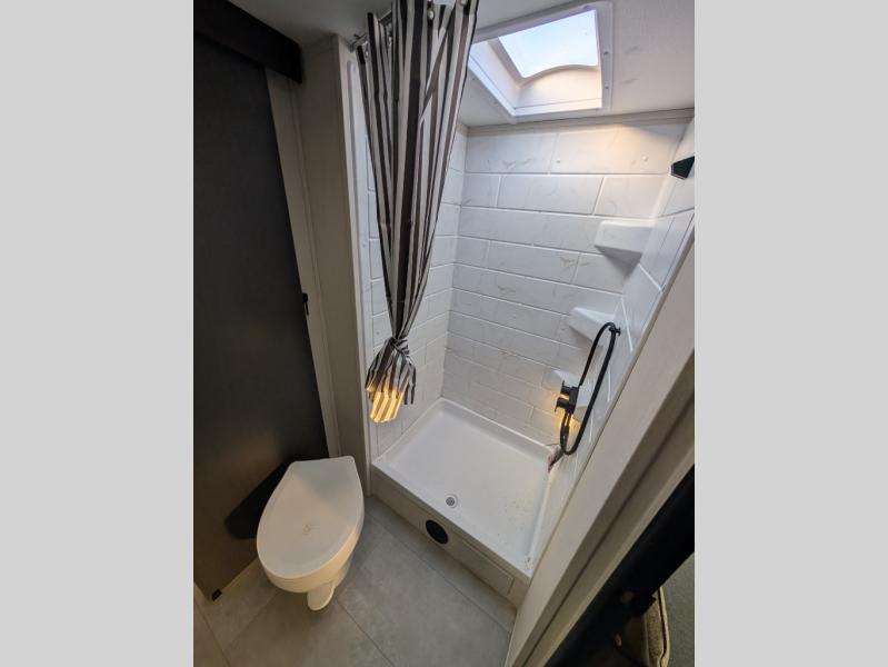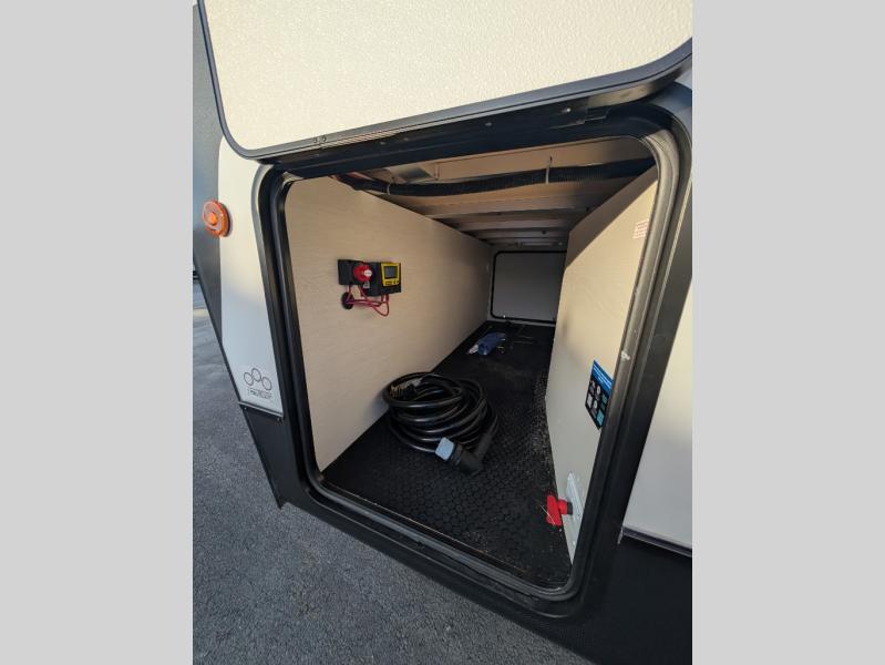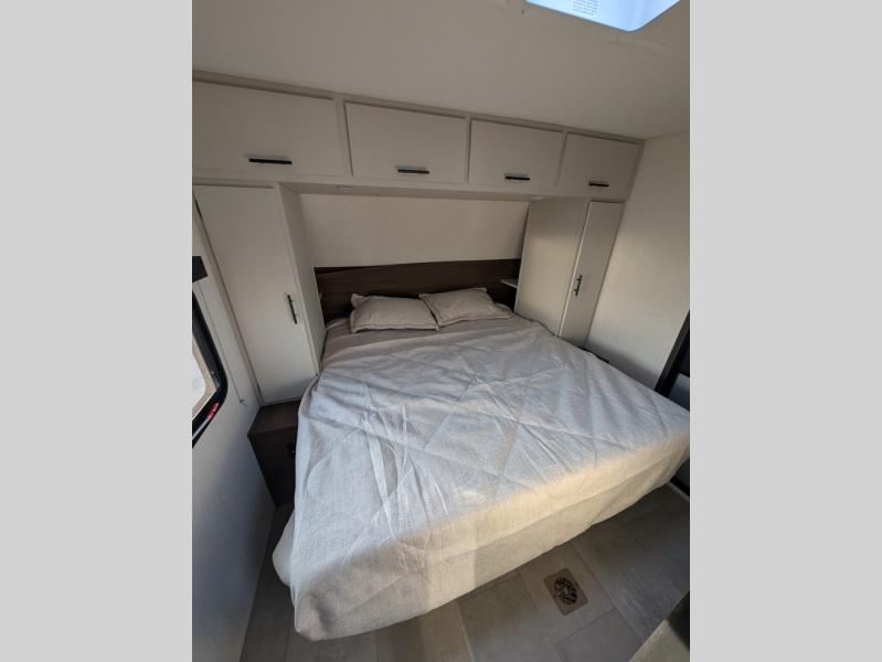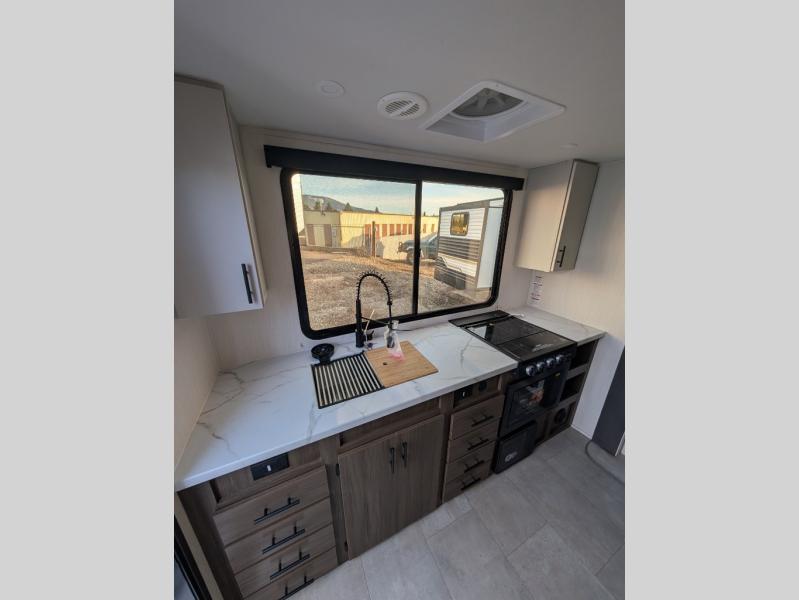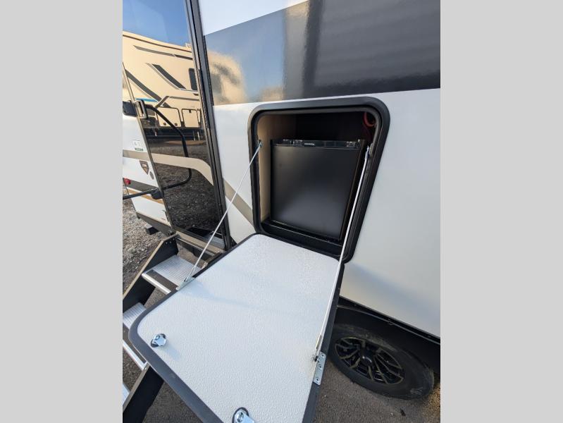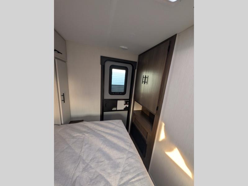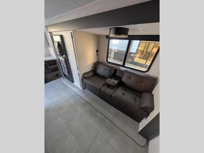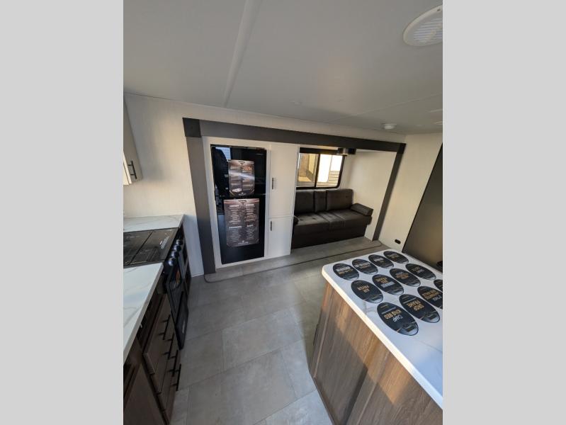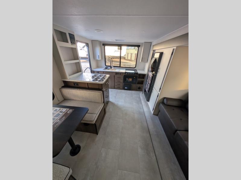 This travel trailer's modern rear kitchen is equipped with a reliable fridge, well-stocked pantry, and stylish hutch, making meal prep and storage a snap. The versatile jackknife sofa provides additional sleeping space or a cozy spot to unwind, while the intimate booth dinette is perfect for sharing meals or stories with loved ones. The crisp high-definition smart TV is ideal for entertainment on the go, and the practical walk-thru bathroom provides easy access. The serene front bedroom is a peaceful retreat, featuring a comfortable king bed, functional linen closet, spacious wardrobes, and ample overhead cabinets for storing your essentials. One of the standout features of this trailer is the two entry/exit doors, providing added convenience and flexibility.
