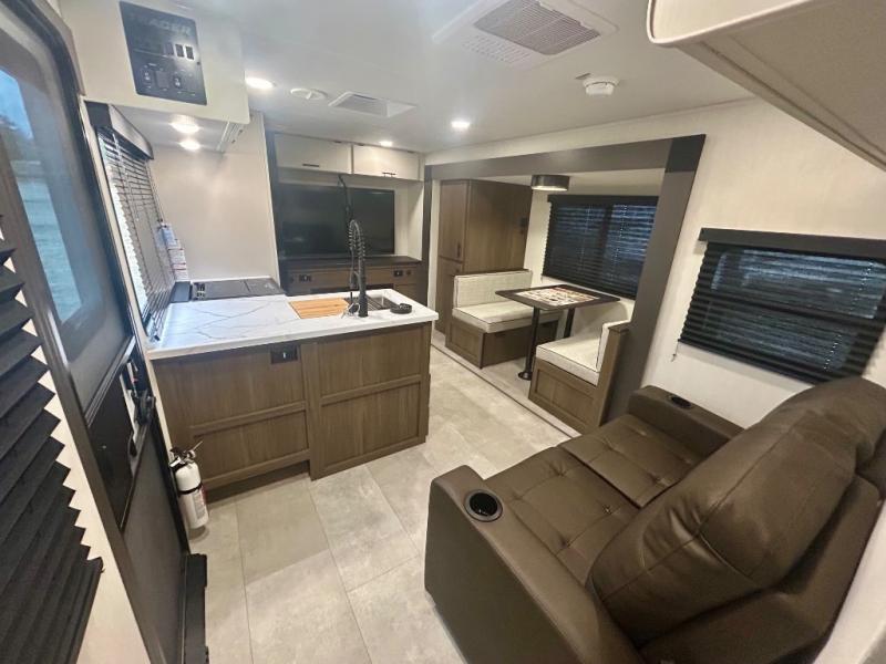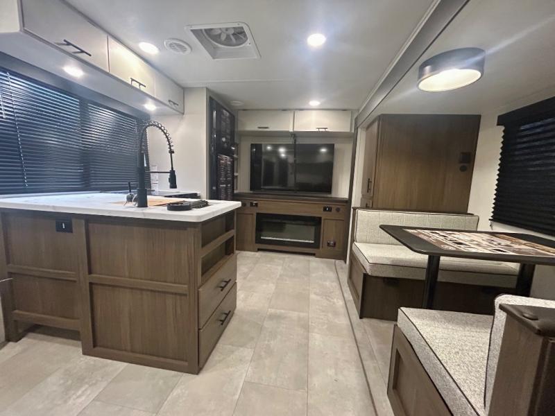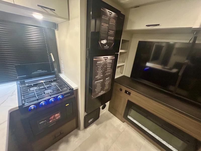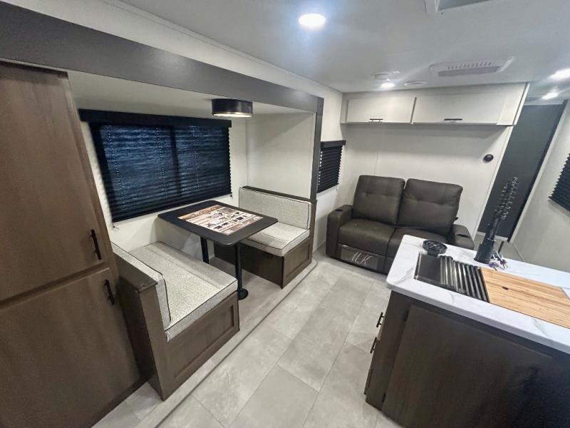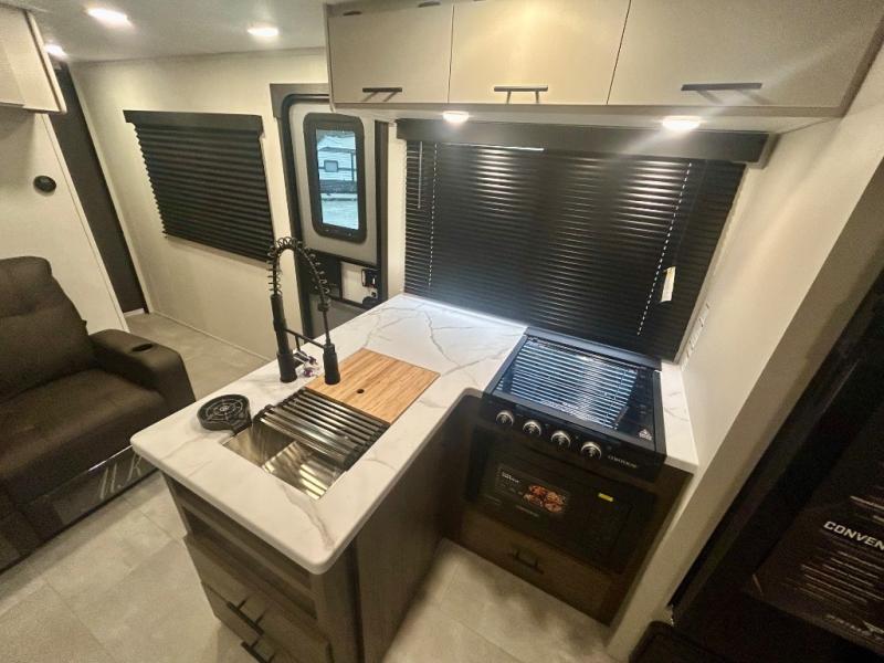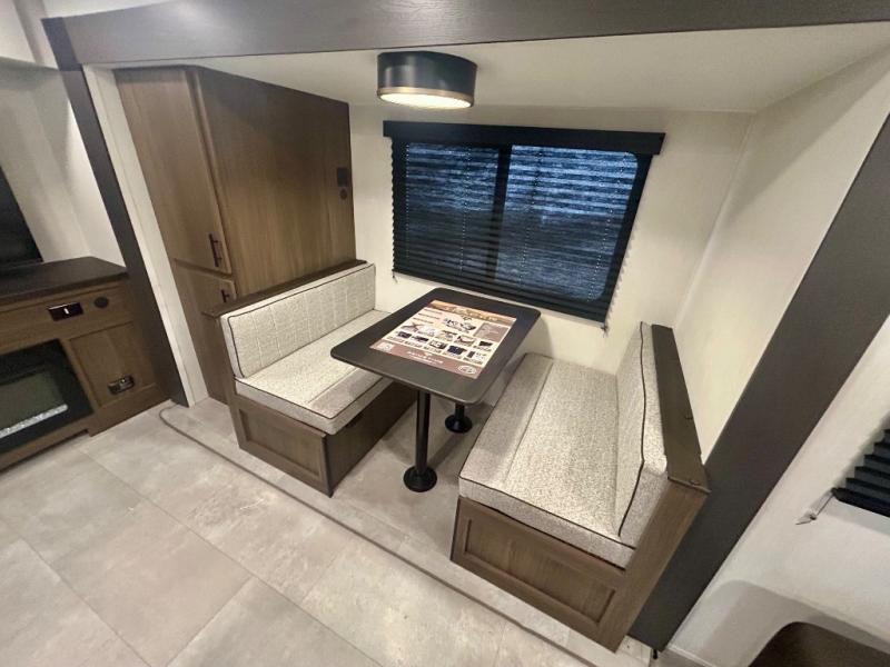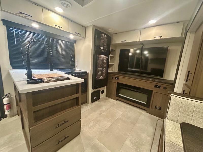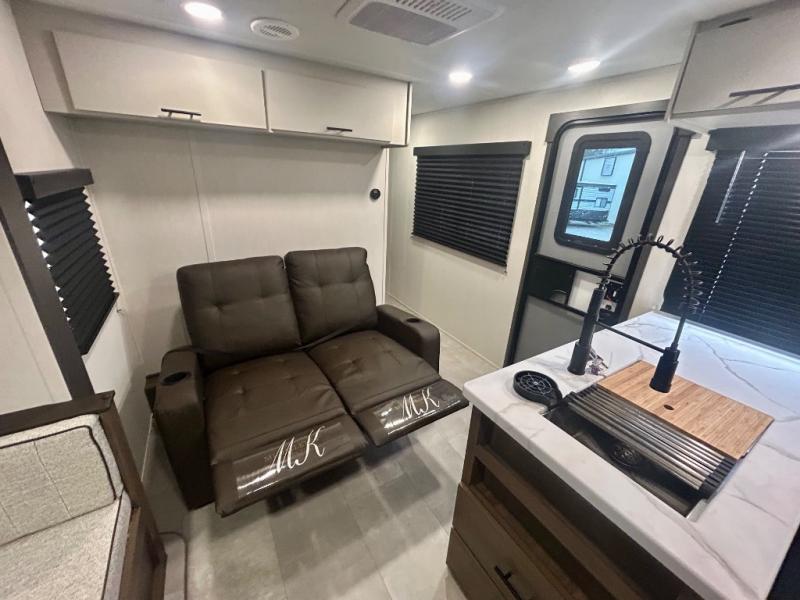 This travel trailer's modern rear kitchen is equipped with a reliable fridge, well-stocked pantry, and even a fireplace, making meal prep and cooking a great experience. The theater seating offers a cozy spot to unwind, while the dinette is perfect for sharing meals or stories with loved ones. The air fryer cooktop will also be useful for some easy delicious meals on the go, and the practical full bathroom to freshen up. The serene front bedroom is a peaceful retreat, featuring a comfortable camp king bed, spacious wardrobes, and ample overhead cabinets for storing your essentials.
