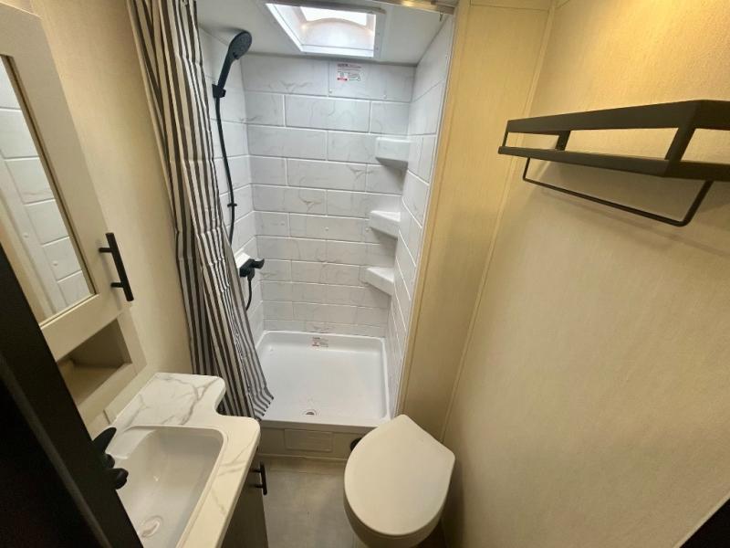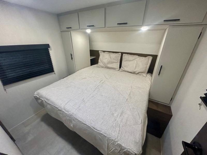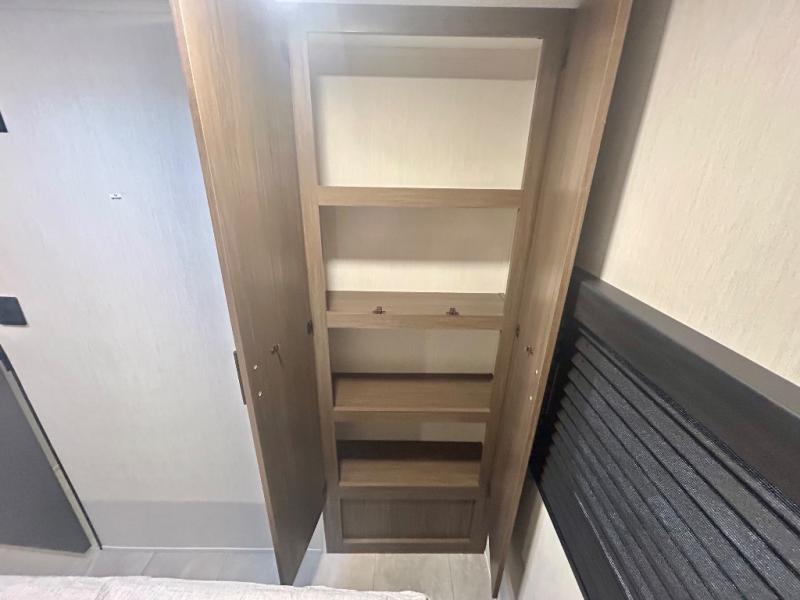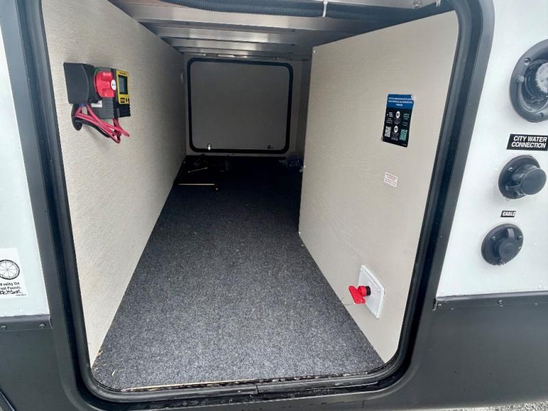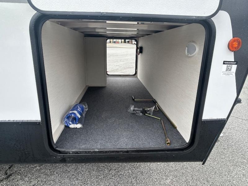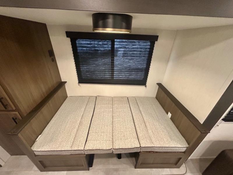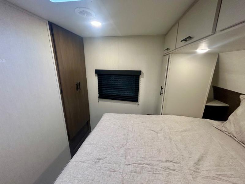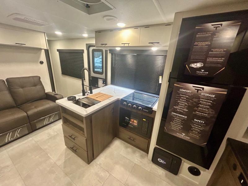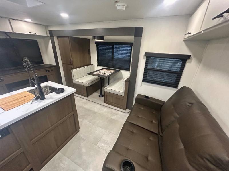 This travel trailer's modern rear kitchen is equipped with a reliable fridge, well-stocked pantry, and even a fireplace, making meal prep and cooking a great experience. The theater seating offers a cozy spot to unwind, while the dinette is perfect for sharing meals or stories with loved ones. The air fryer cooktop will also be useful for some easy delicious meals on the go, and the practical full bathroom to freshen up. The serene front bedroom is a peaceful retreat, featuring a comfortable camp king bed, spacious wardrobes, and ample overhead cabinets for storing your essentials.