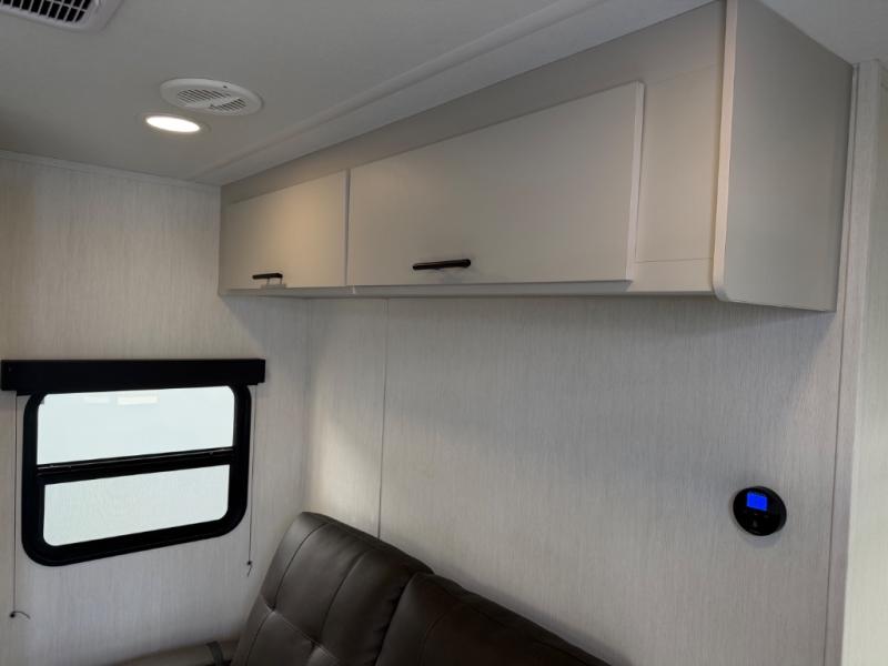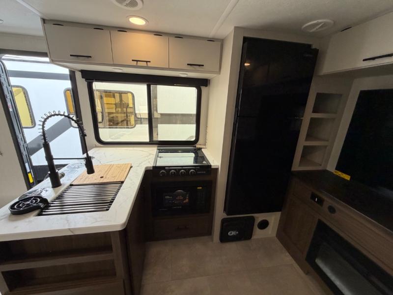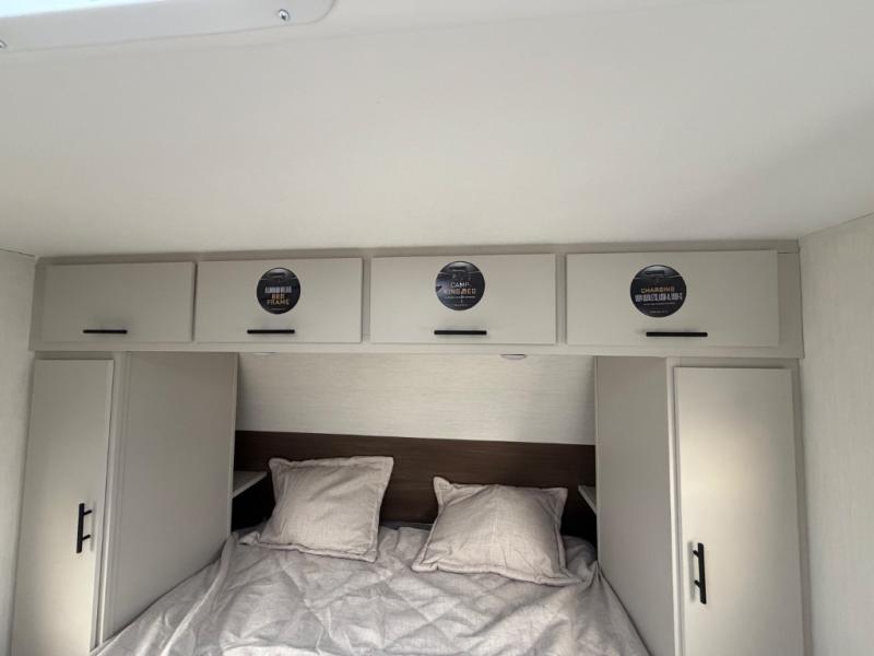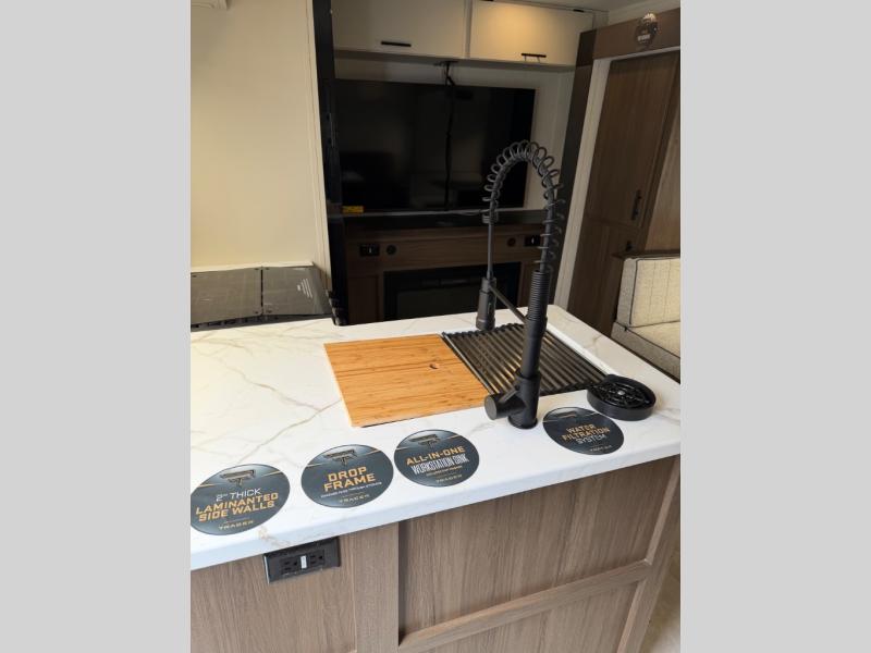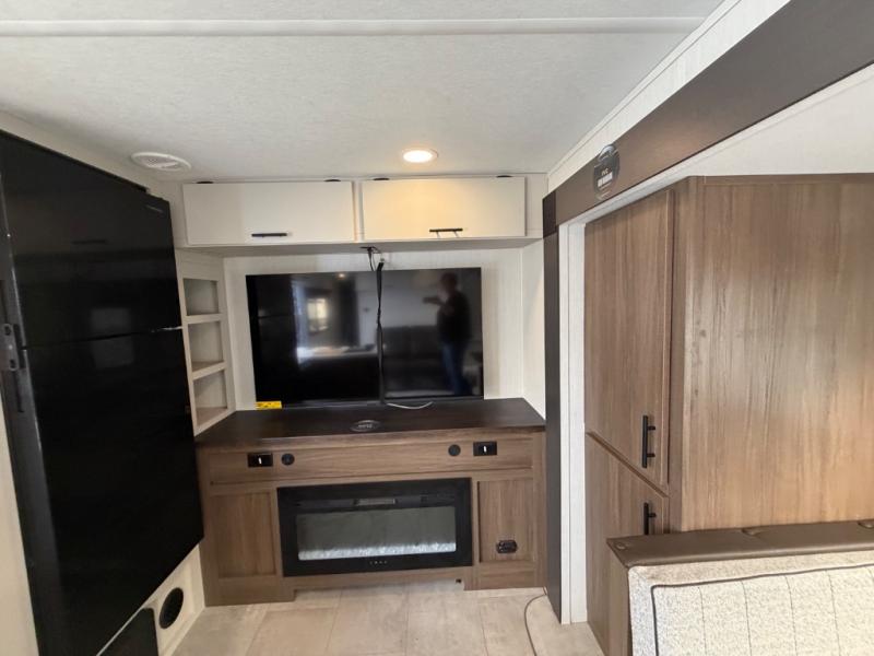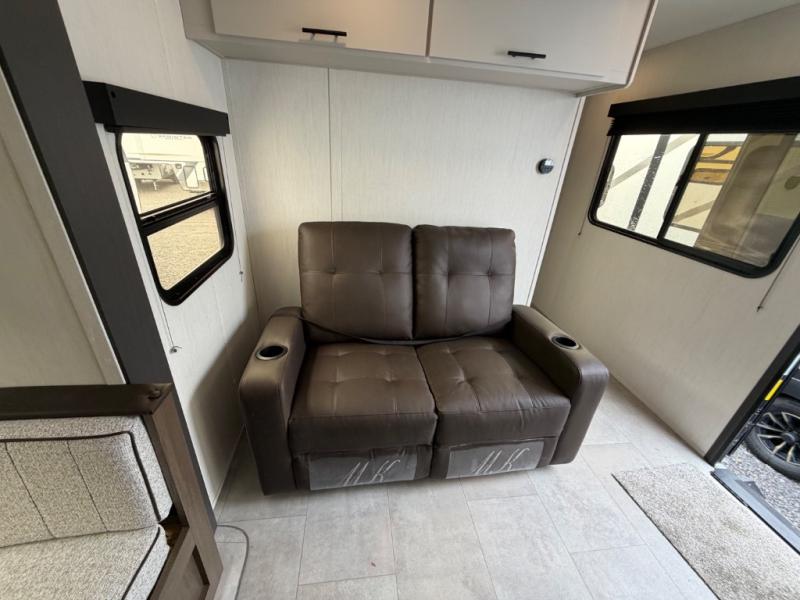 This travel trailer's modern rear kitchen is equipped with a reliable fridge, well-stocked pantry, and even a fireplace, making meal prep and cooking a great experience. The theater seating offers a cozy spot to unwind, while the dinette is perfect for sharing meals or stories with loved ones. The air fryer cooktop will also be useful for some easy delicious meals on the go, and the practical full bathroom to freshen up. The serene front bedroom is a peaceful retreat, featuring a comfortable camp king bed, spacious wardrobes, and ample overhead cabinets for storing your essentials.