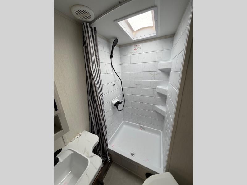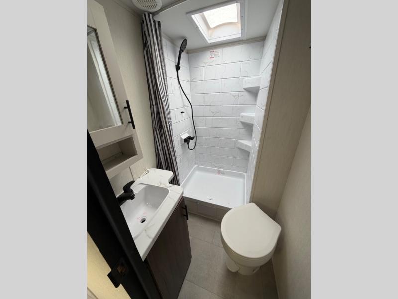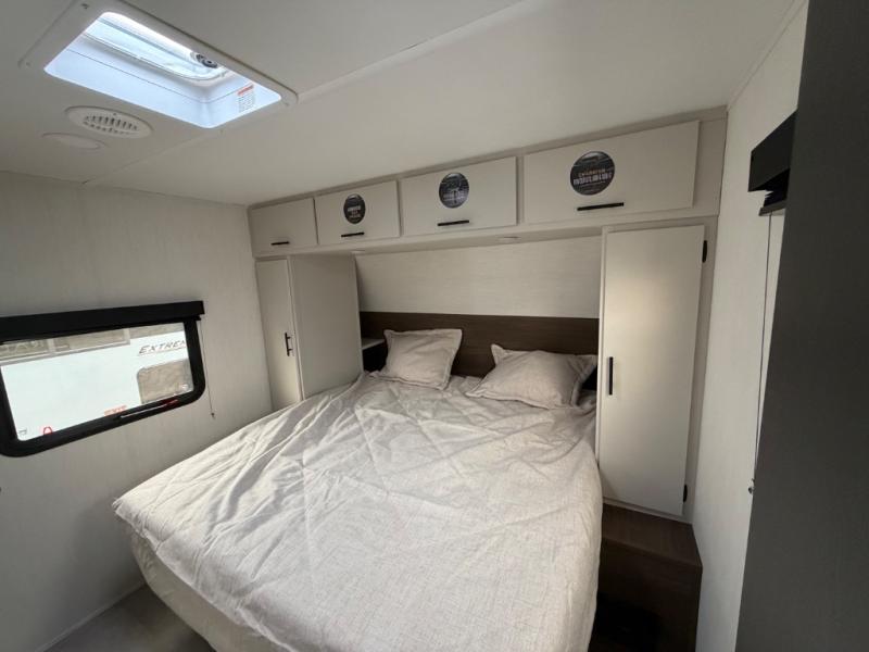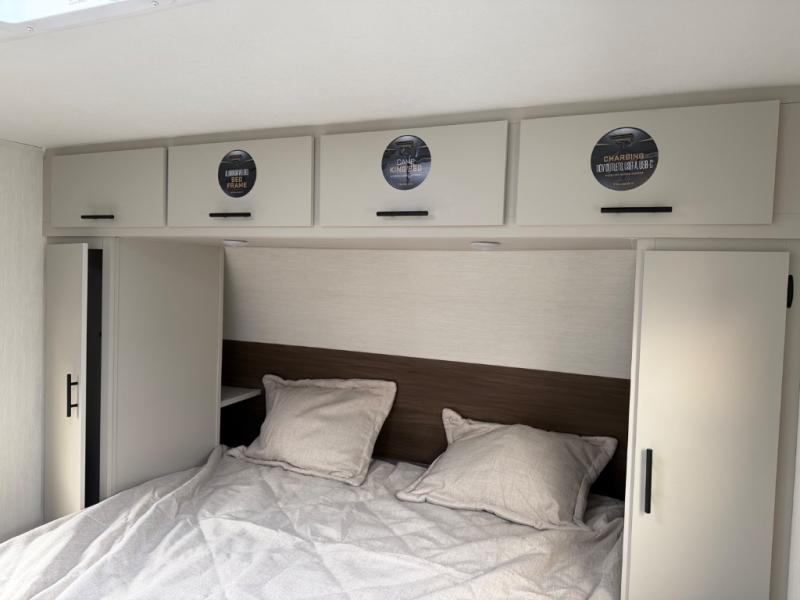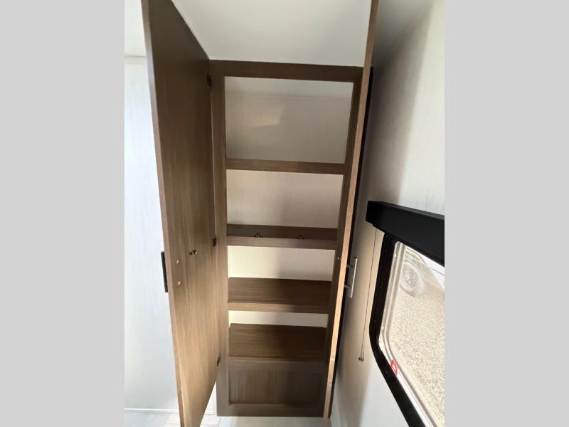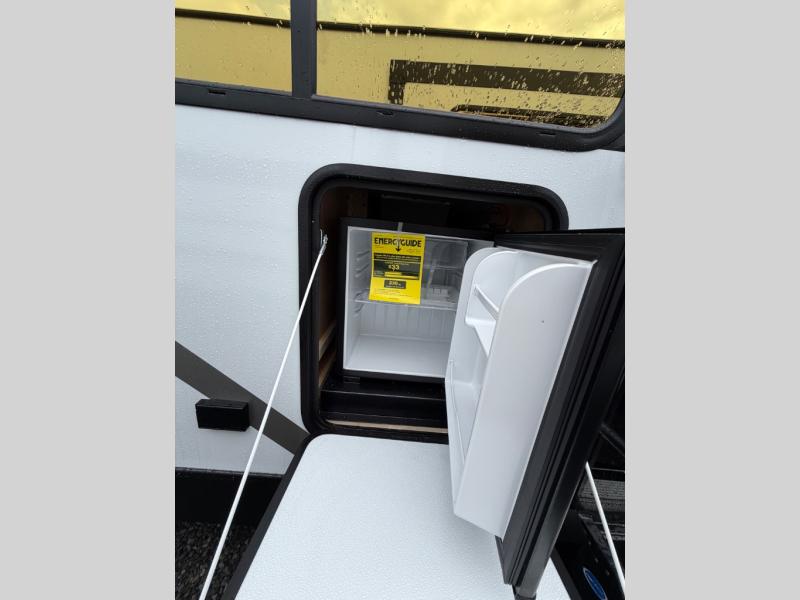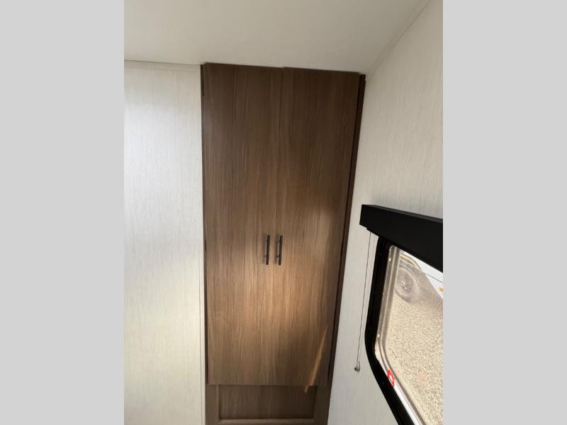 This travel trailer's modern rear kitchen is equipped with a reliable fridge, well-stocked pantry, and even a fireplace, making meal prep and cooking a great experience. The theater seating offers a cozy spot to unwind, while the dinette is perfect for sharing meals or stories with loved ones. The air fryer cooktop will also be useful for some easy delicious meals on the go, and the practical full bathroom to freshen up. The serene front bedroom is a peaceful retreat, featuring a comfortable camp king bed, spacious wardrobes, and ample overhead cabinets for storing your essentials.