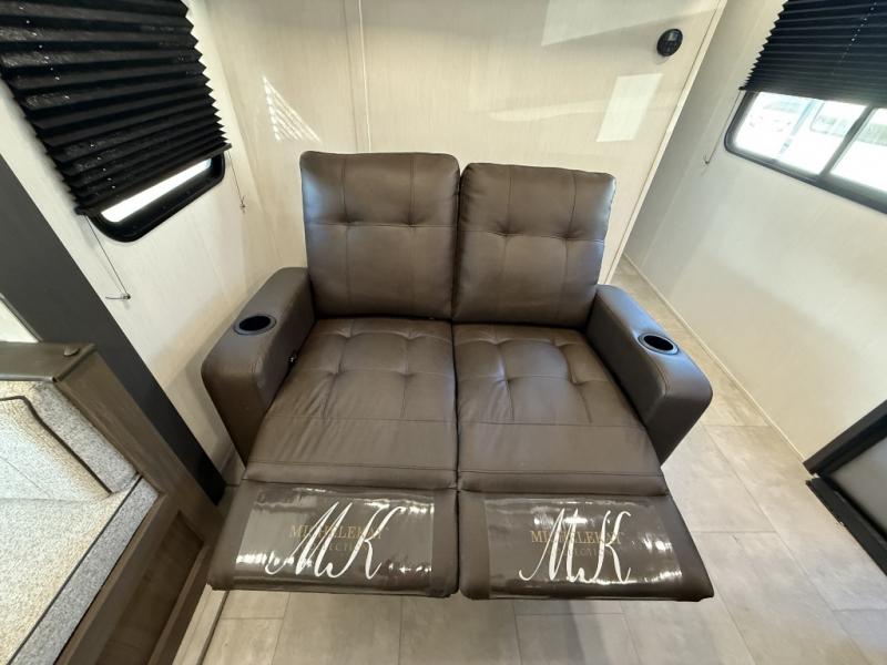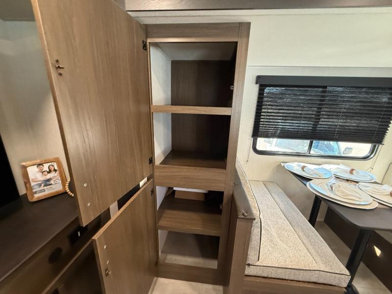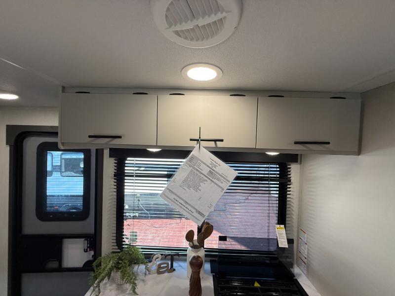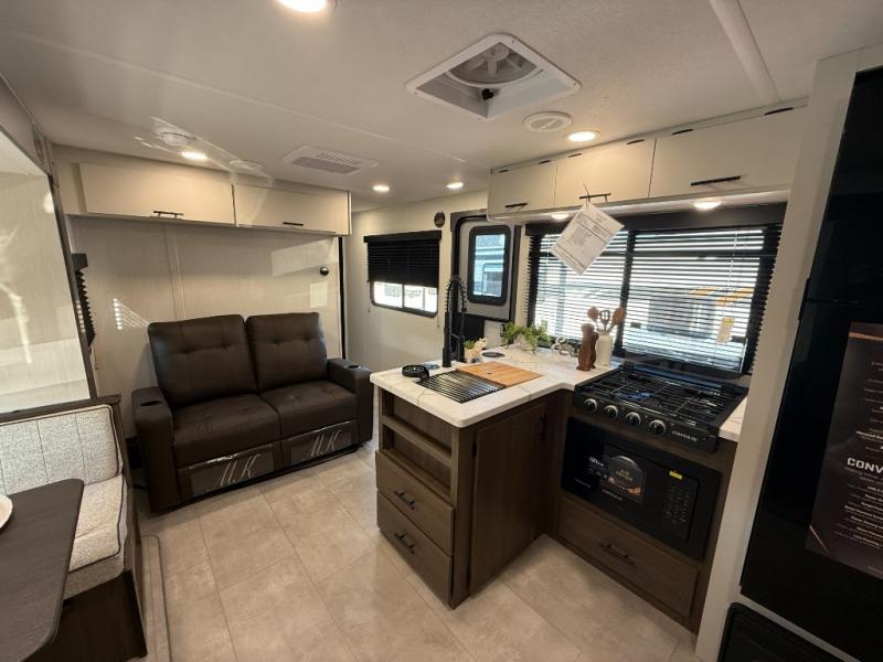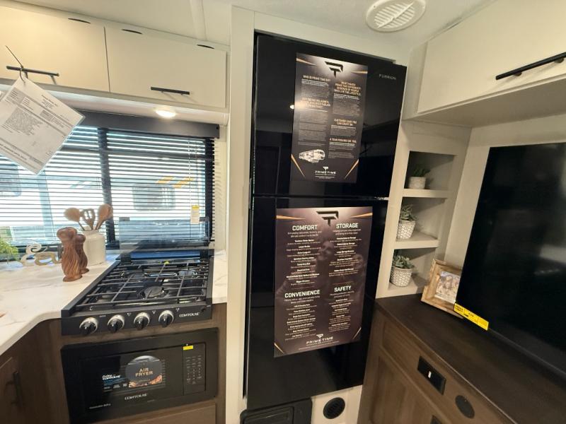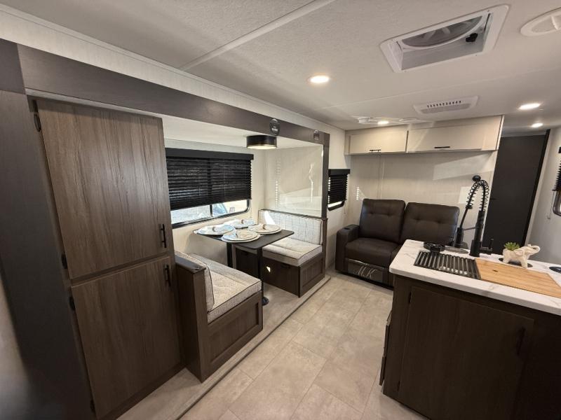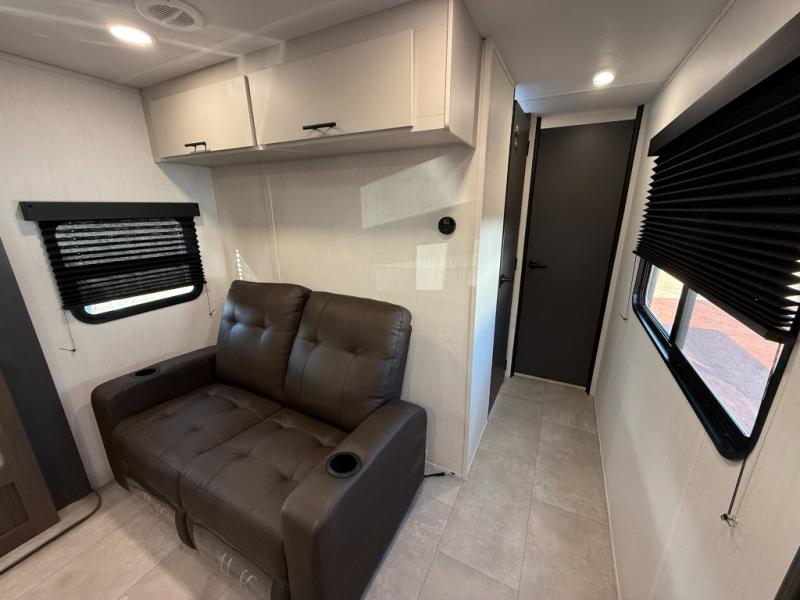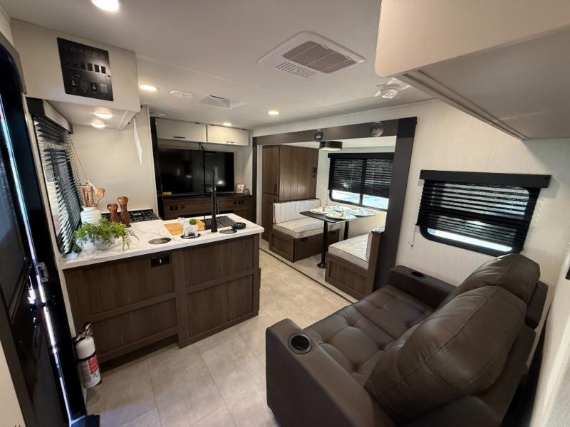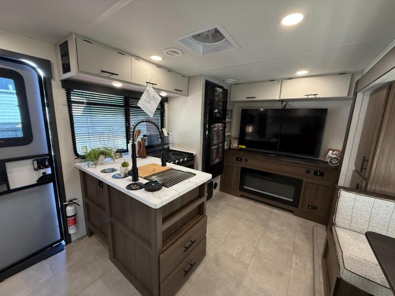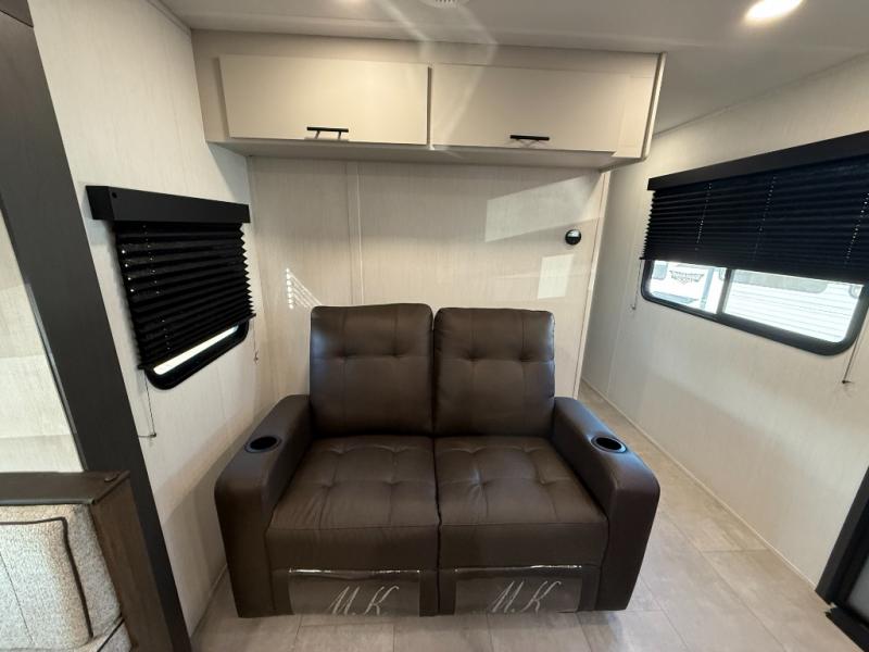 This travel trailer's modern rear kitchen is equipped with a reliable fridge, well-stocked pantry, and even a fireplace, making meal prep and cooking a great experience. The theater seating offers a cozy spot to unwind, while the dinette is perfect for sharing meals or stories with loved ones. The air fryer cooktop will also be useful for some easy delicious meals on the go, and the practical full bathroom to freshen up. The serene front bedroom is a peaceful retreat, featuring a comfortable camp king bed, spacious wardrobes, and ample overhead cabinets for storing your essentials.