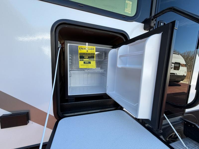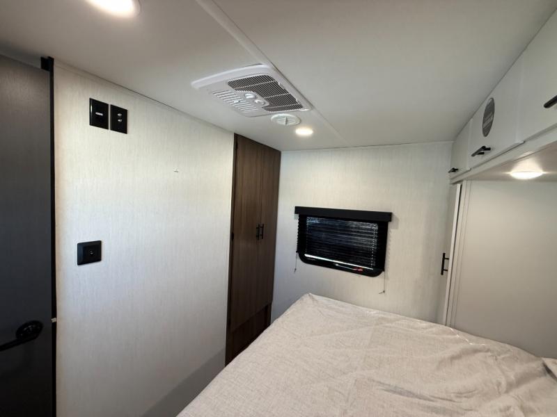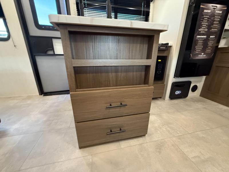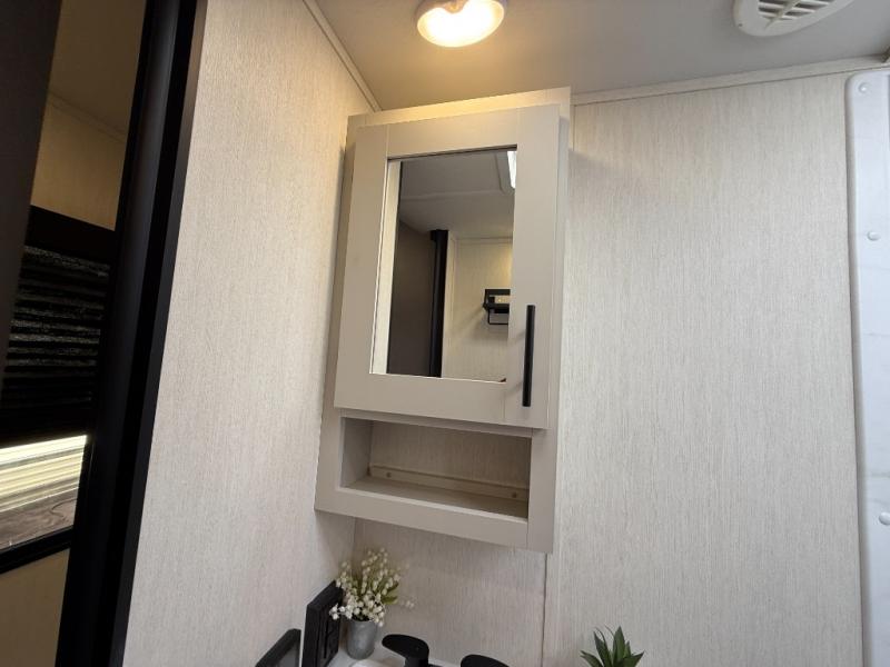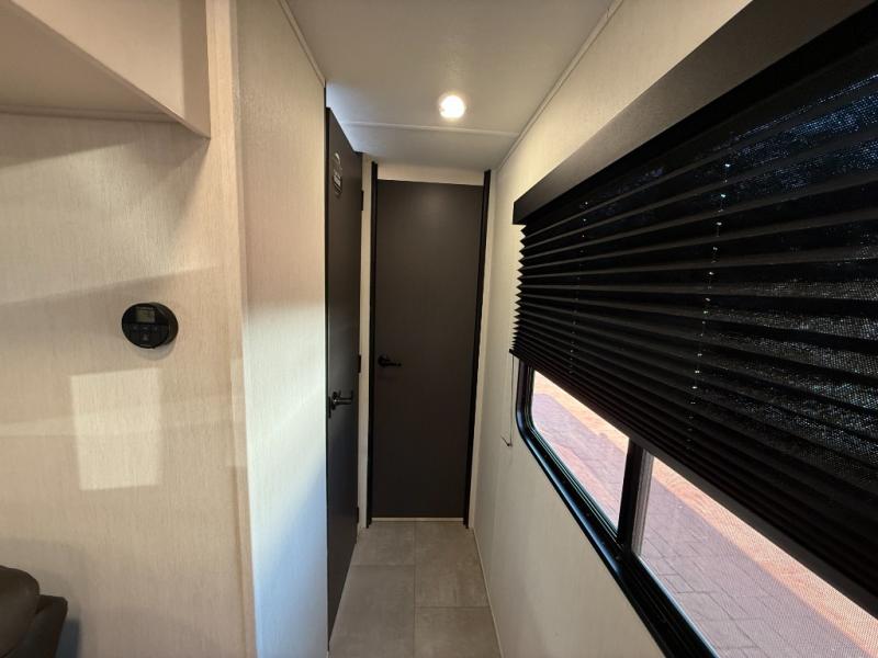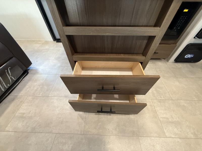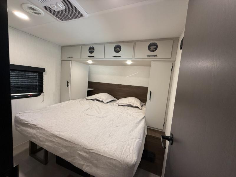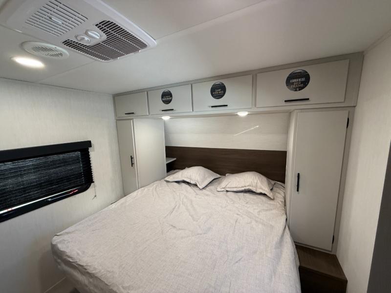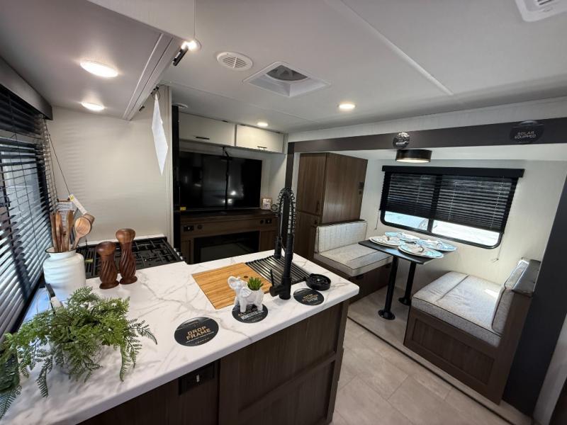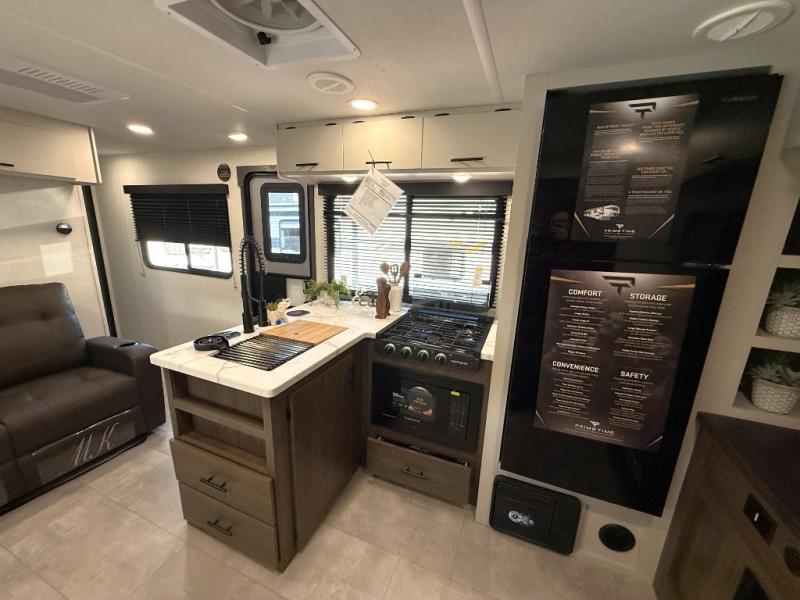 This travel trailer's modern rear kitchen is equipped with a reliable fridge, well-stocked pantry, and even a fireplace, making meal prep and cooking a great experience. The theater seating offers a cozy spot to unwind, while the dinette is perfect for sharing meals or stories with loved ones. The air fryer cooktop will also be useful for some easy delicious meals on the go, and the practical full bathroom to freshen up. The serene front bedroom is a peaceful retreat, featuring a comfortable camp king bed, spacious wardrobes, and ample overhead cabinets for storing your essentials.