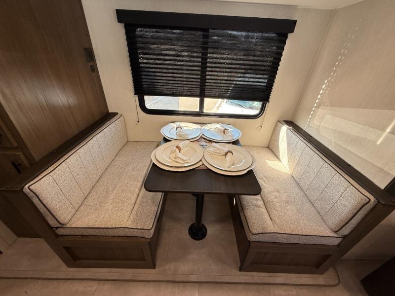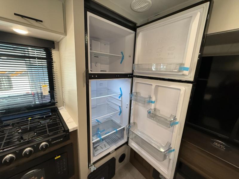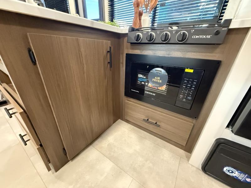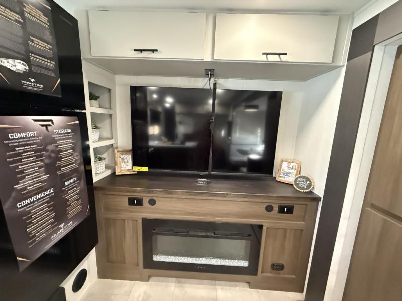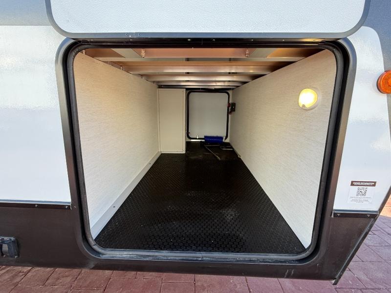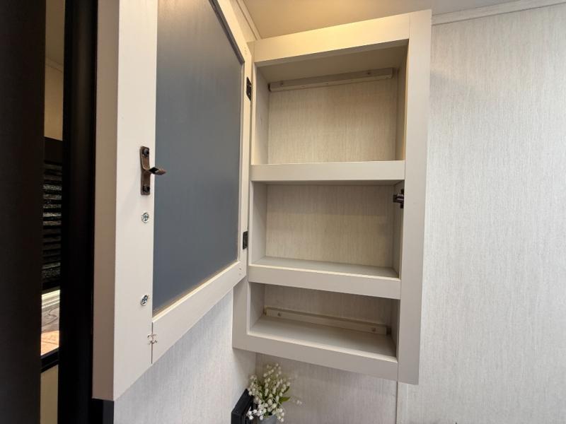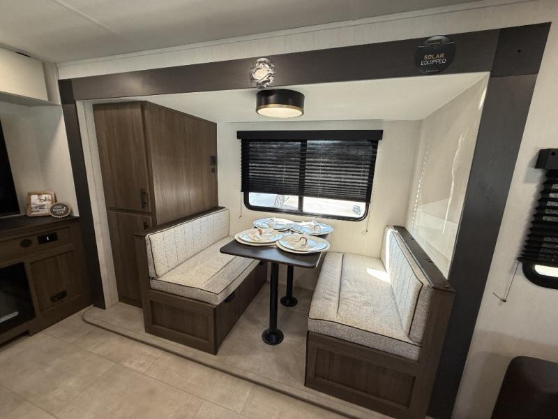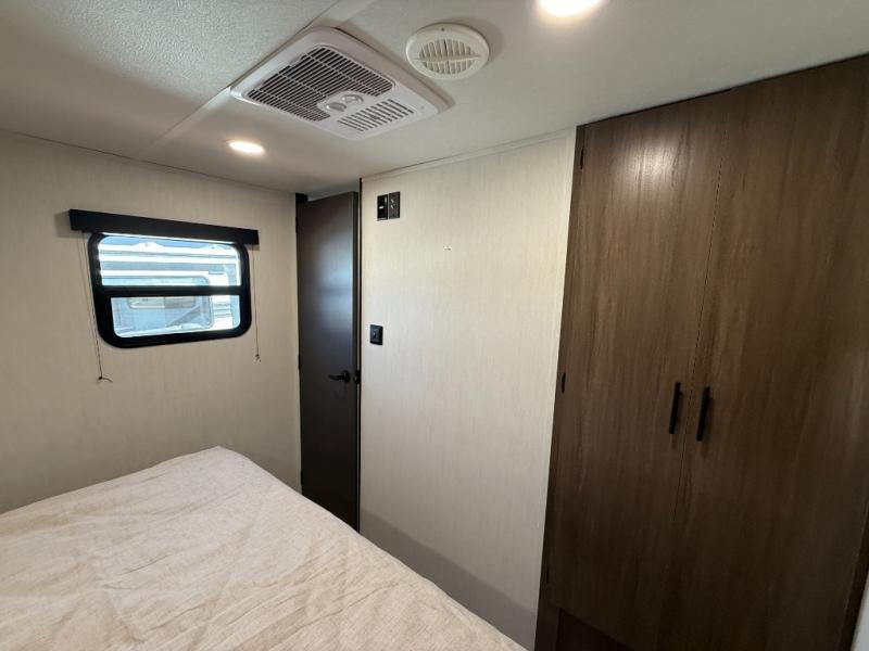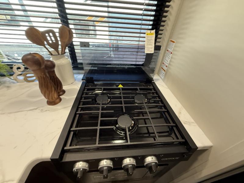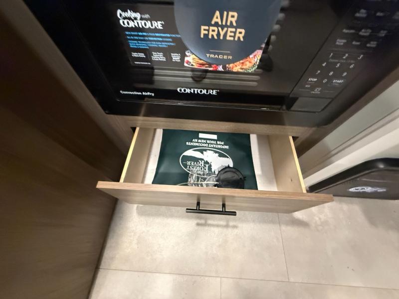 This travel trailer's modern rear kitchen is equipped with a reliable fridge, well-stocked pantry, and even a fireplace, making meal prep and cooking a great experience. The theater seating offers a cozy spot to unwind, while the dinette is perfect for sharing meals or stories with loved ones. The air fryer cooktop will also be useful for some easy delicious meals on the go, and the practical full bathroom to freshen up. The serene front bedroom is a peaceful retreat, featuring a comfortable camp king bed, spacious wardrobes, and ample overhead cabinets for storing your essentials.