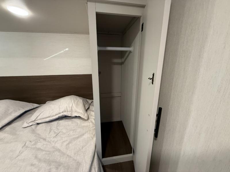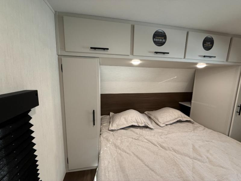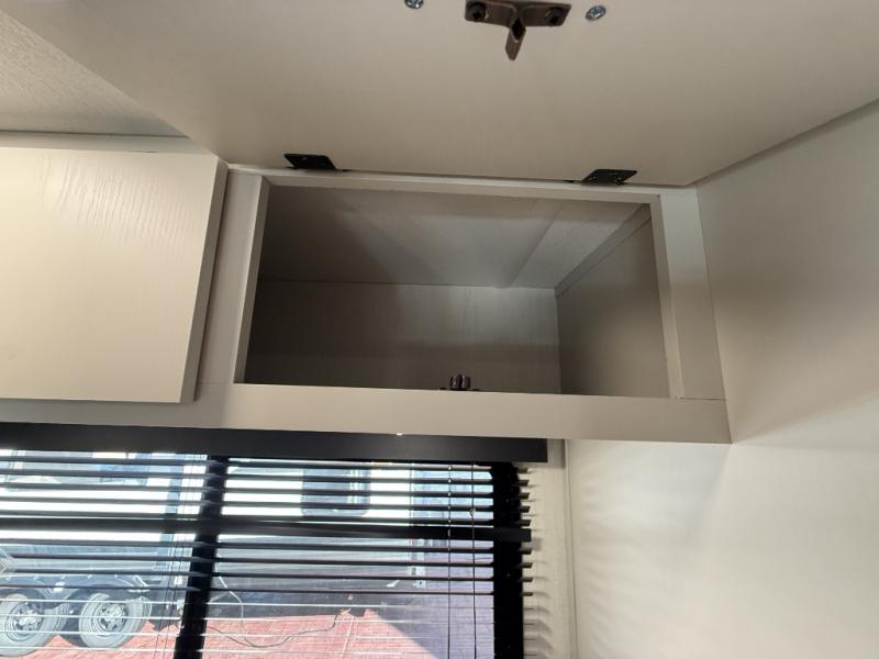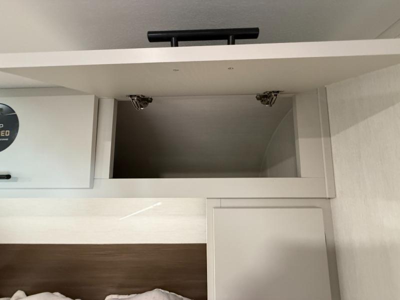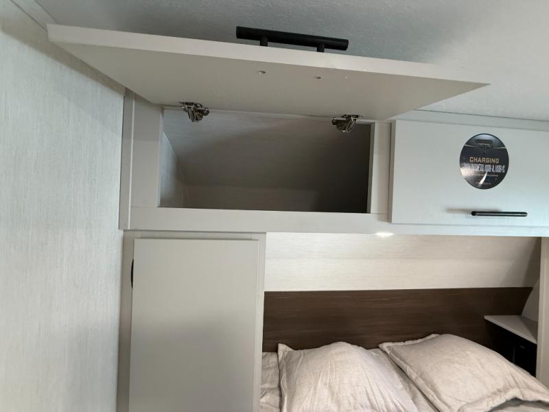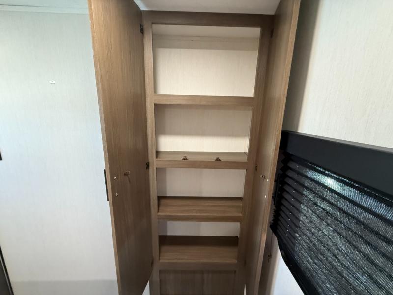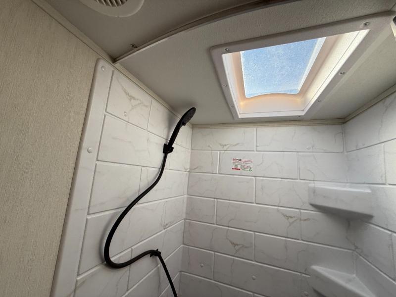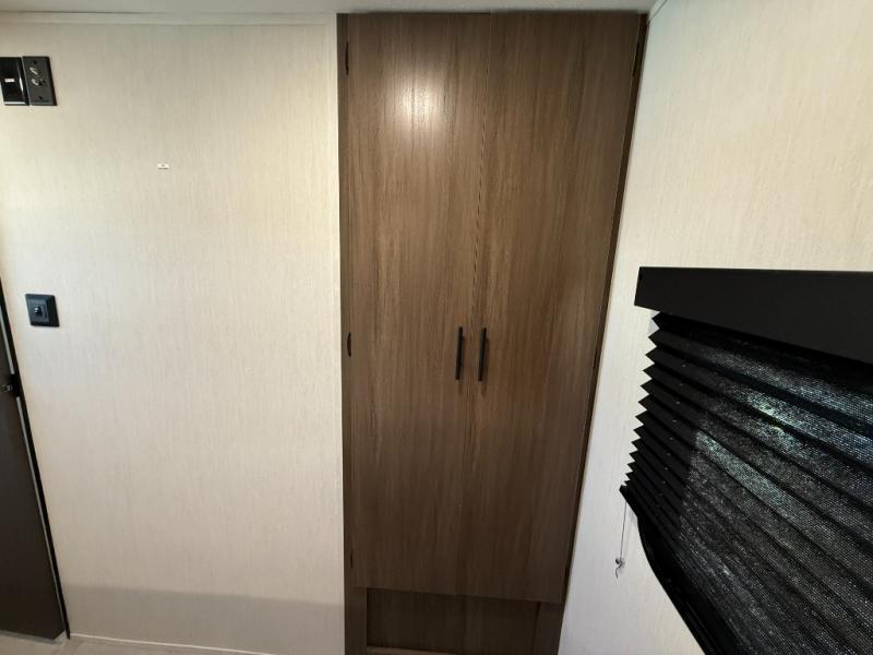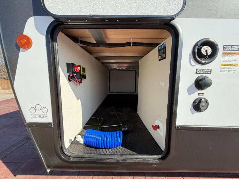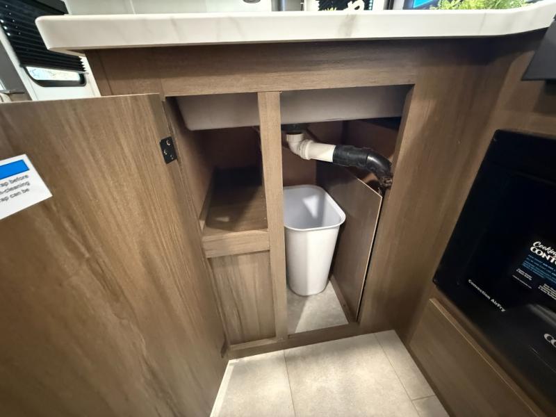 This travel trailer's modern rear kitchen is equipped with a reliable fridge, well-stocked pantry, and even a fireplace, making meal prep and cooking a great experience. The theater seating offers a cozy spot to unwind, while the dinette is perfect for sharing meals or stories with loved ones. The air fryer cooktop will also be useful for some easy delicious meals on the go, and the practical full bathroom to freshen up. The serene front bedroom is a peaceful retreat, featuring a comfortable camp king bed, spacious wardrobes, and ample overhead cabinets for storing your essentials.
