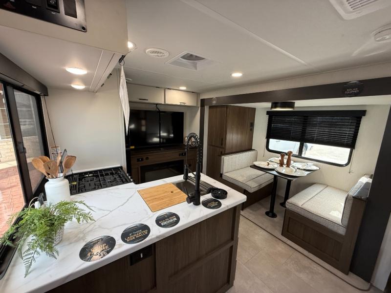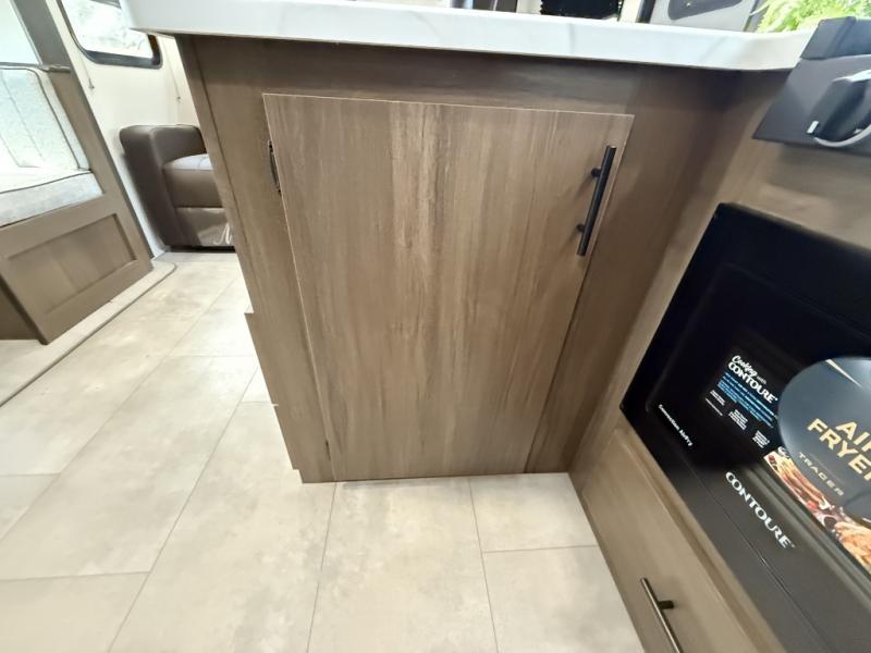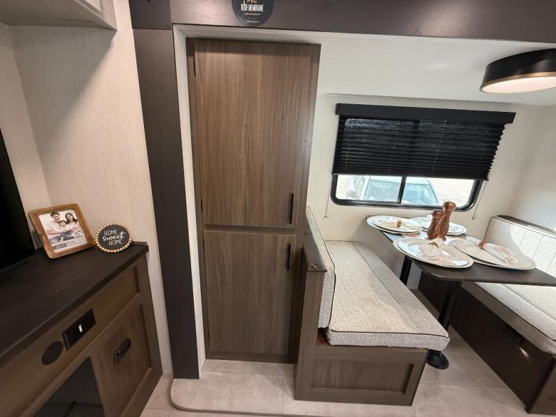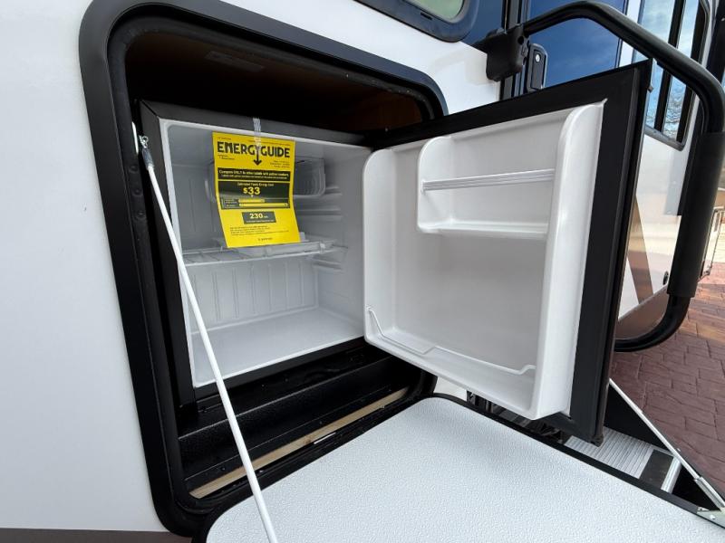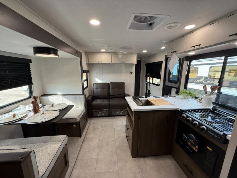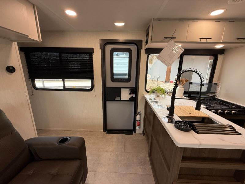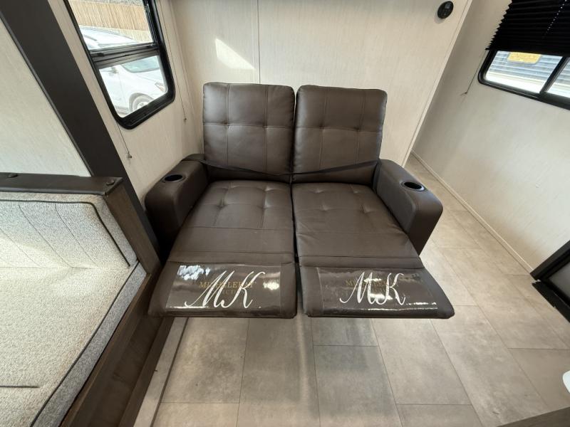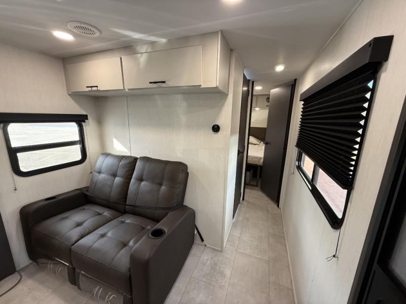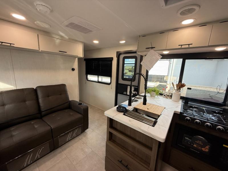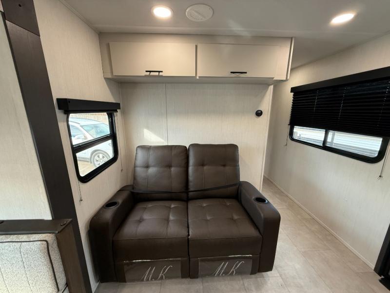 This travel trailer's modern rear kitchen is equipped with a reliable fridge, well-stocked pantry, and even a fireplace, making meal prep and cooking a great experience. The theater seating offers a cozy spot to unwind, while the dinette is perfect for sharing meals or stories with loved ones. The air fryer cooktop will also be useful for some easy delicious meals on the go, and the practical full bathroom to freshen up. The serene front bedroom is a peaceful retreat, featuring a comfortable camp king bed, spacious wardrobes, and ample overhead cabinets for storing your essentials.