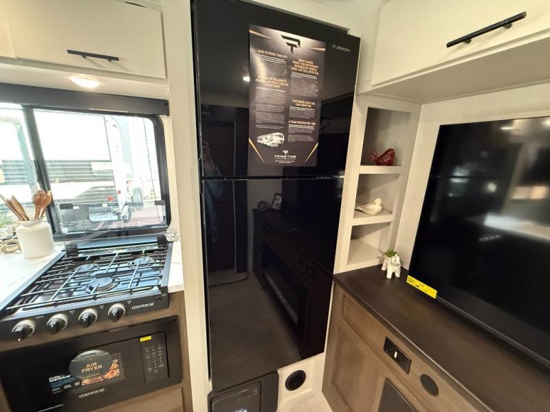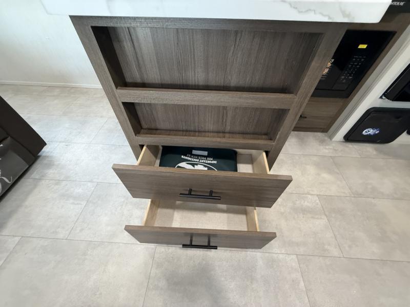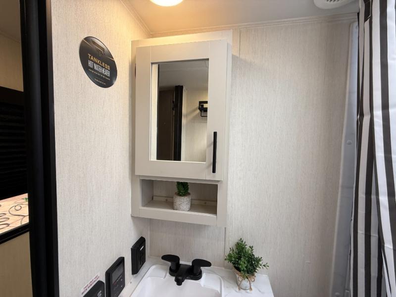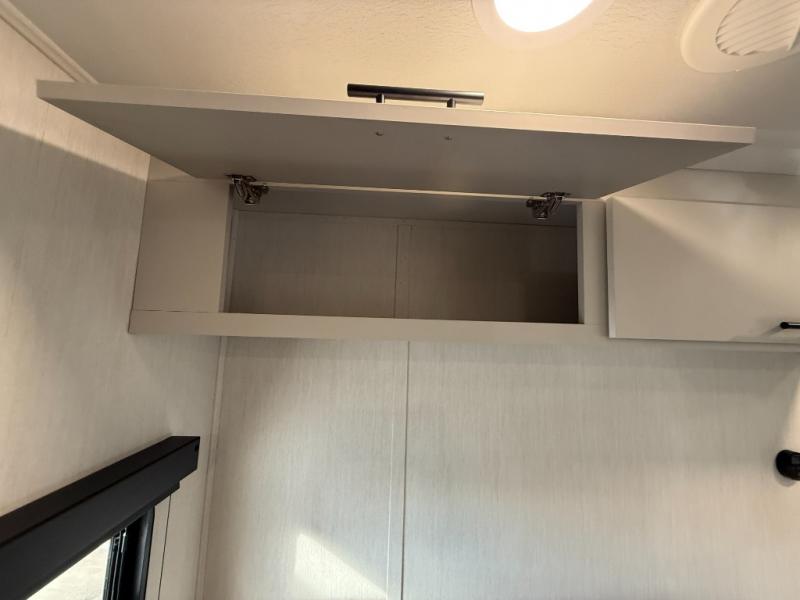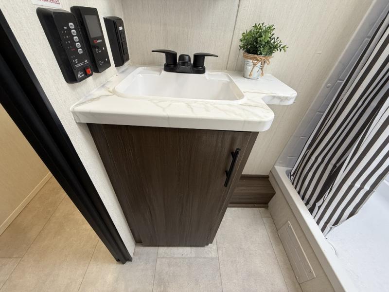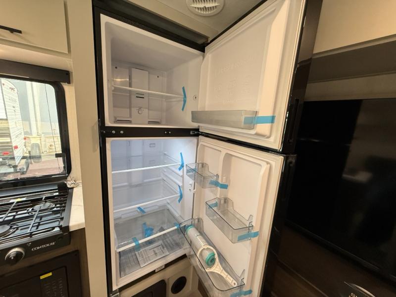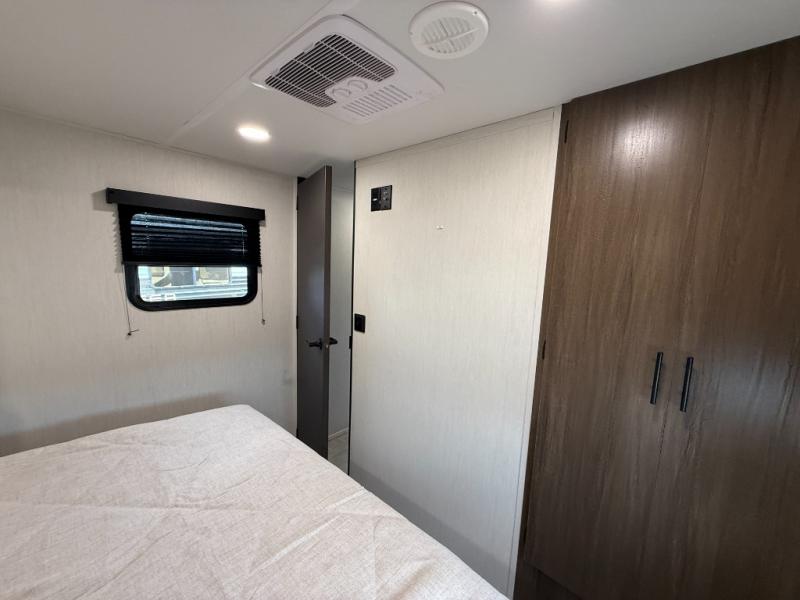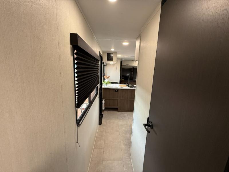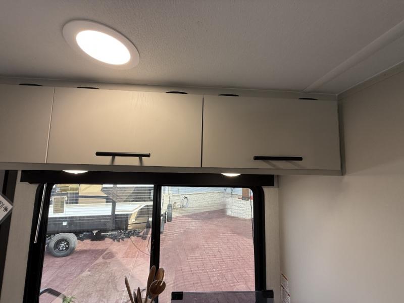 This travel trailer's modern rear kitchen is equipped with a reliable fridge, well-stocked pantry, and even a fireplace, making meal prep and cooking a great experience. The theater seating offers a cozy spot to unwind, while the dinette is perfect for sharing meals or stories with loved ones. The air fryer cooktop will also be useful for some easy delicious meals on the go, and the practical full bathroom to freshen up. The serene front bedroom is a peaceful retreat, featuring a comfortable camp king bed, spacious wardrobes, and ample overhead cabinets for storing your essentials.