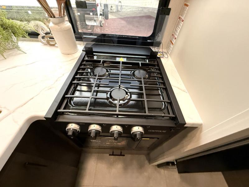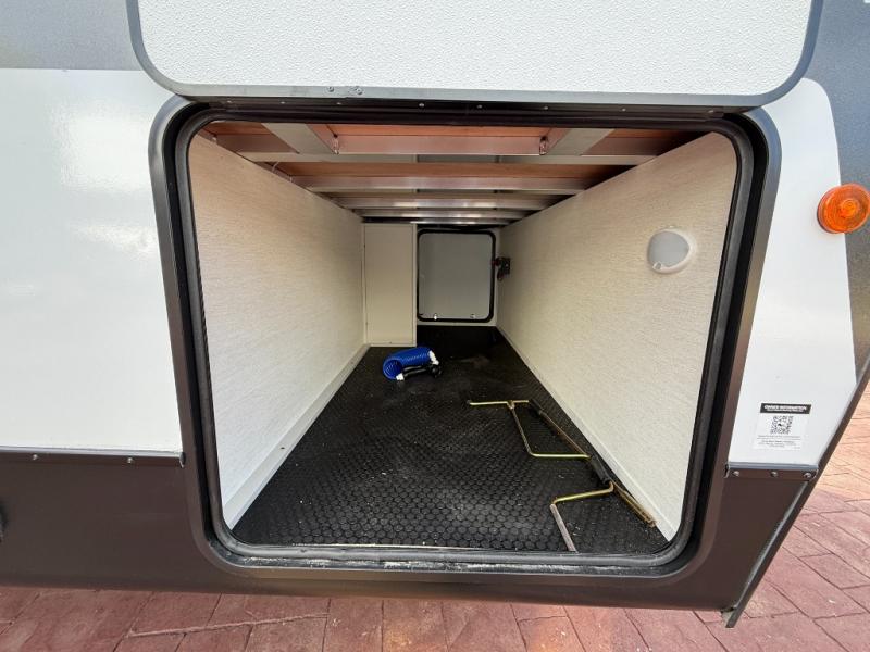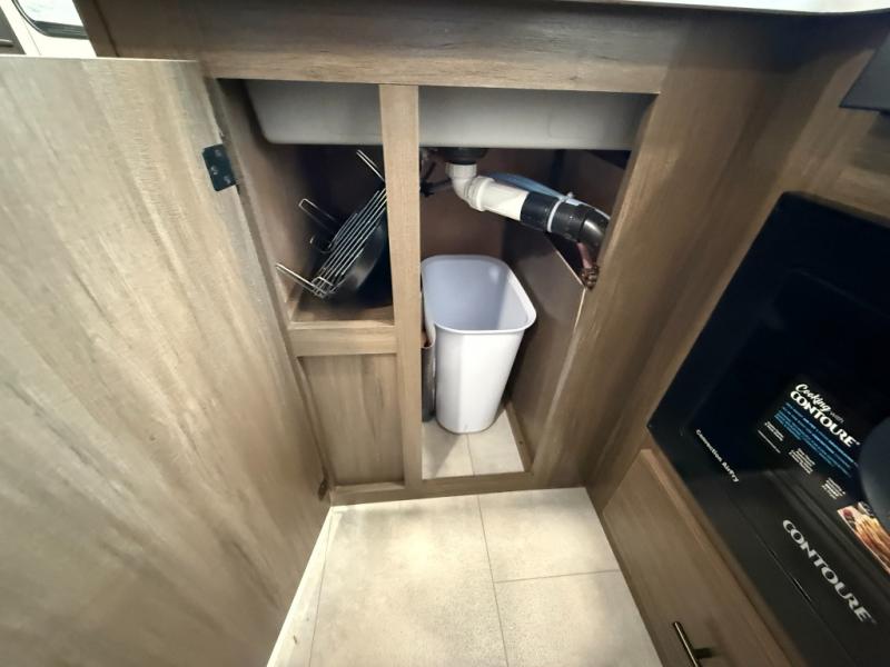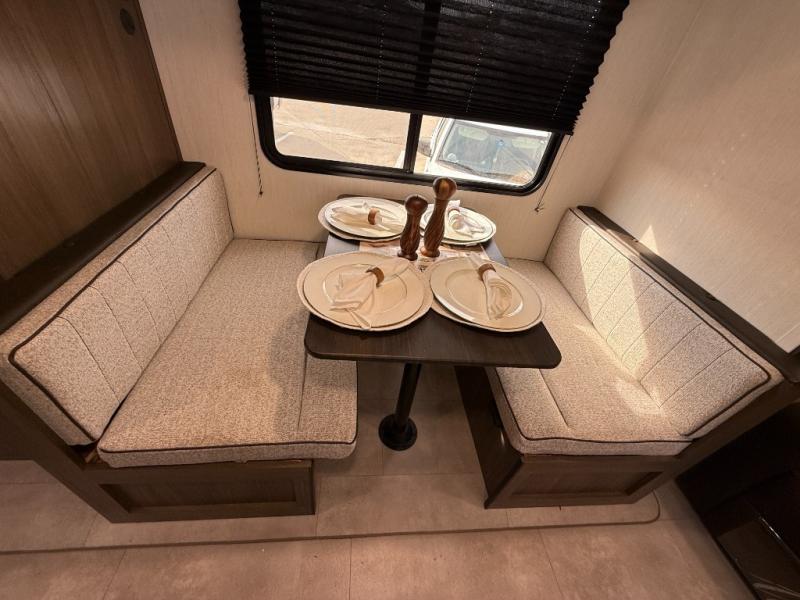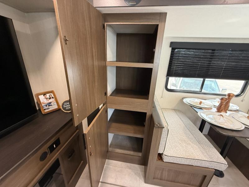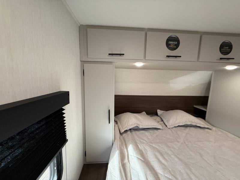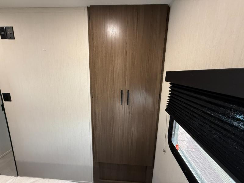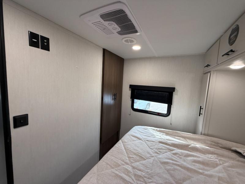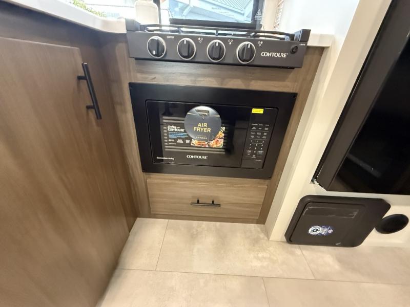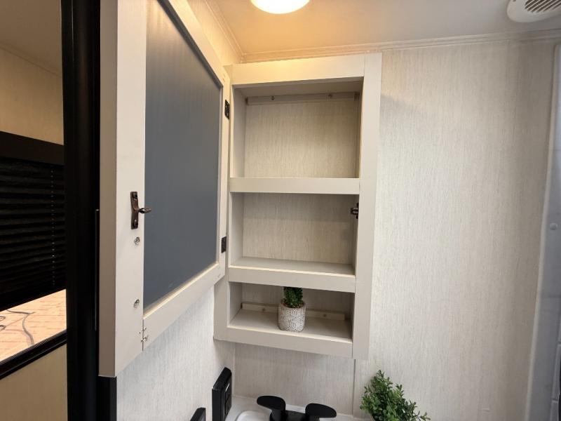 This travel trailer's modern rear kitchen is equipped with a reliable fridge, well-stocked pantry, and even a fireplace, making meal prep and cooking a great experience. The theater seating offers a cozy spot to unwind, while the dinette is perfect for sharing meals or stories with loved ones. The air fryer cooktop will also be useful for some easy delicious meals on the go, and the practical full bathroom to freshen up. The serene front bedroom is a peaceful retreat, featuring a comfortable camp king bed, spacious wardrobes, and ample overhead cabinets for storing your essentials.