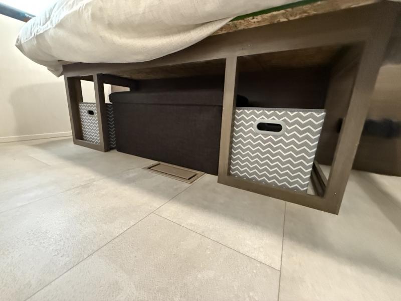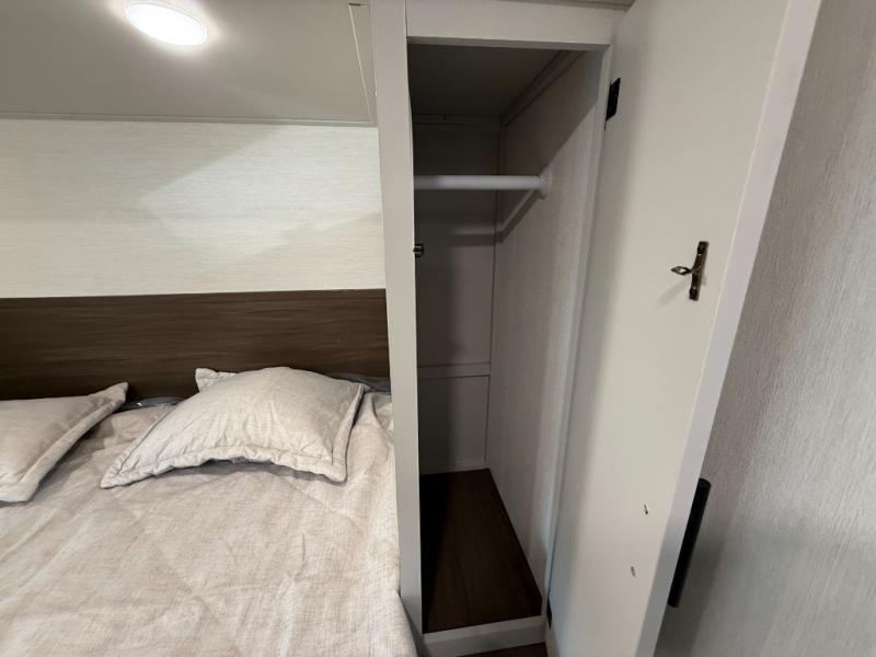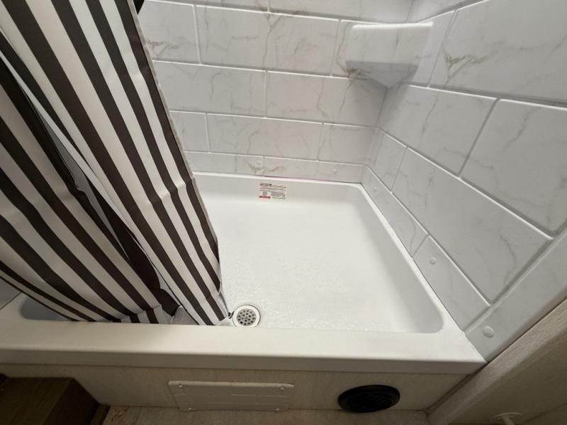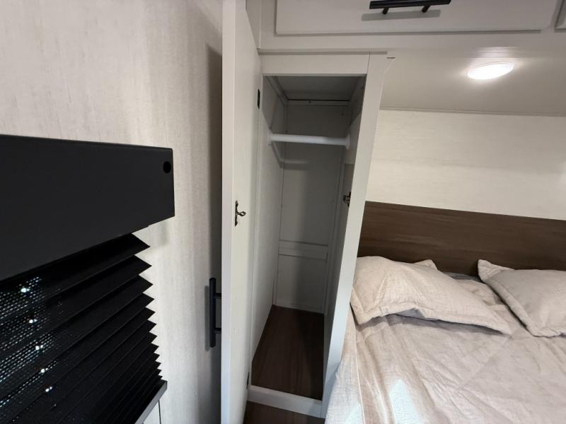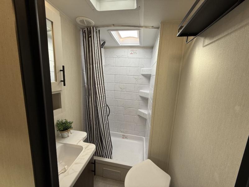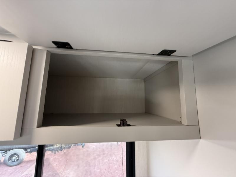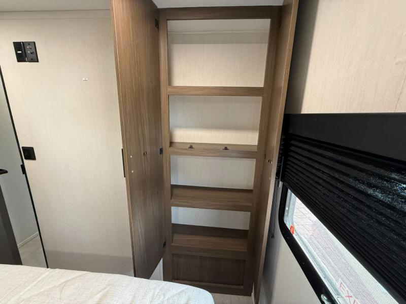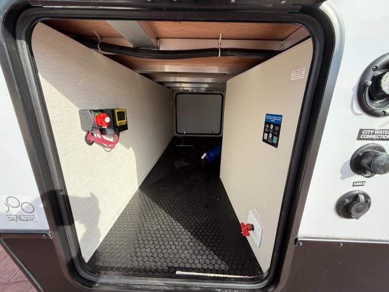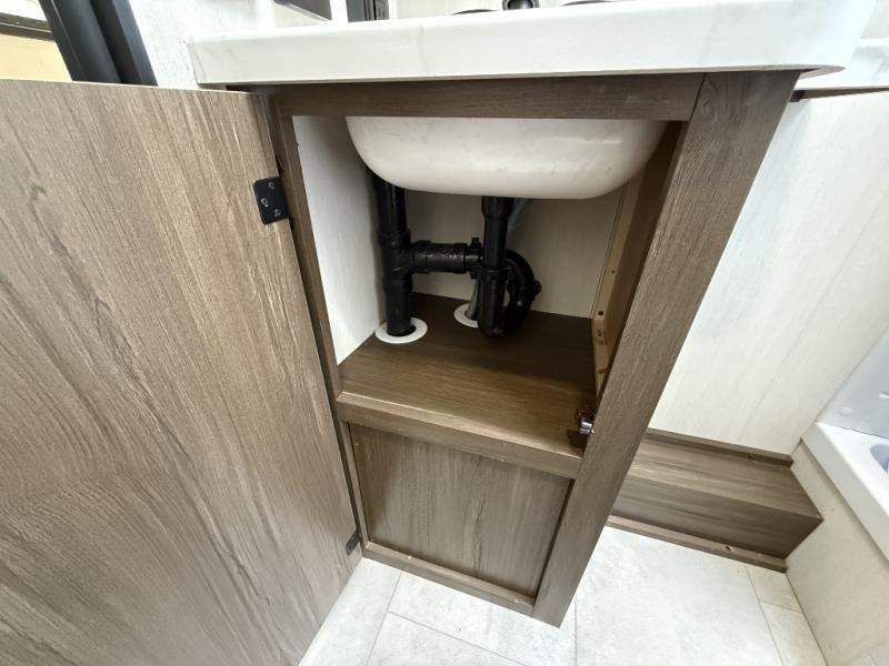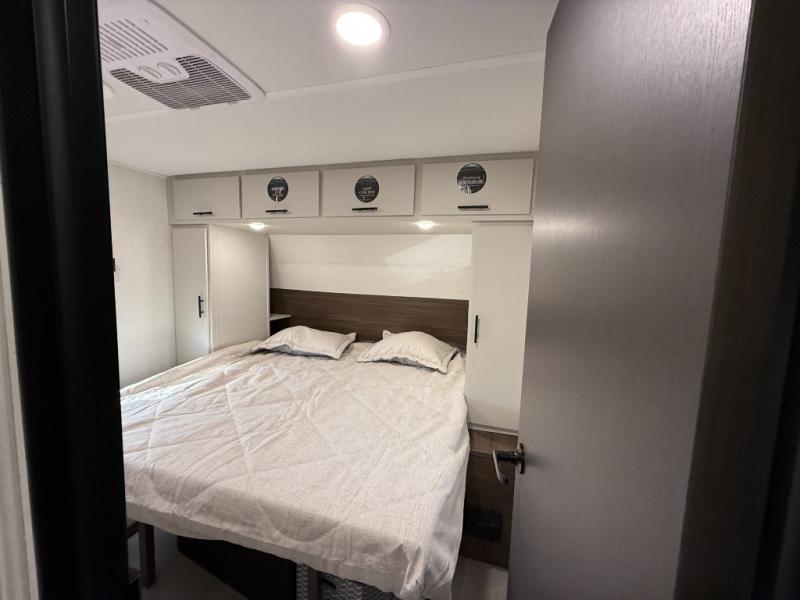 This travel trailer's modern rear kitchen is equipped with a reliable fridge, well-stocked pantry, and even a fireplace, making meal prep and cooking a great experience. The theater seating offers a cozy spot to unwind, while the dinette is perfect for sharing meals or stories with loved ones. The air fryer cooktop will also be useful for some easy delicious meals on the go, and the practical full bathroom to freshen up. The serene front bedroom is a peaceful retreat, featuring a comfortable camp king bed, spacious wardrobes, and ample overhead cabinets for storing your essentials.