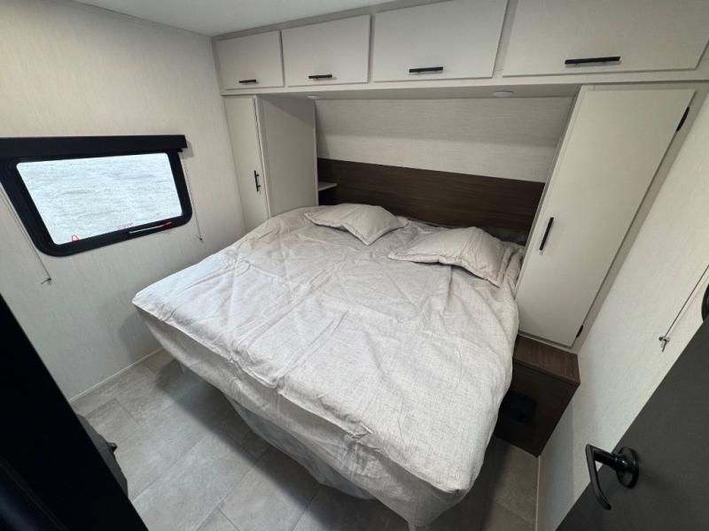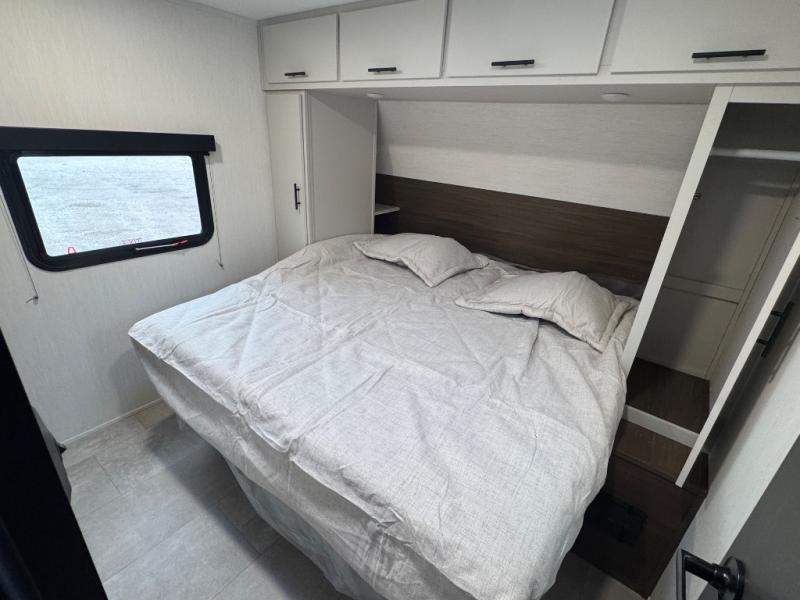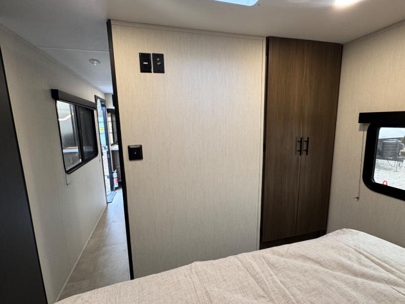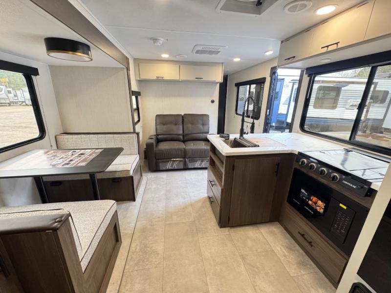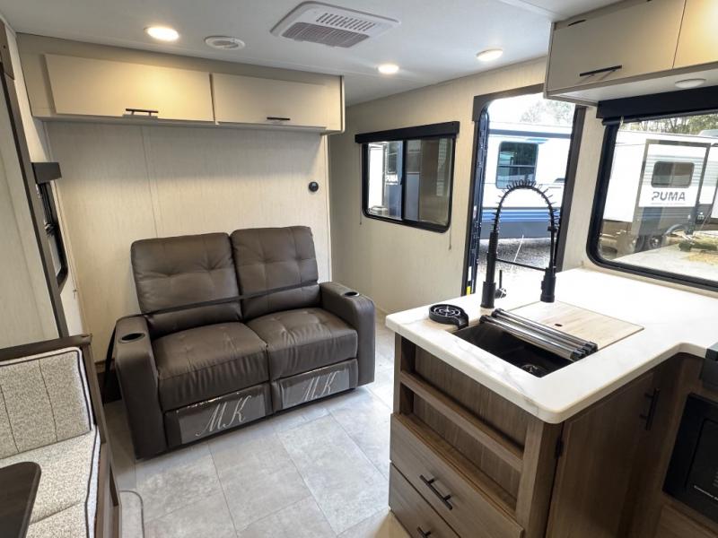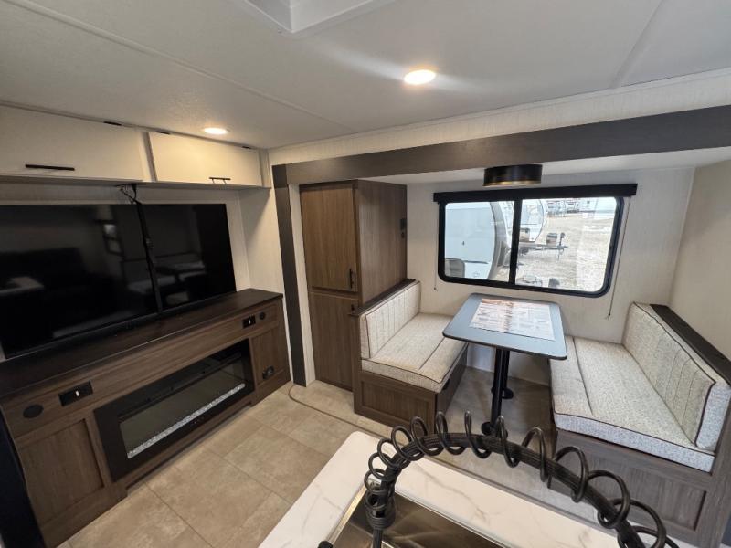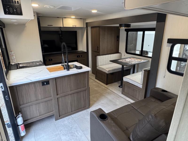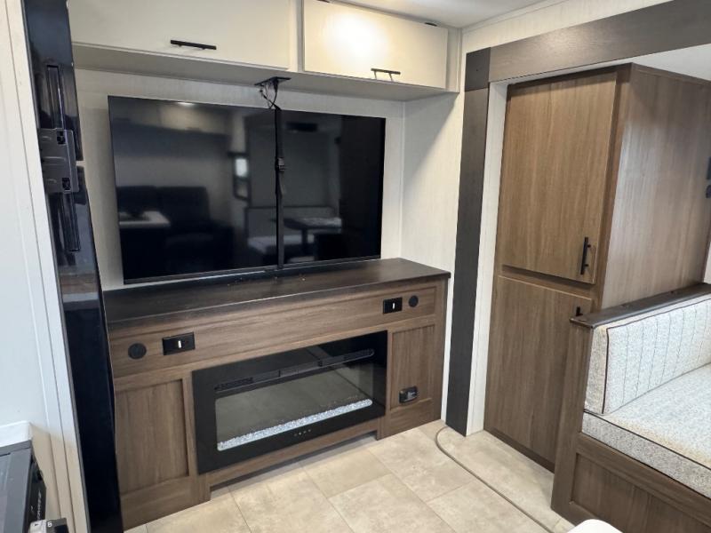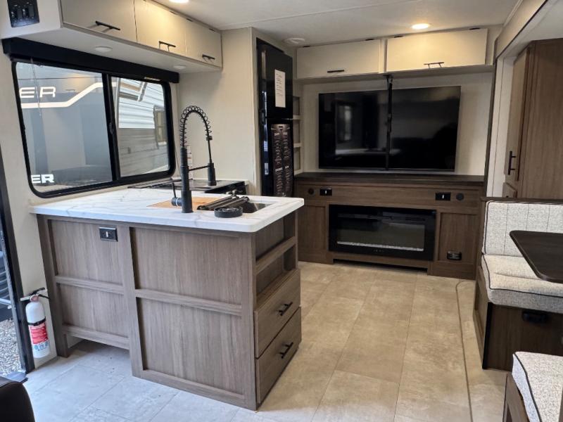 This travel trailer's modern rear kitchen is equipped with a reliable fridge, well-stocked pantry, and even a fireplace, making meal prep and cooking a great experience. The theater seating offers a cozy spot to unwind, while the dinette is perfect for sharing meals or stories with loved ones. The air fryer cooktop will also be useful for some easy delicious meals on the go, and the practical full bathroom to freshen up. The serene front bedroom is a peaceful retreat, featuring a comfortable camp king bed, spacious wardrobes, and ample overhead cabinets for storing your essentials.